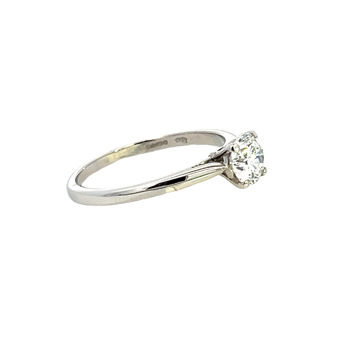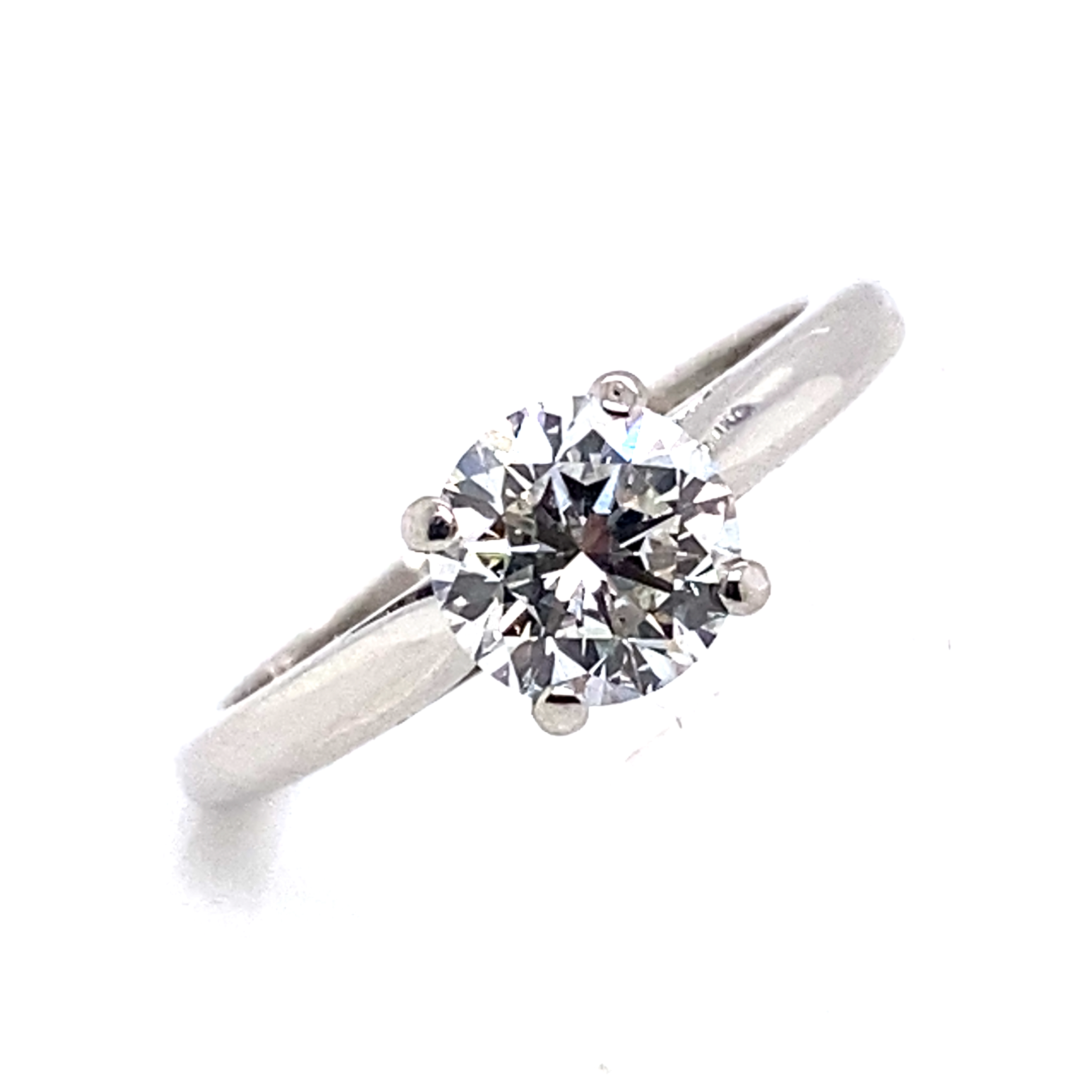 A modern platinum and diamond Single Stone Engagement ring from our Revival Collection. Features a modern round brilliant diamond in a four claw wed fit style setting weighing 0.90 carats of G colour Si Clarity. The ring has been serviced and checked in our workshop and is 'as new' apart from minor wear to the underside of the setting head where this ring has been sat next to another ring. Finiger size J.