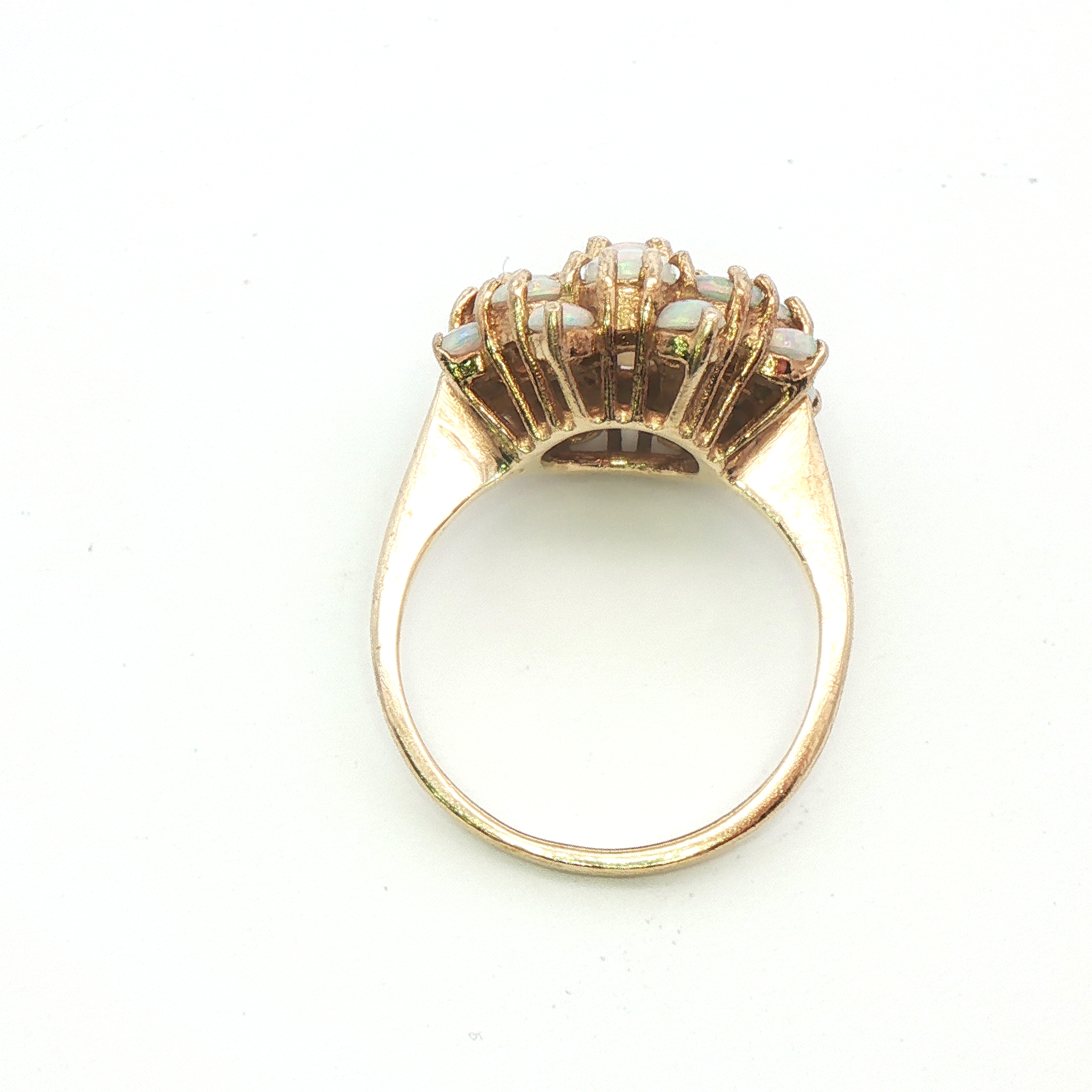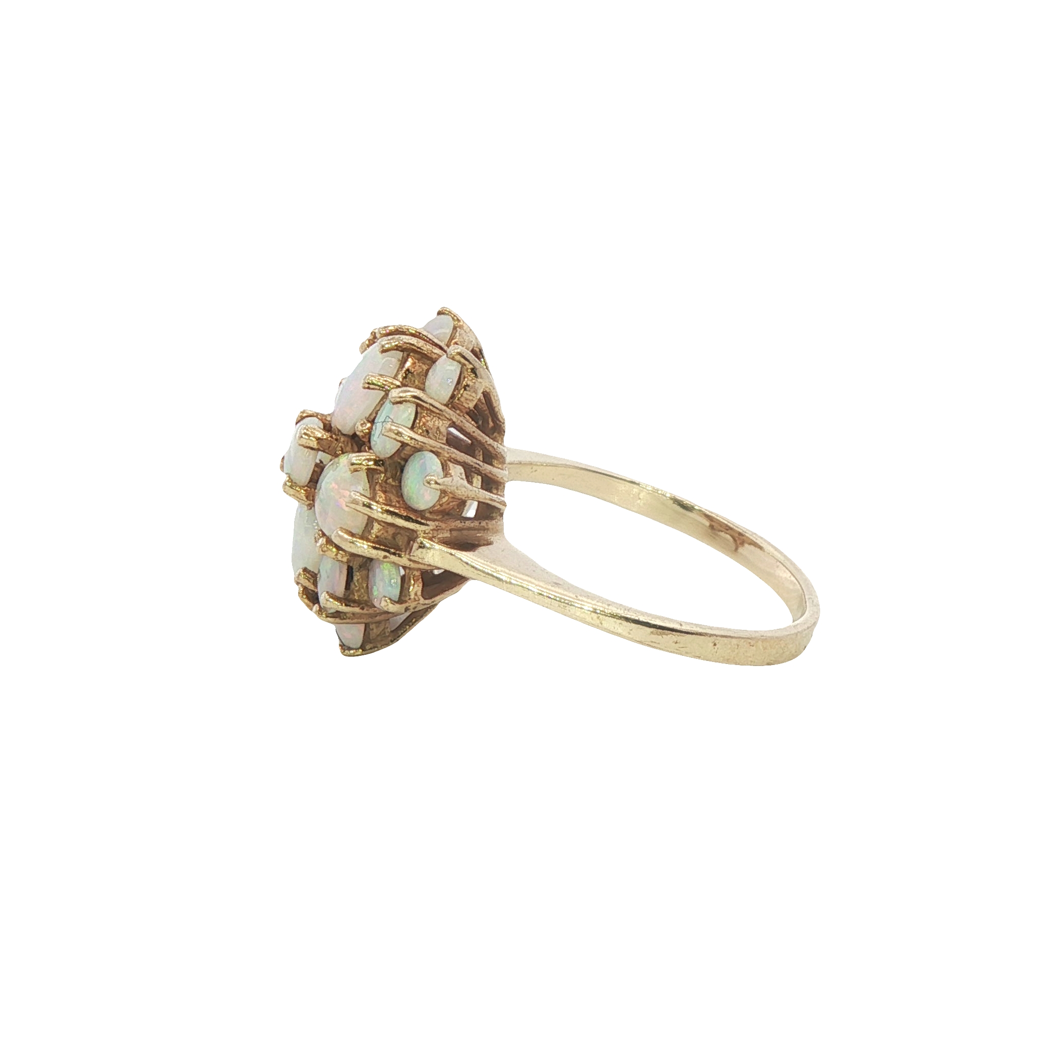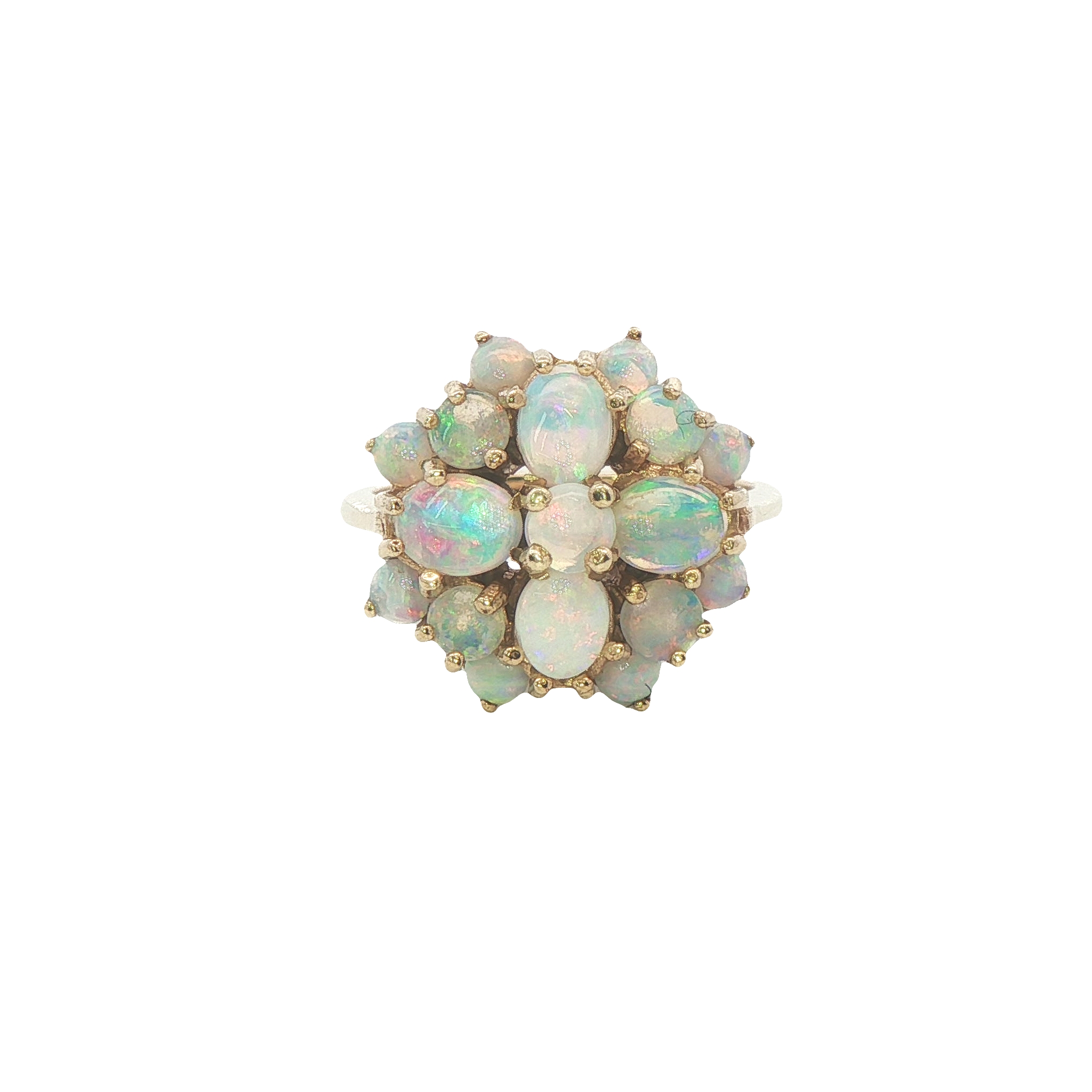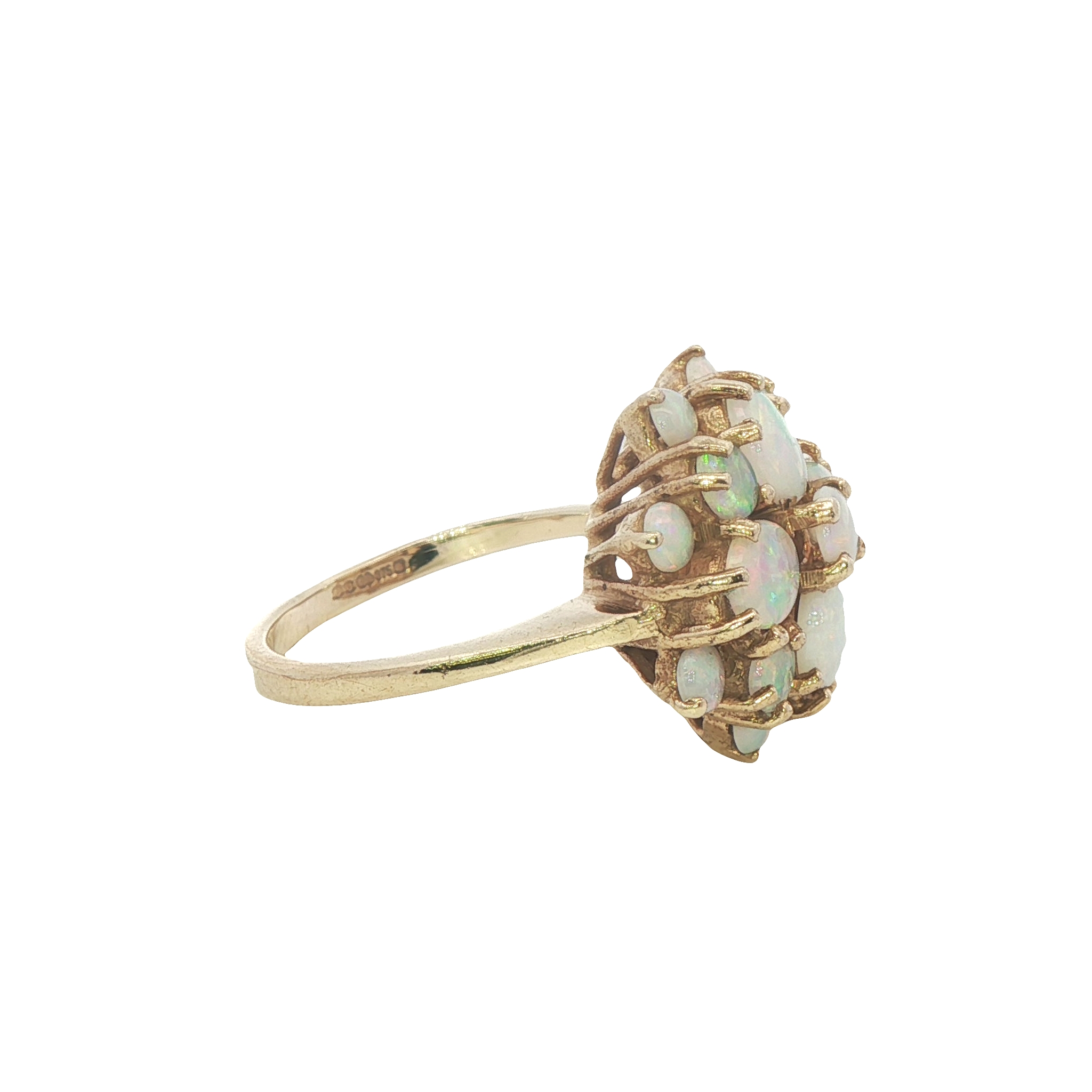 A 9ct yellow gold beautiful, colourful ring featuring a cluster of cabochon opals with an array of colours. This lovely vintage ring is the perfect cluster cocktail ring for opal lovers!