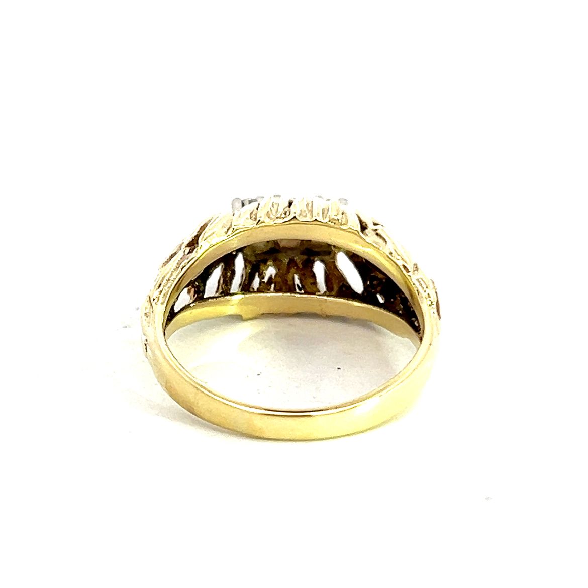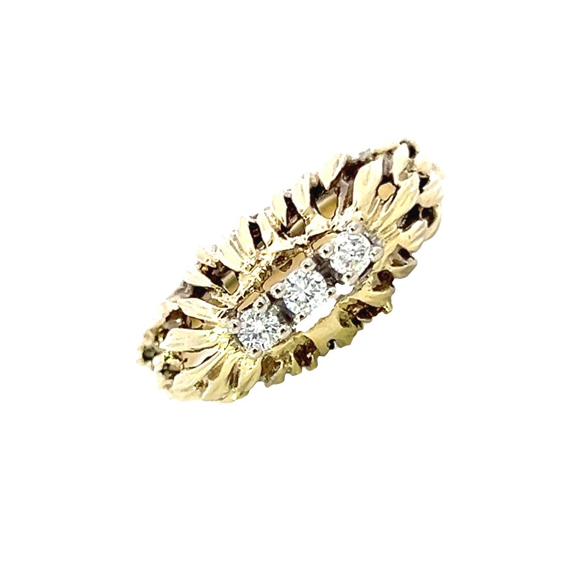 A typical 1970s 14 carat yellow gold ring featuring three modern round brilliant diamonds measuring approximately 0.05ct each in claw style settings mounted on a bed of feather like gold detailing. Condition: Excellent Era: 1970s Approximate dimensions: Weight: 6.30grams