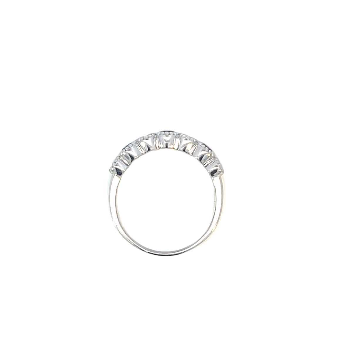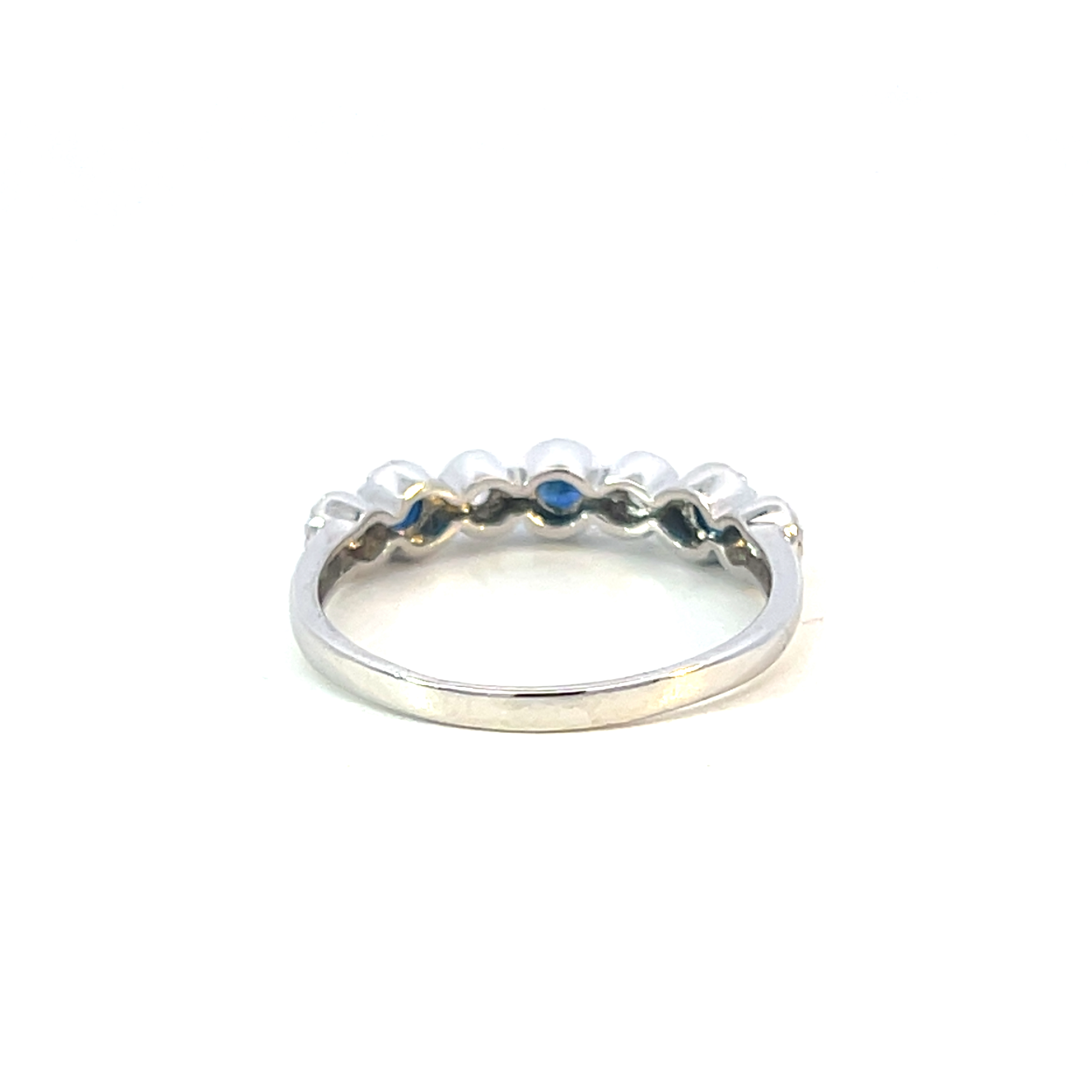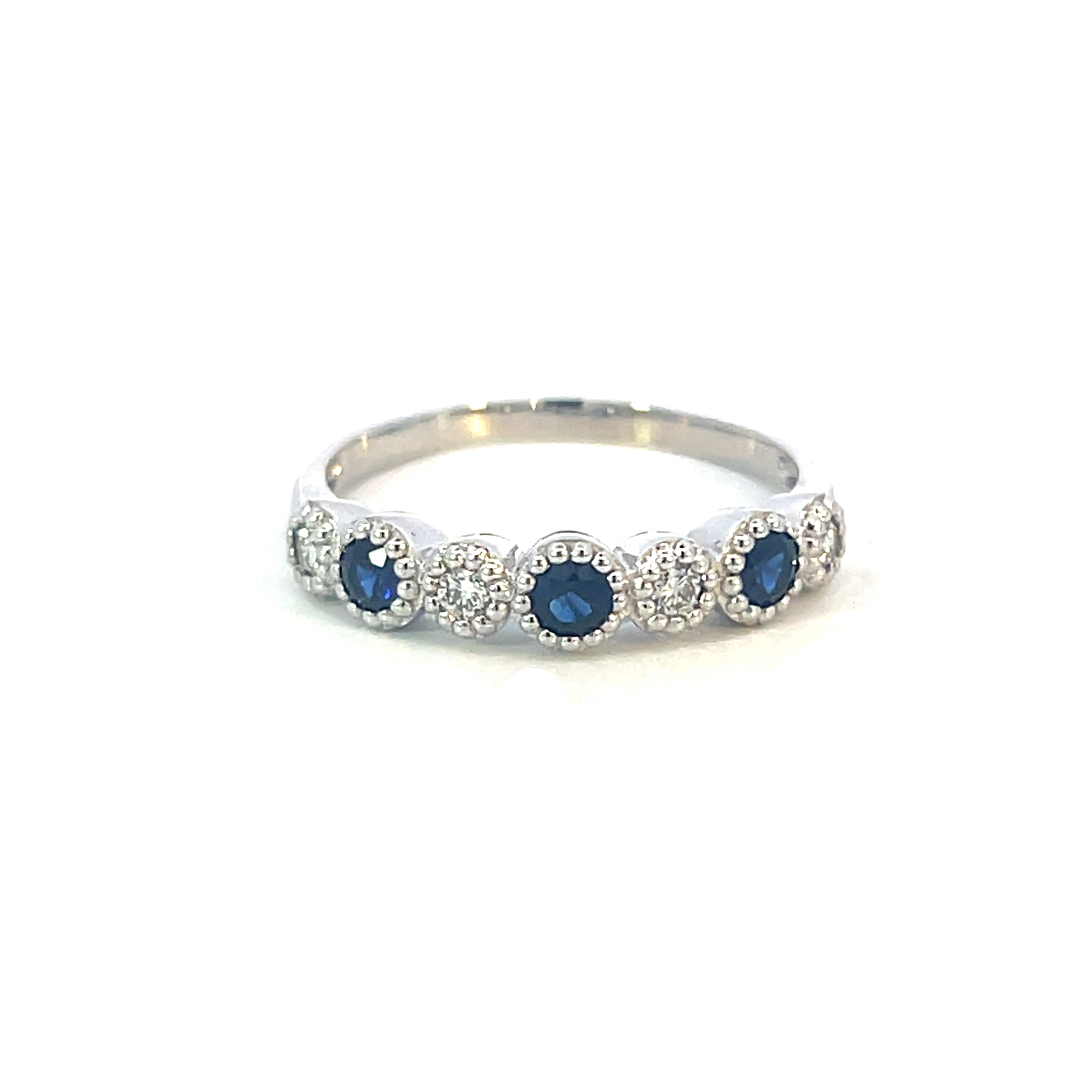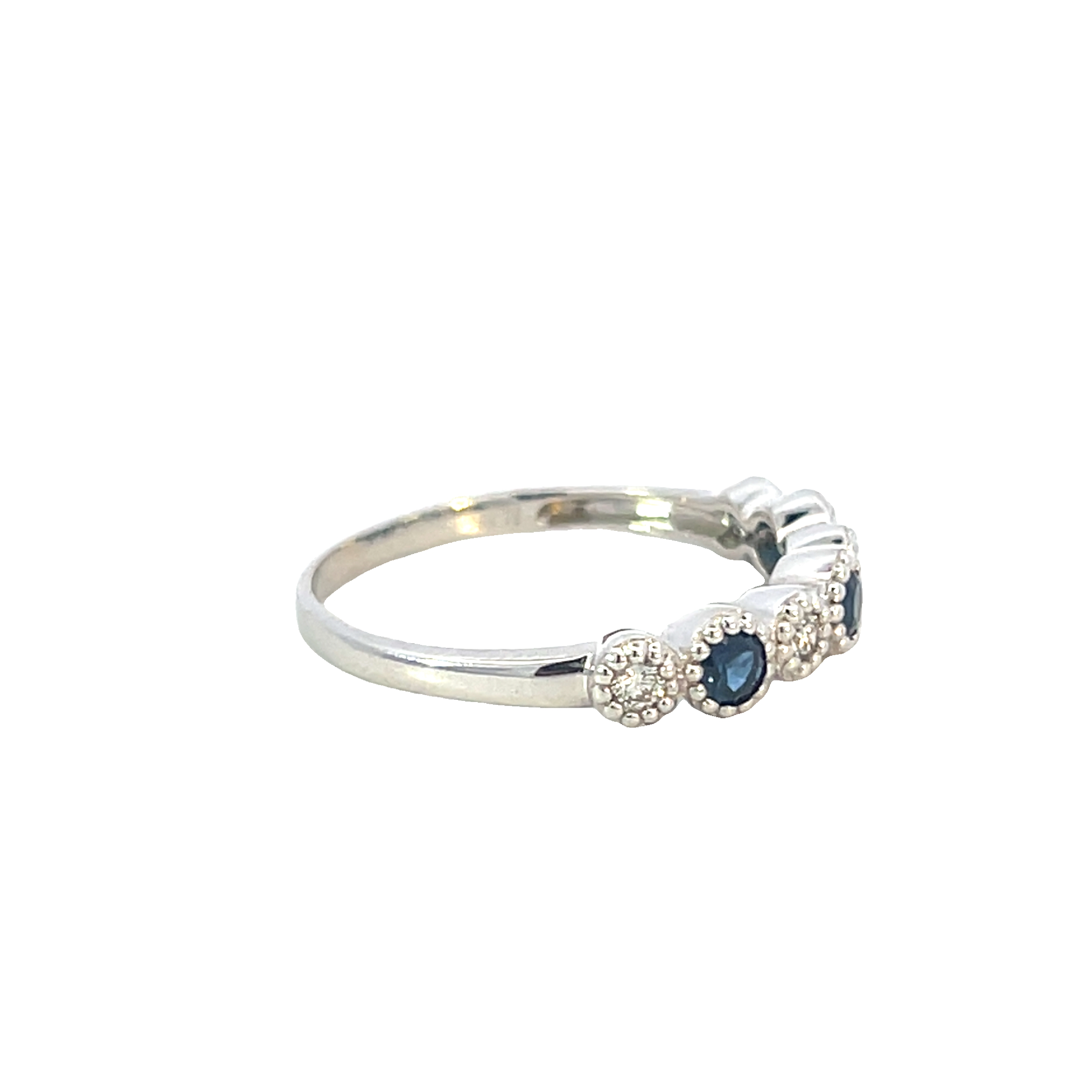 Description: A modern 9ct white gold ring featuring a beautiful design of round diamonds and sapphires in rubover settings with millegrain detailing. A lovely ring for stacking with others, or as a stand alone piece. The sapphries are a beautiful dark blue contrasting to the lovely sparkling diamonds.