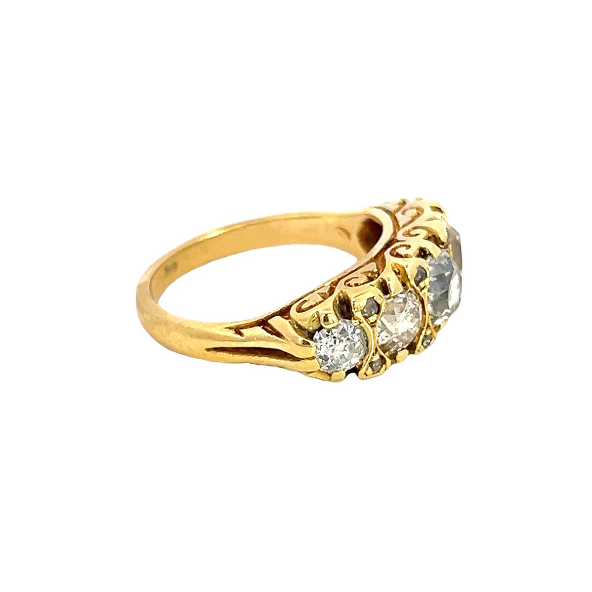 An incredible 18 carat gold Victorian carved half hoop ring featuring five graduating old mine cut diamonds approximately 2.50ct in total interspersed with eight rose cut diamonds to an ornate carved scroll work detail. Be captivated by the unique sparkle of the old mine cut diamonds in this striking ring. The centre old mine cut diamond is approximately 0.70ct followed by two framing old mine cut diamonds of approximately 0.50ct. these are further framed by two more old cut diamonds approximately 0.35ct each. Condition: Very good one small chip to the centre diamond consistent with the age and wear of the piece Era: Late Victorian Ring size : M Weight: 7.38 grams