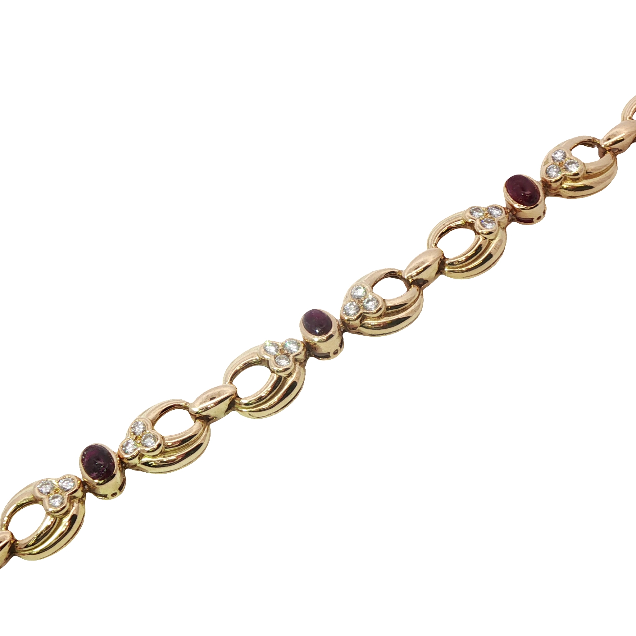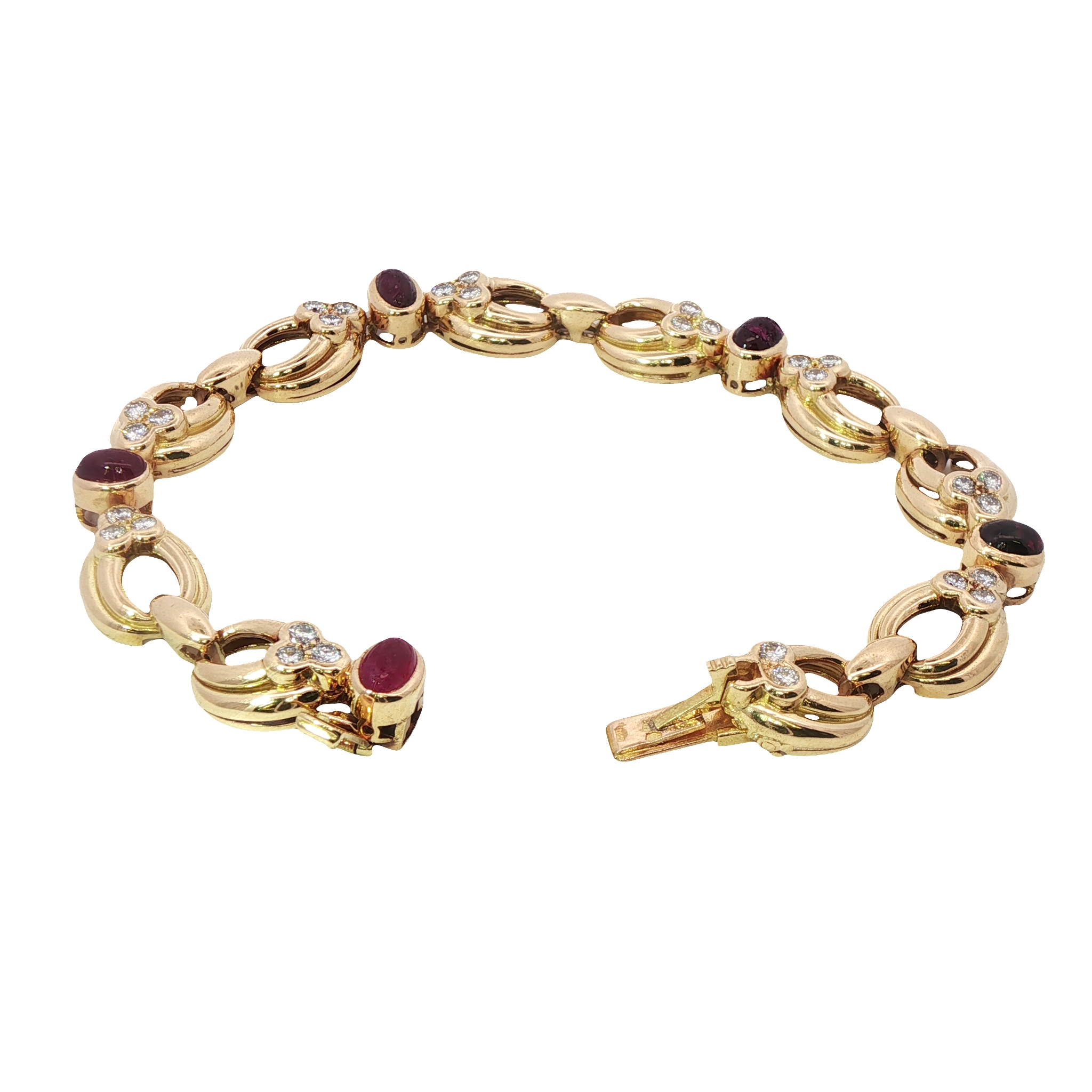 A vintage Chaumet bracelet in 18ct yellow gold featuring rubies and diamond. This beautiful, chunky bracelet features fabulous dark cabochon rubies and sparkly diamonds in rubover setting in a typical design of Retro Chaumet. Fastened with a clasp, hidden by a ruby and an extra safety catch underneath.