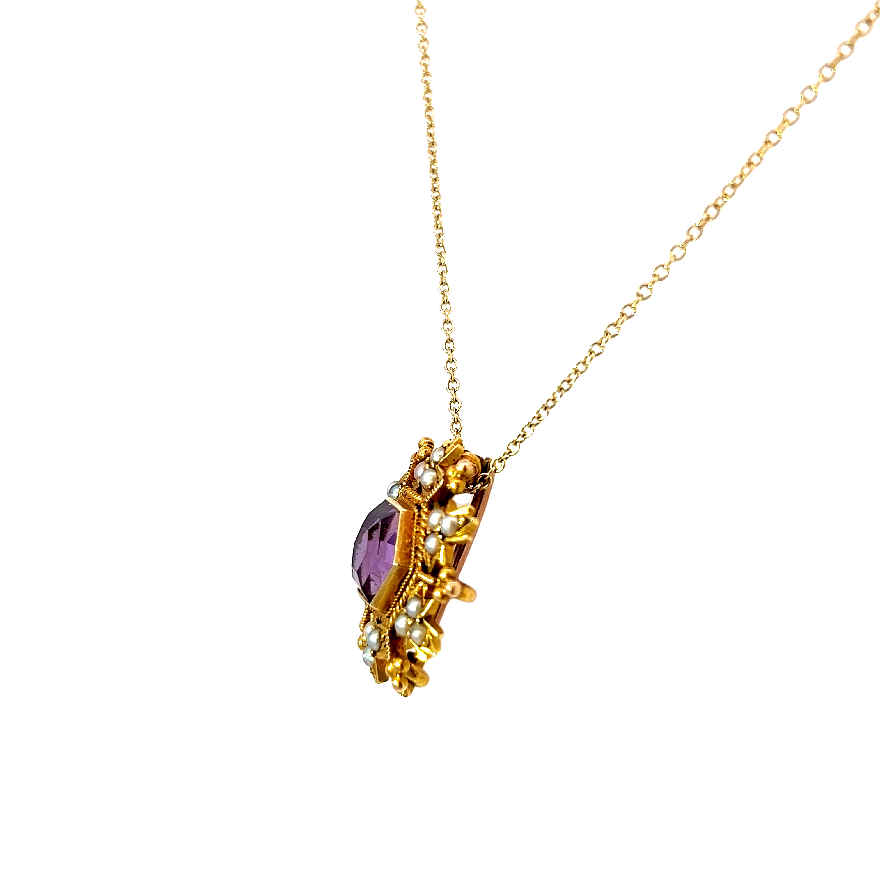Mid-19th century yellow mounted amethyst and pearl hexagonal brooch with pendant converter. The brooch features a principal hexagonal cut amethyst in a rub over setting with a fine rope surround with six (6) trefoil clusters of pearls surrounding six (6) trefoil gold ball clusters with pin brooch fitting and pendant converter.