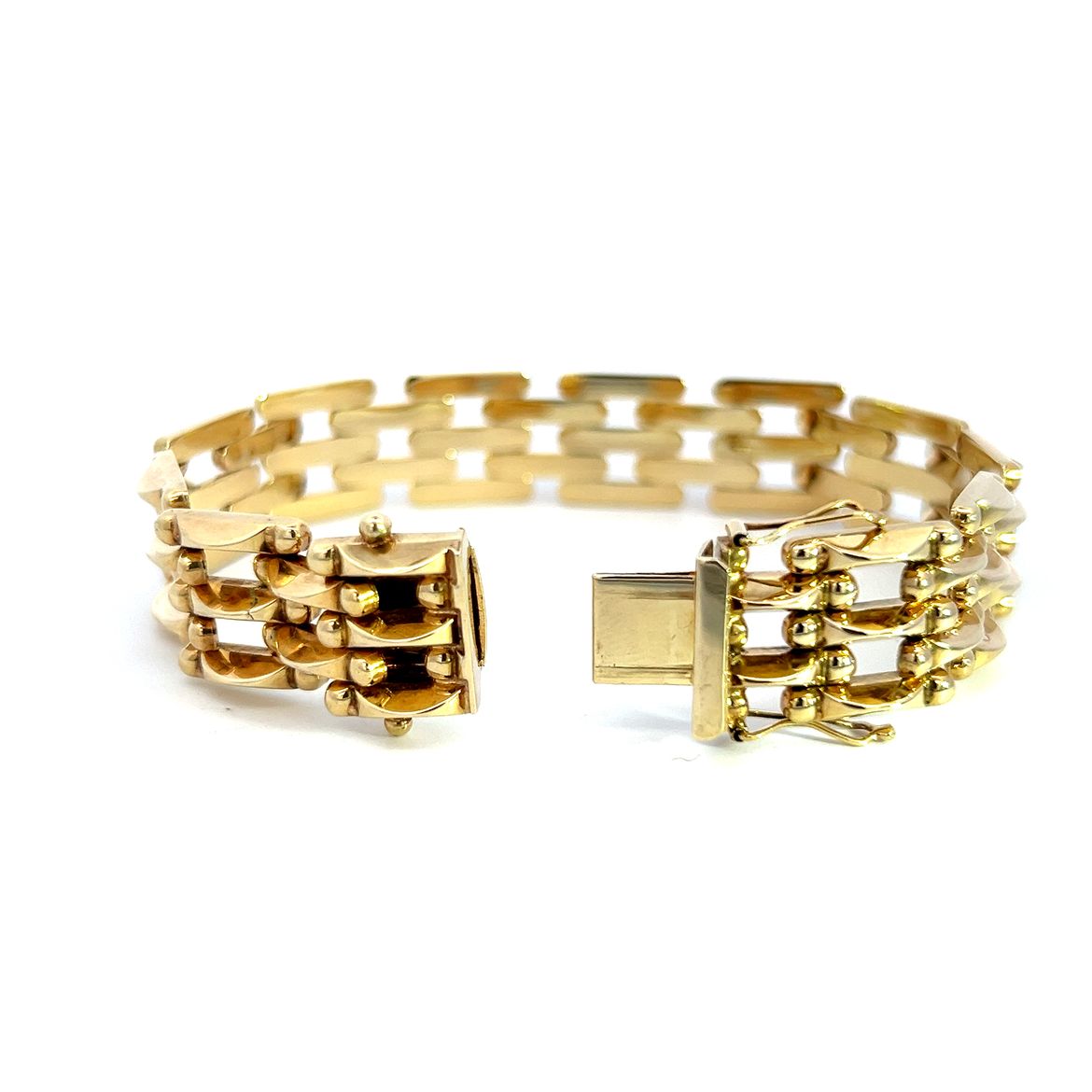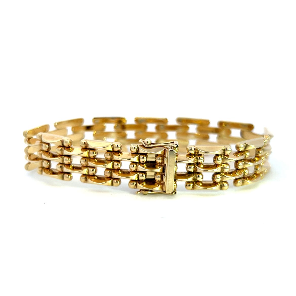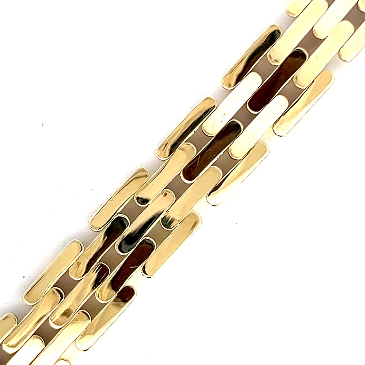 A beautiful 14 carat yellow gold bracelet in a chunky link fastened with a box catch and two figure of eight safety clasps. Condition: Excellent Era: Vintage Approximate dimensions: 14.00mm width / 19cm length Weight: 24.81 grams