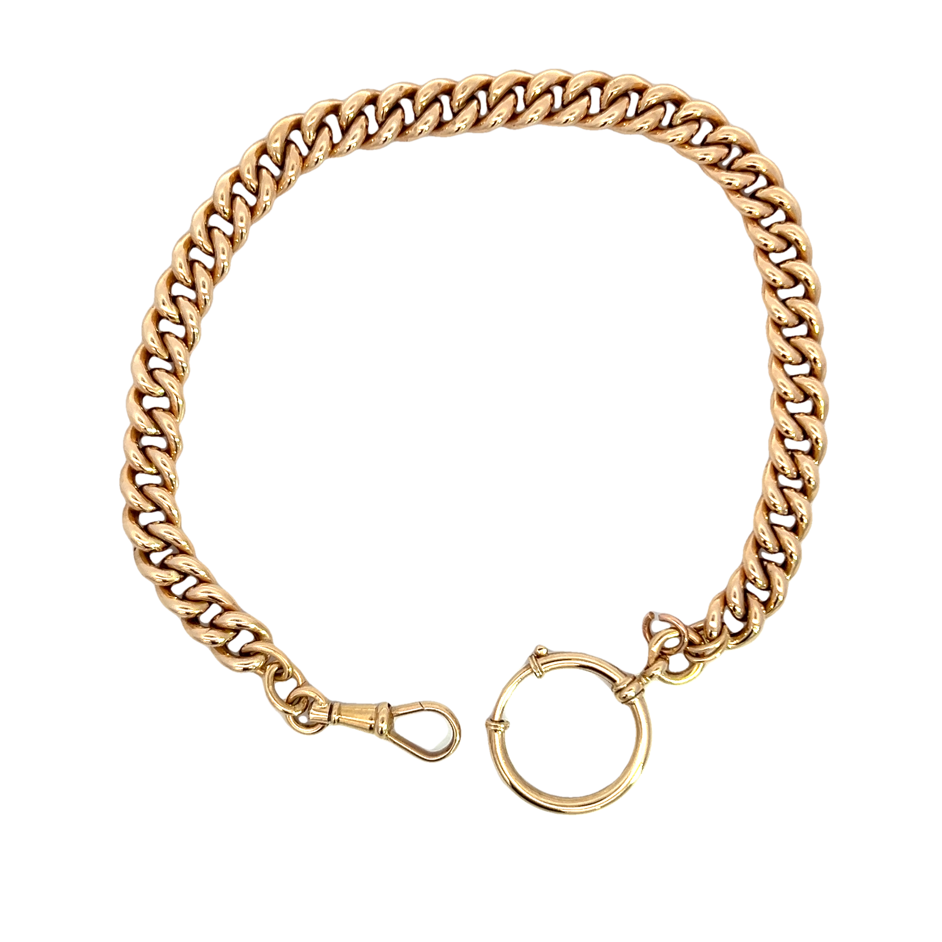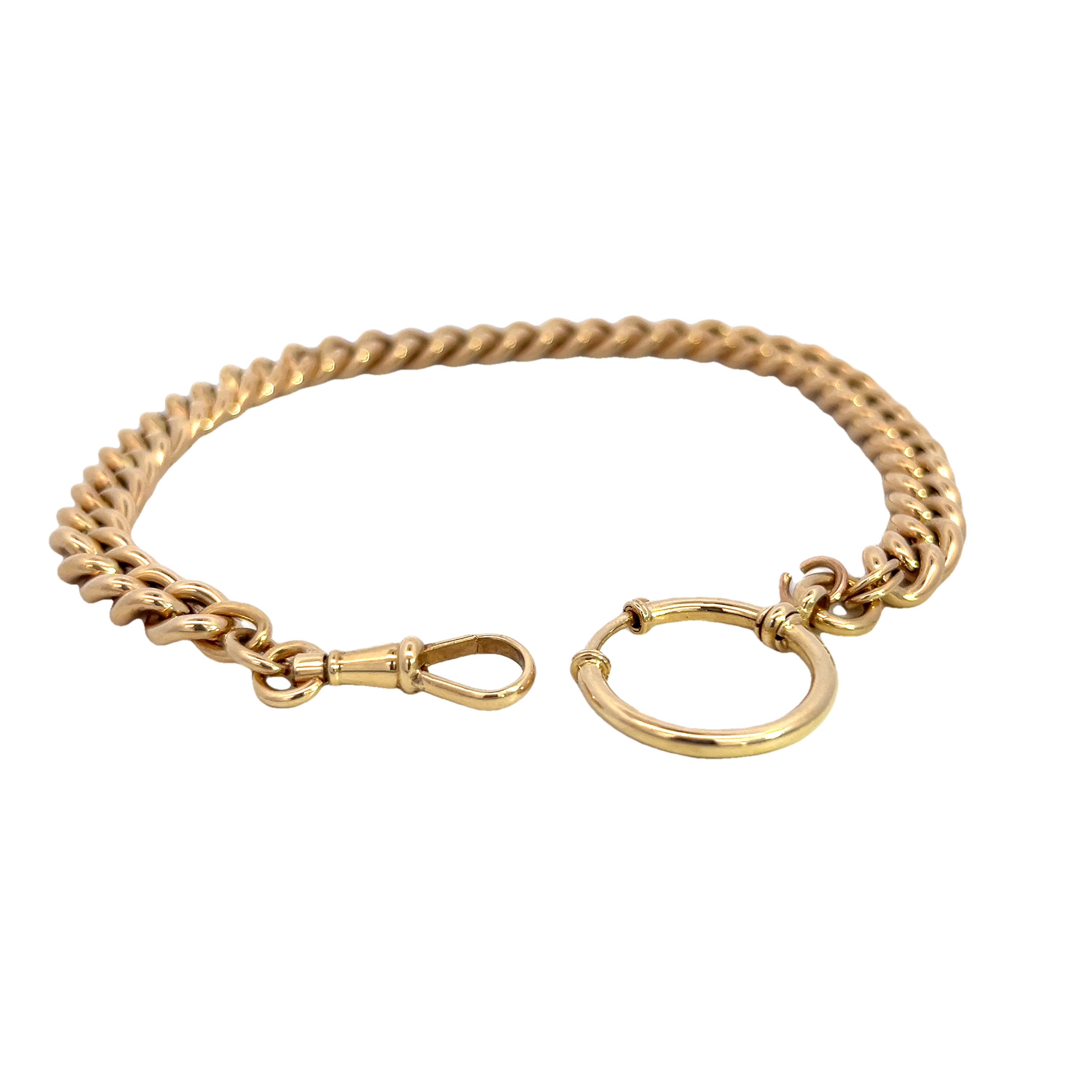 A fabulous curb link 14 carat gold watch chain traditionally used to link a pocket watch to a button hole whilst the watch sits safely in the pocket of the wearer. The bracelet is hallmarked with an oak leaf mark denoting of Netherland origin and it has been tested as 14 carat gold. The chain has an albert clasp one end and large stylised bolt ring clasp the other. Condition: Excellent Era: 1906- 1953 Approximate dimensions: 27cm in length Weight: 22.63 grams