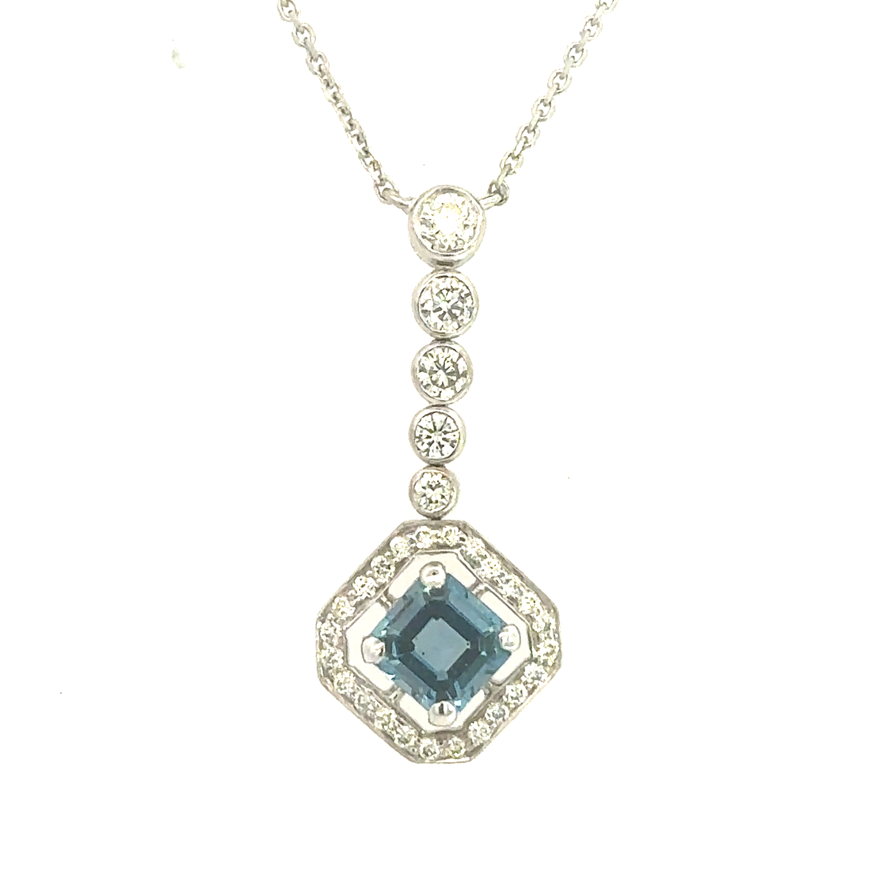 An 18-carat white gold vintage style Aquamarine and Diamond halo pendant. Featuring a square shaped step cut denim blue 0.97 carat Aquamarine that is approximately 5.5mm by 5.6mm. This gemstone is in a four-claw setting, surrounded by a grain set diamond halo. A graduated line of round brilliant diamonds is set above the pendant in rub over settings. The overall dimensions of the pendant are 27mm long by 11.65mm. The pendant is fixed centrally along an 18-carat white gold filed fine trace chain, with a length of 46cm.