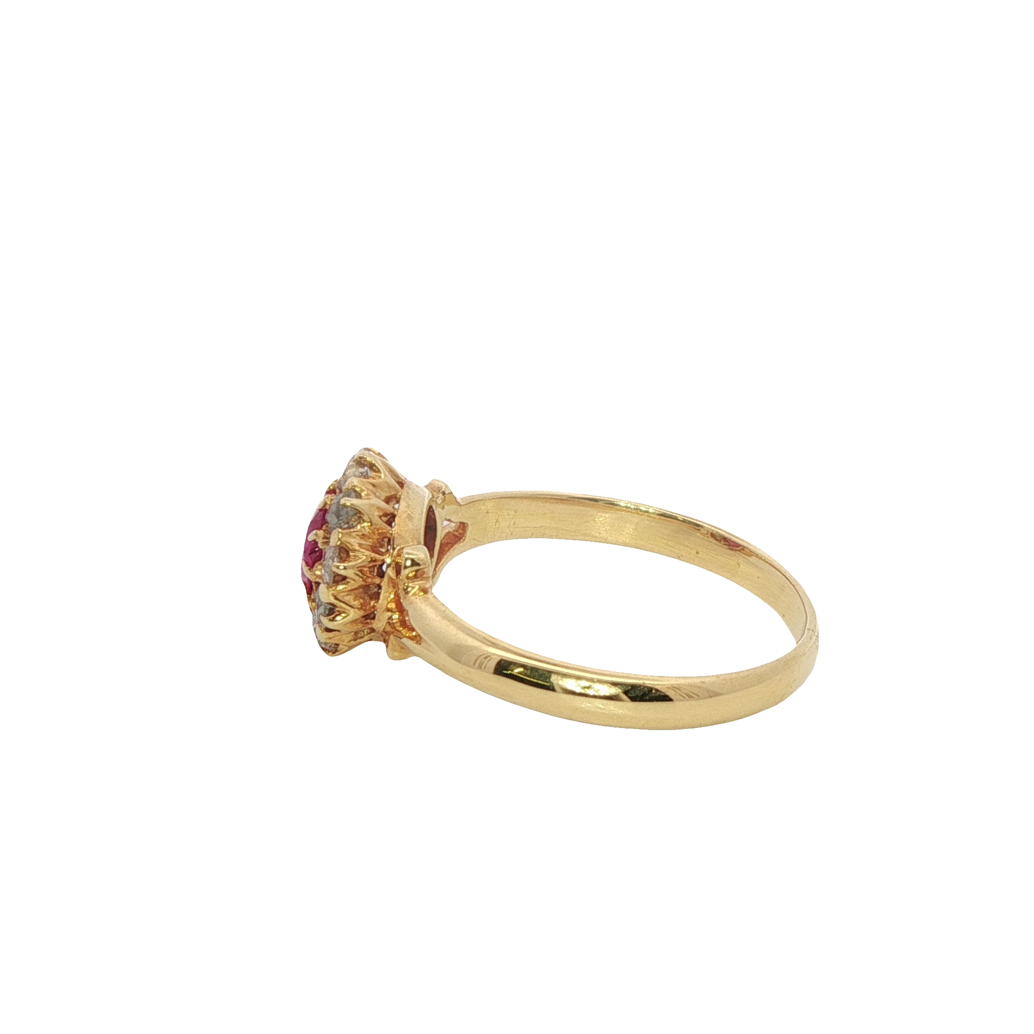 A charming ruby and old cut diamond cluster ring in 18ct yellow gold.