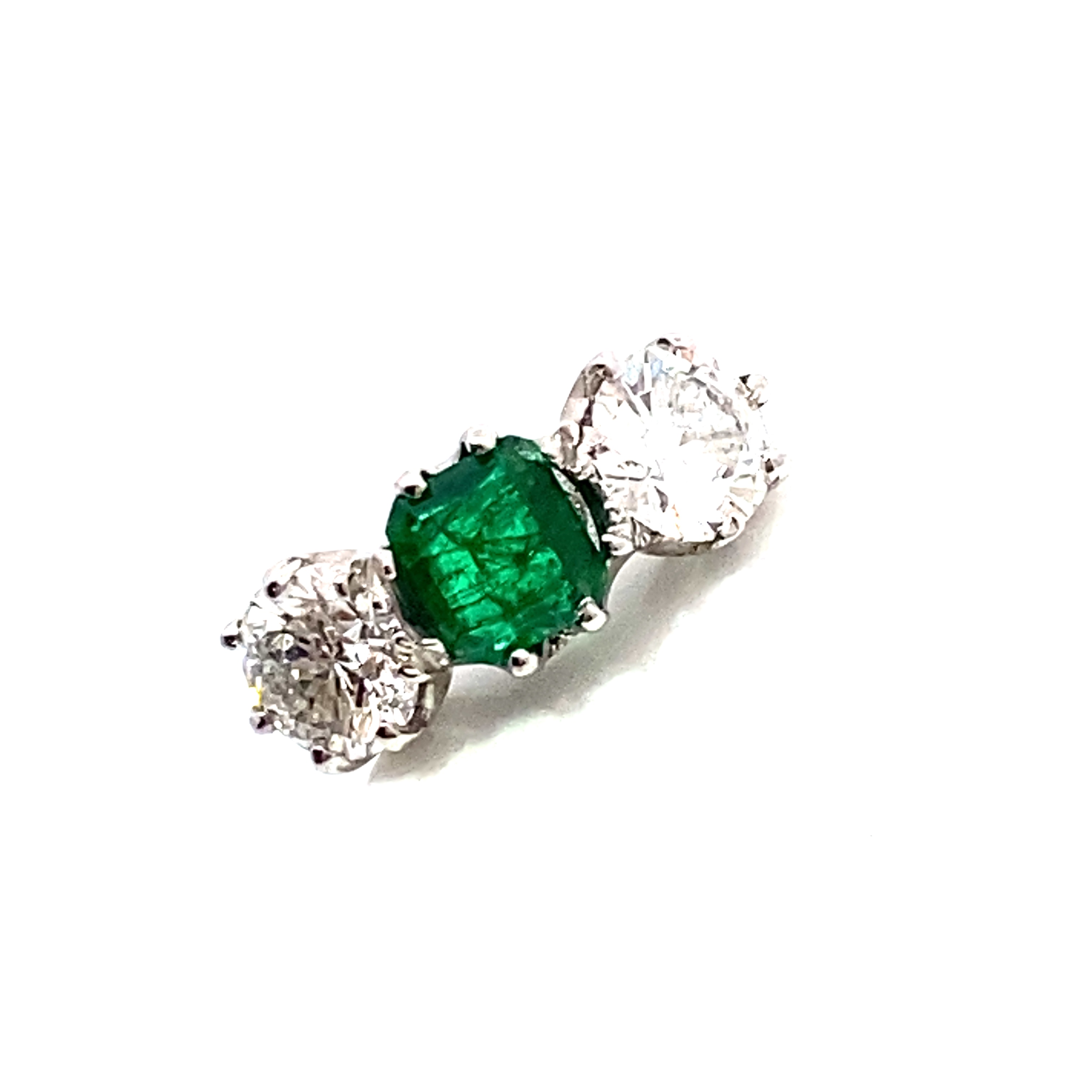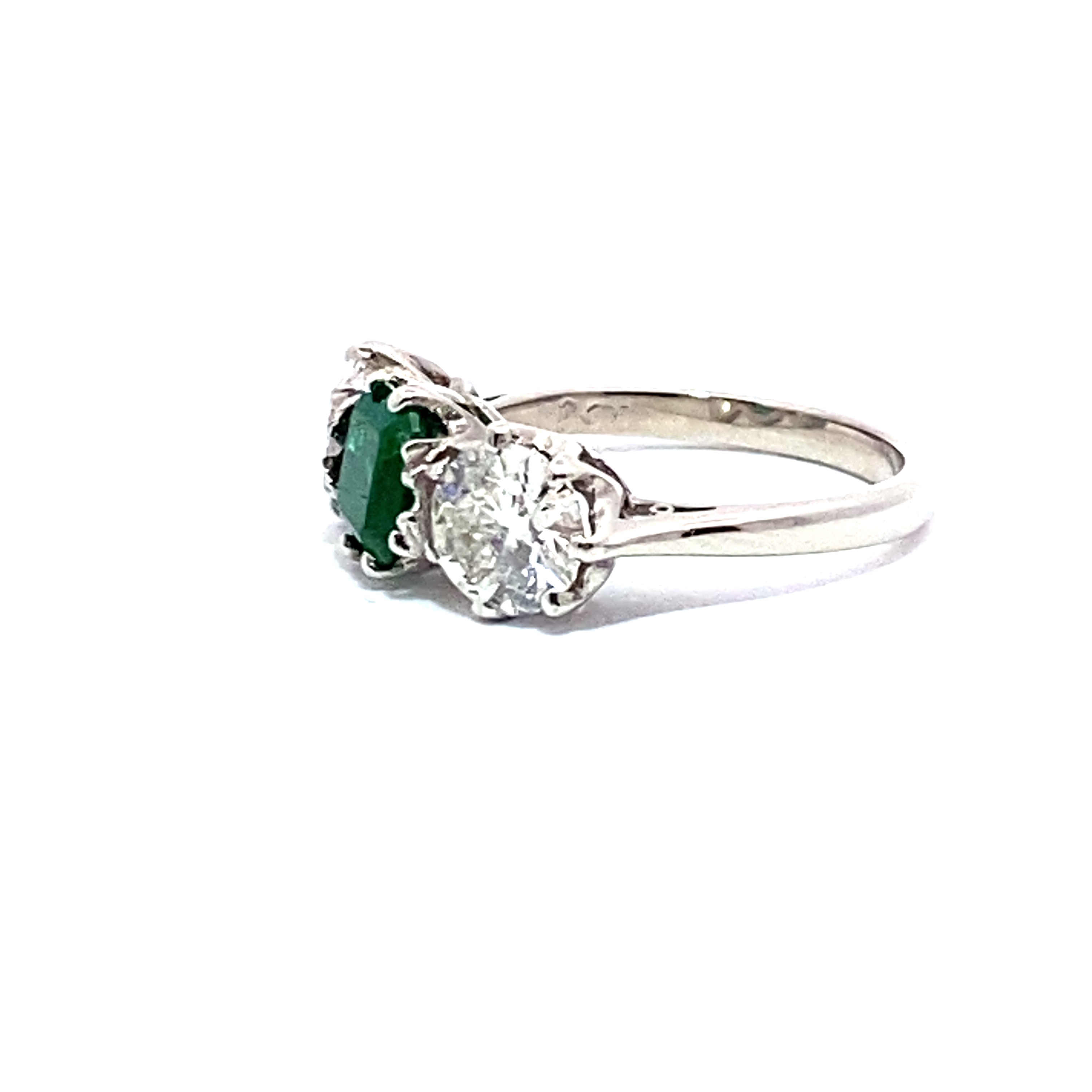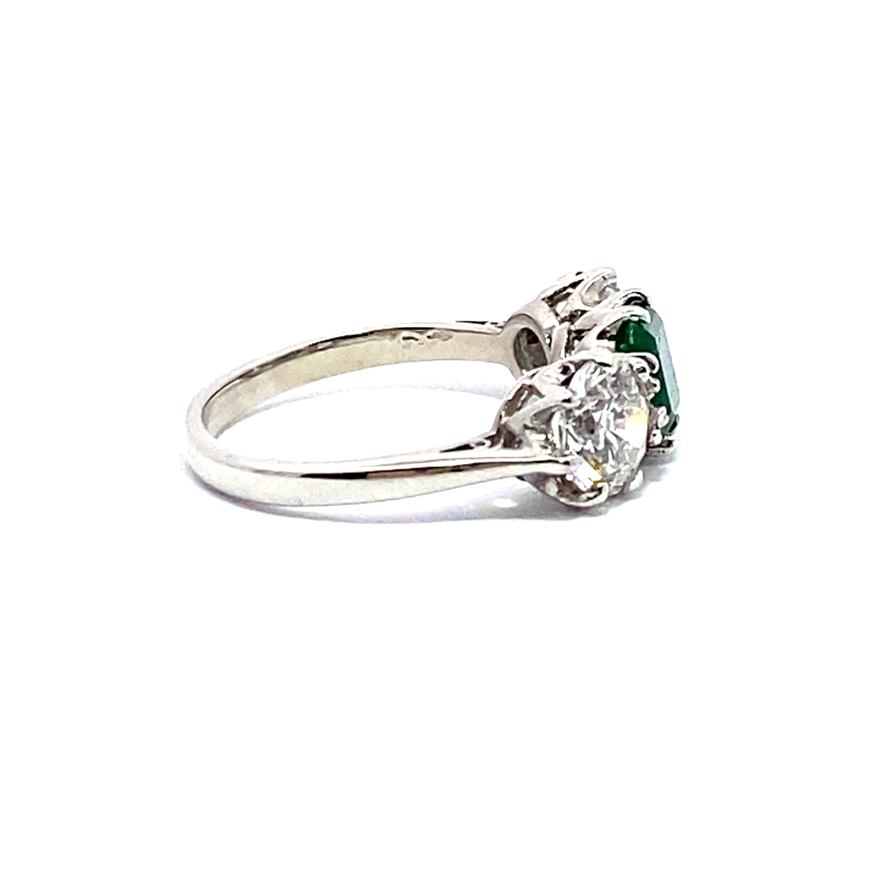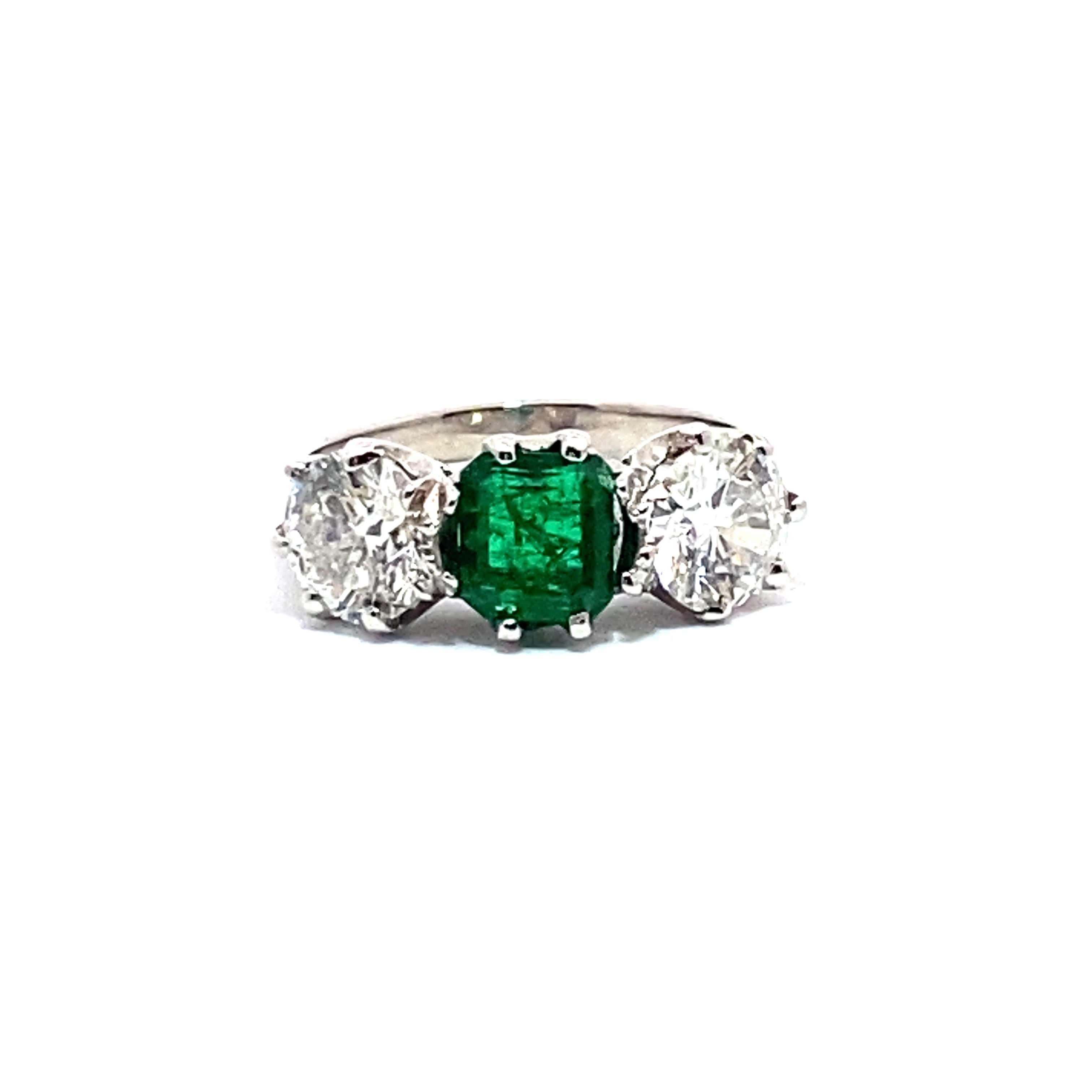 A beautiful platinum ring featuring a central emerald cut emerald in a claw style setting measuring 5.7mm x 5.1mm framed by two round brilliant claw set diamonds weighing approximately 0.72ct each graded as H/I and Si2 clarity. Finger size J.