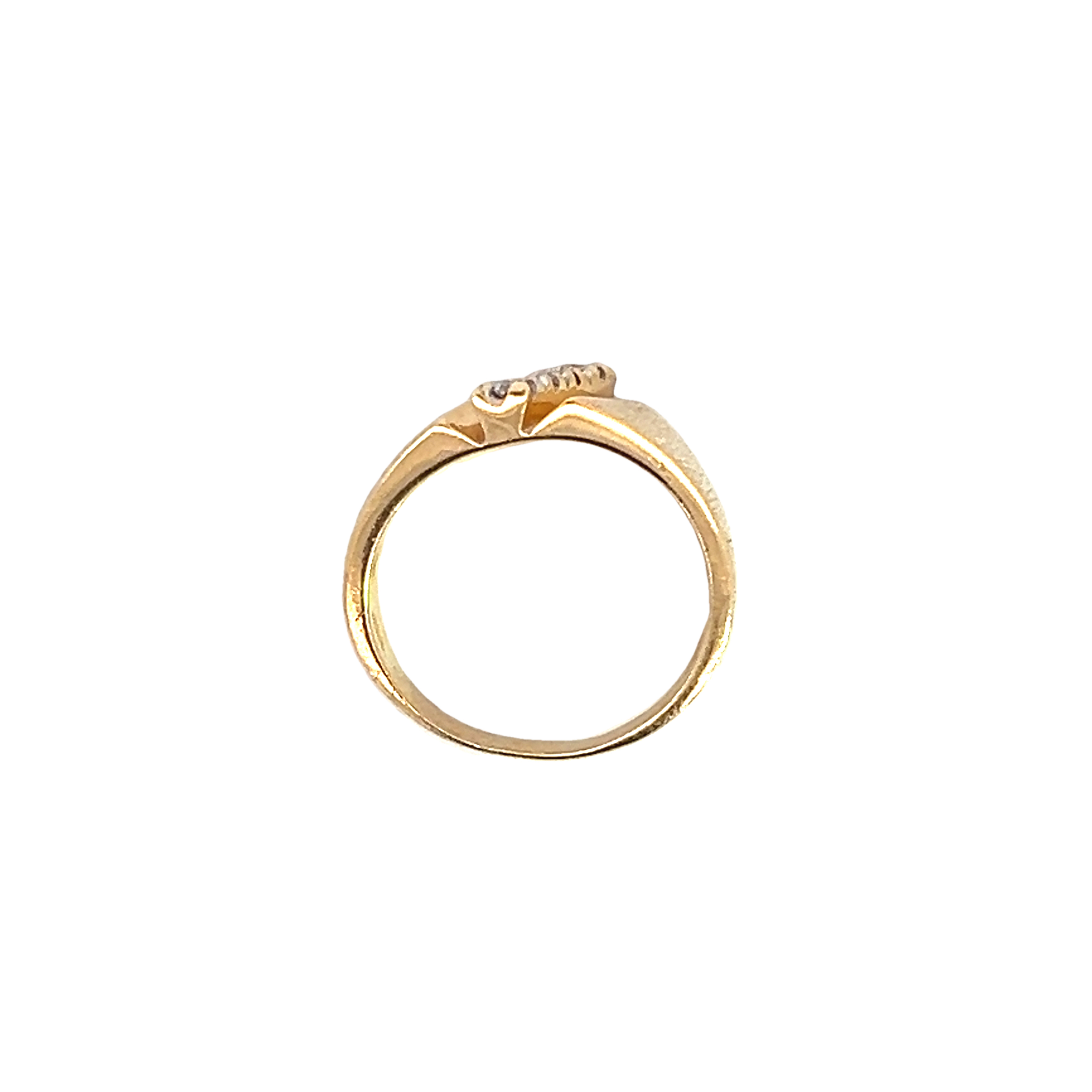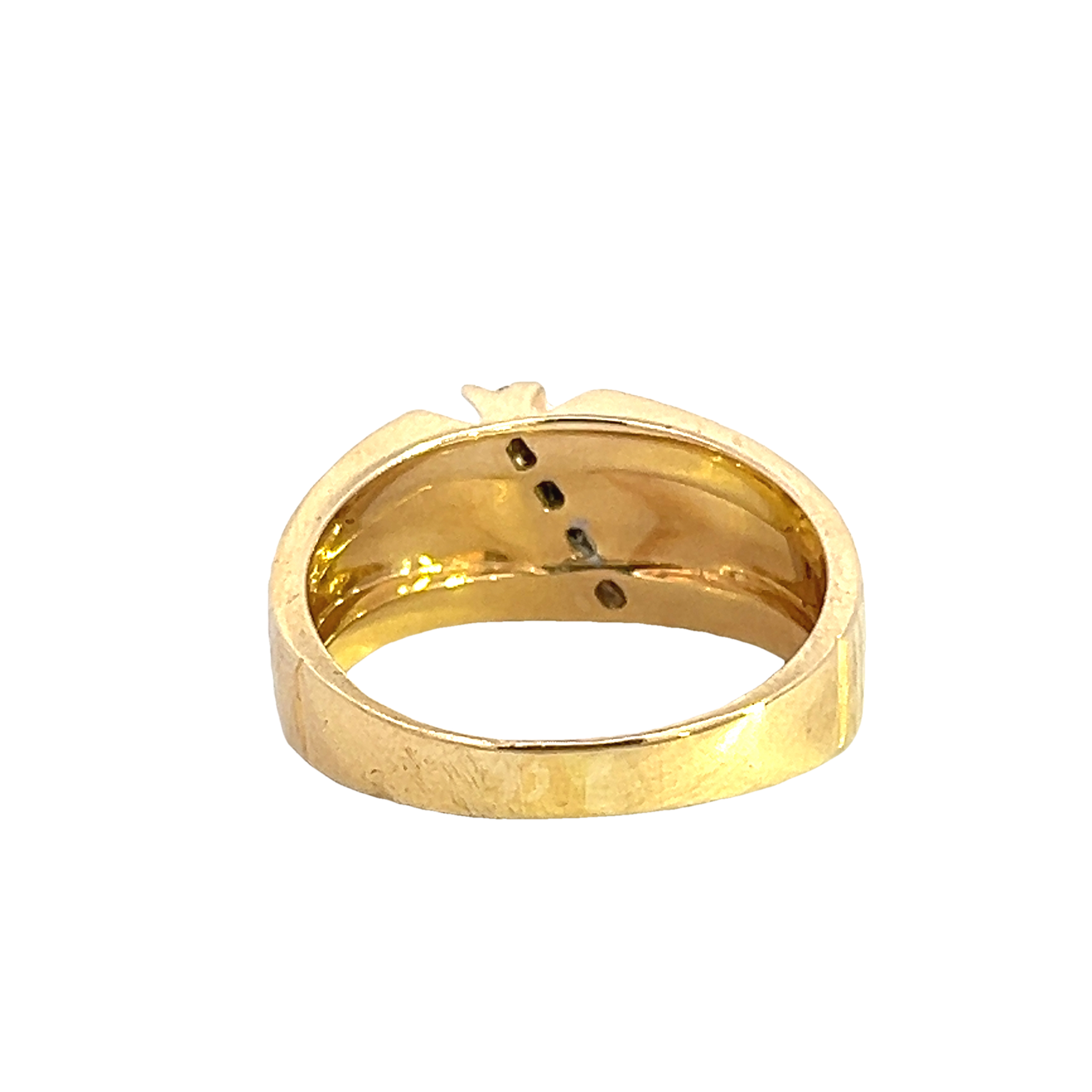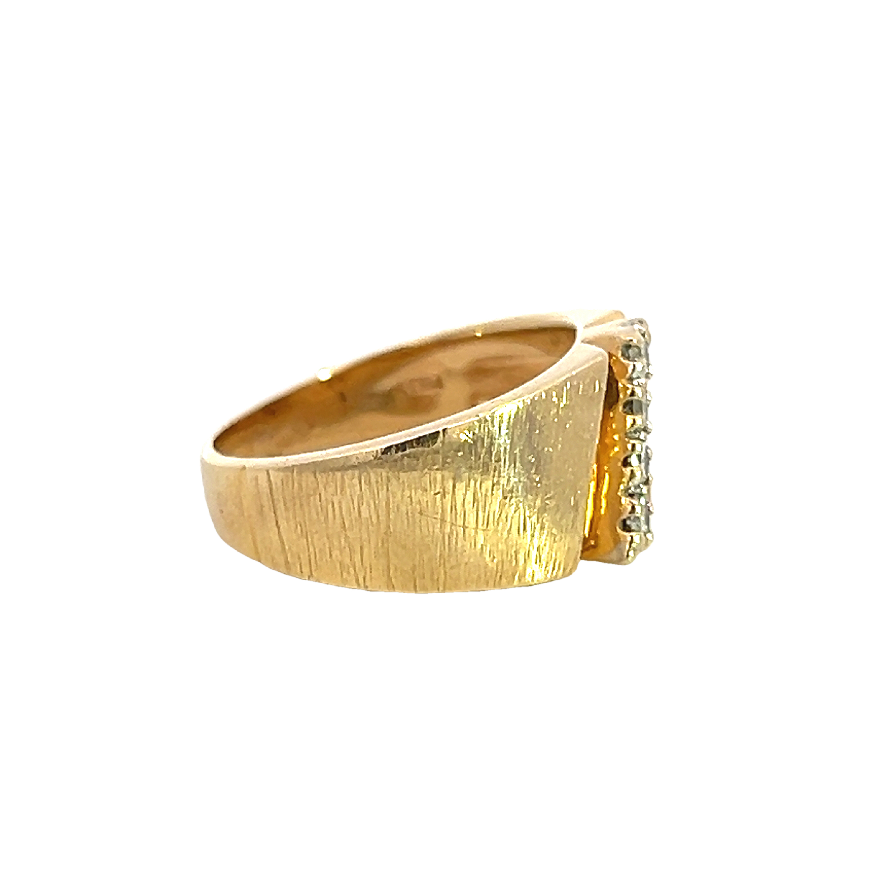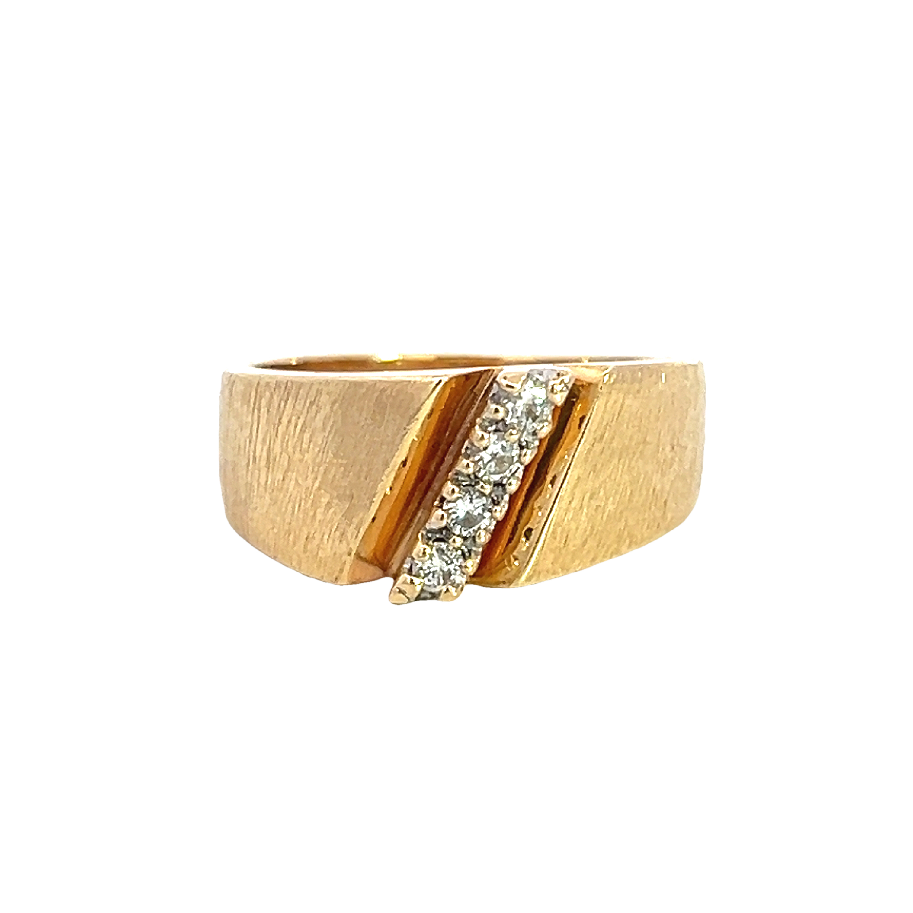 An 18 carat gold ring featuring a diagonal line of claw set modern round brilliant diamond totally approximately 0.24ct set into a wide tapering band with a funky textured finish. A retro ring that look fabulous along side other rings or alone with a touch of sparkle and a unique look. Condition: Very good some wear to the back of the band. Era: Retro Approximate dimensions: 9.25 tapering to 4.25 towards the back. Finger size: O Weight: 6.22 grams