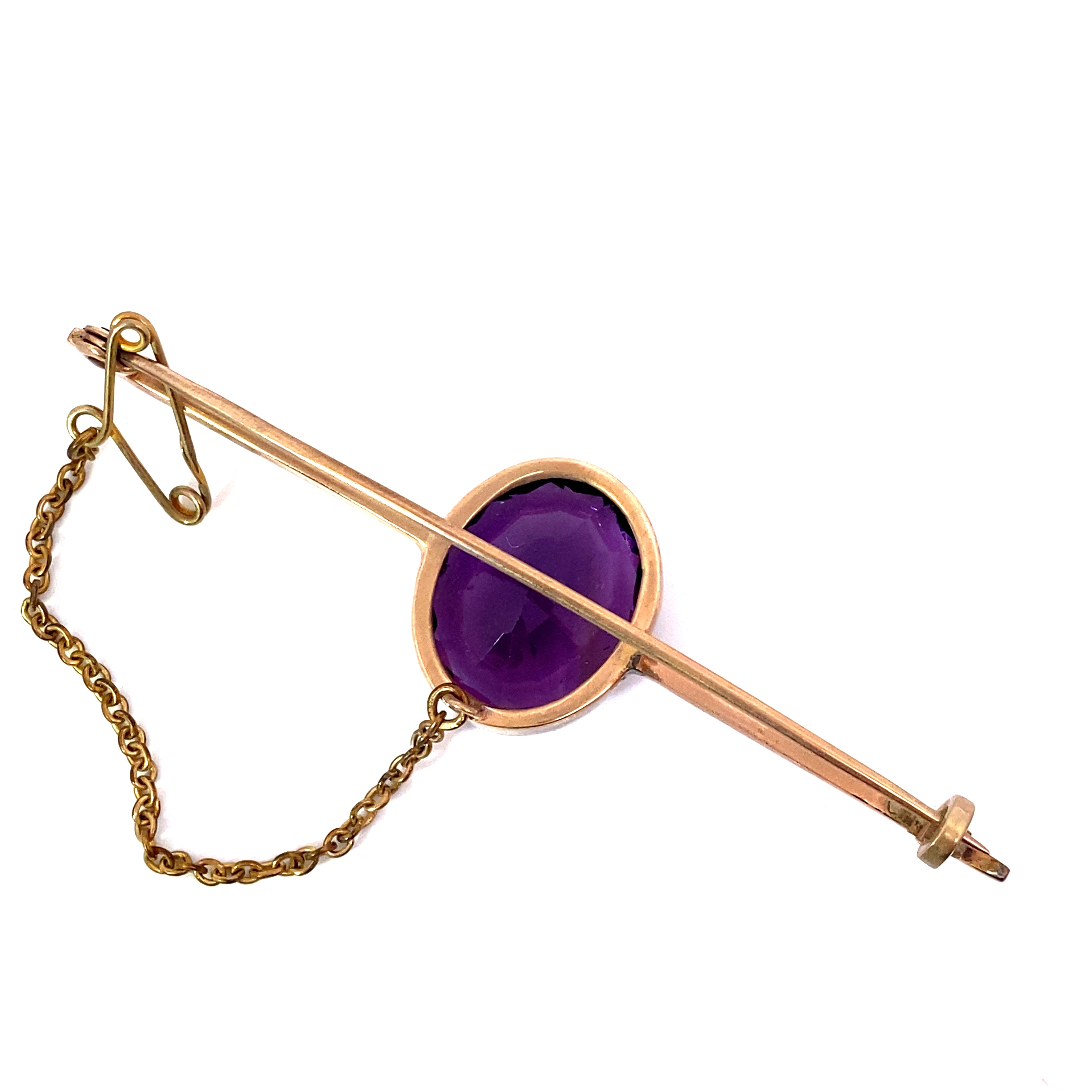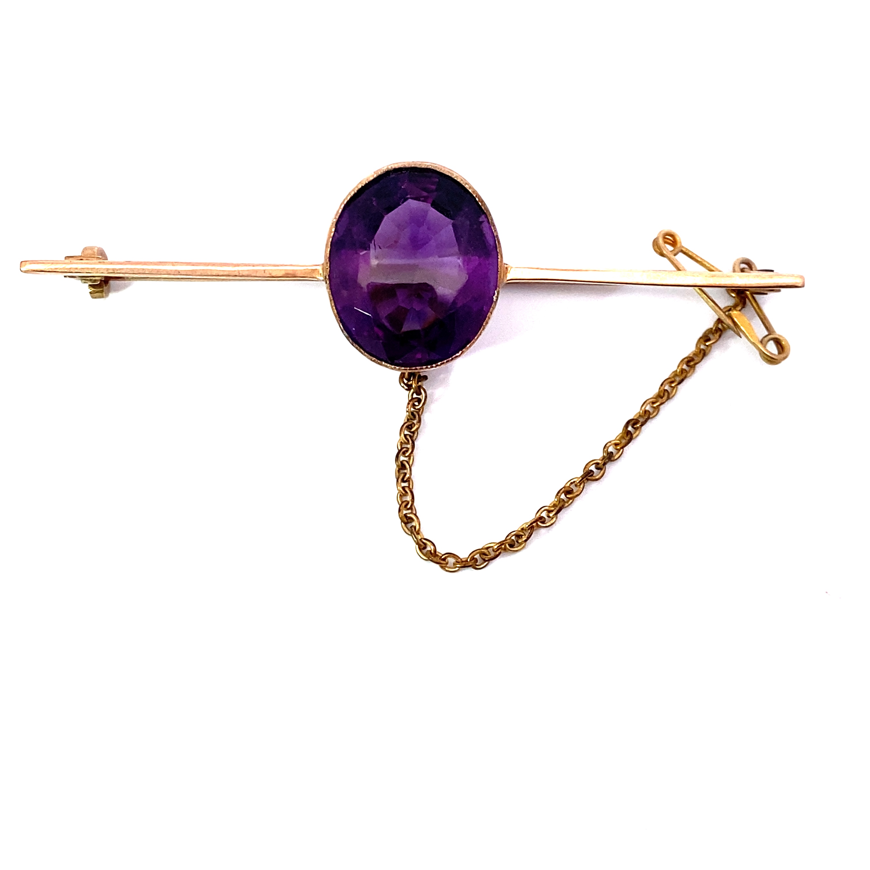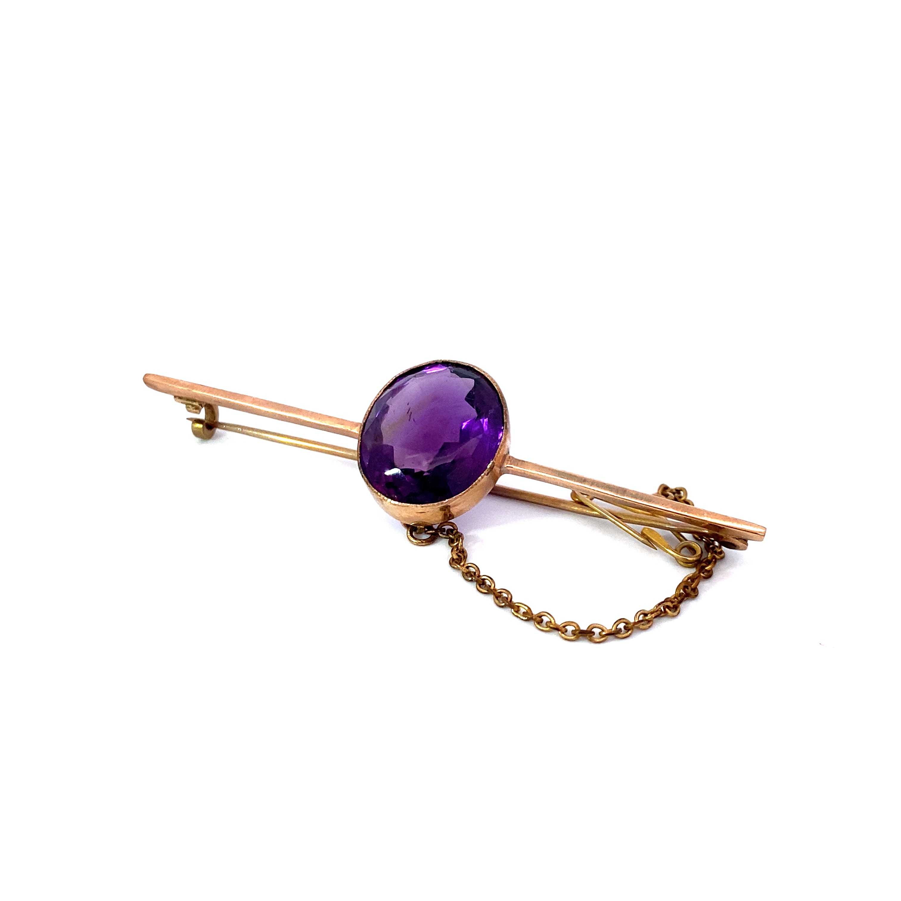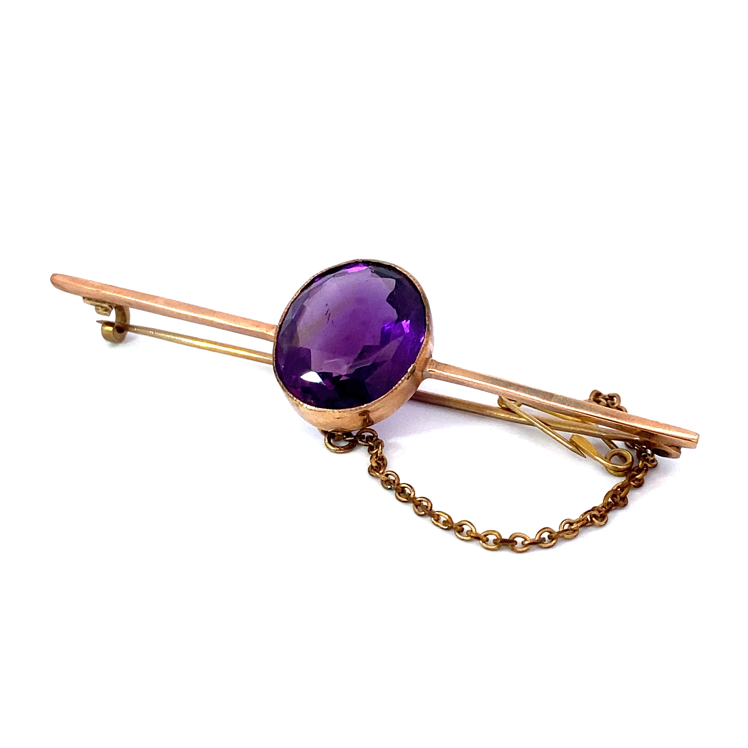 A classic vintage brooch featuring an oval mixed cut amethyst in a rubover setting on a bar brooch. The oval amethyst weighs approximately 9.58ct. The brooch has a standard pin fastening and extra safety chain.