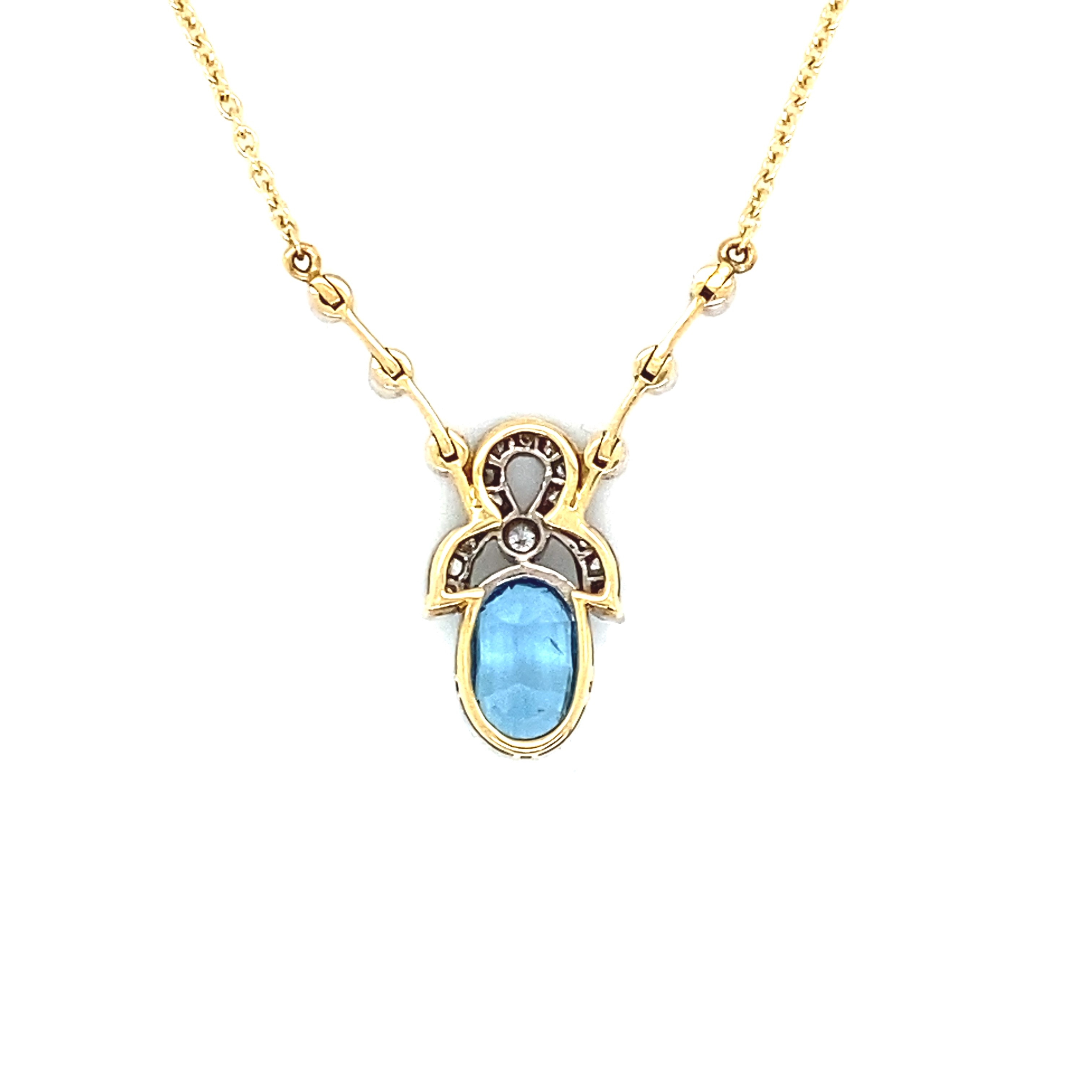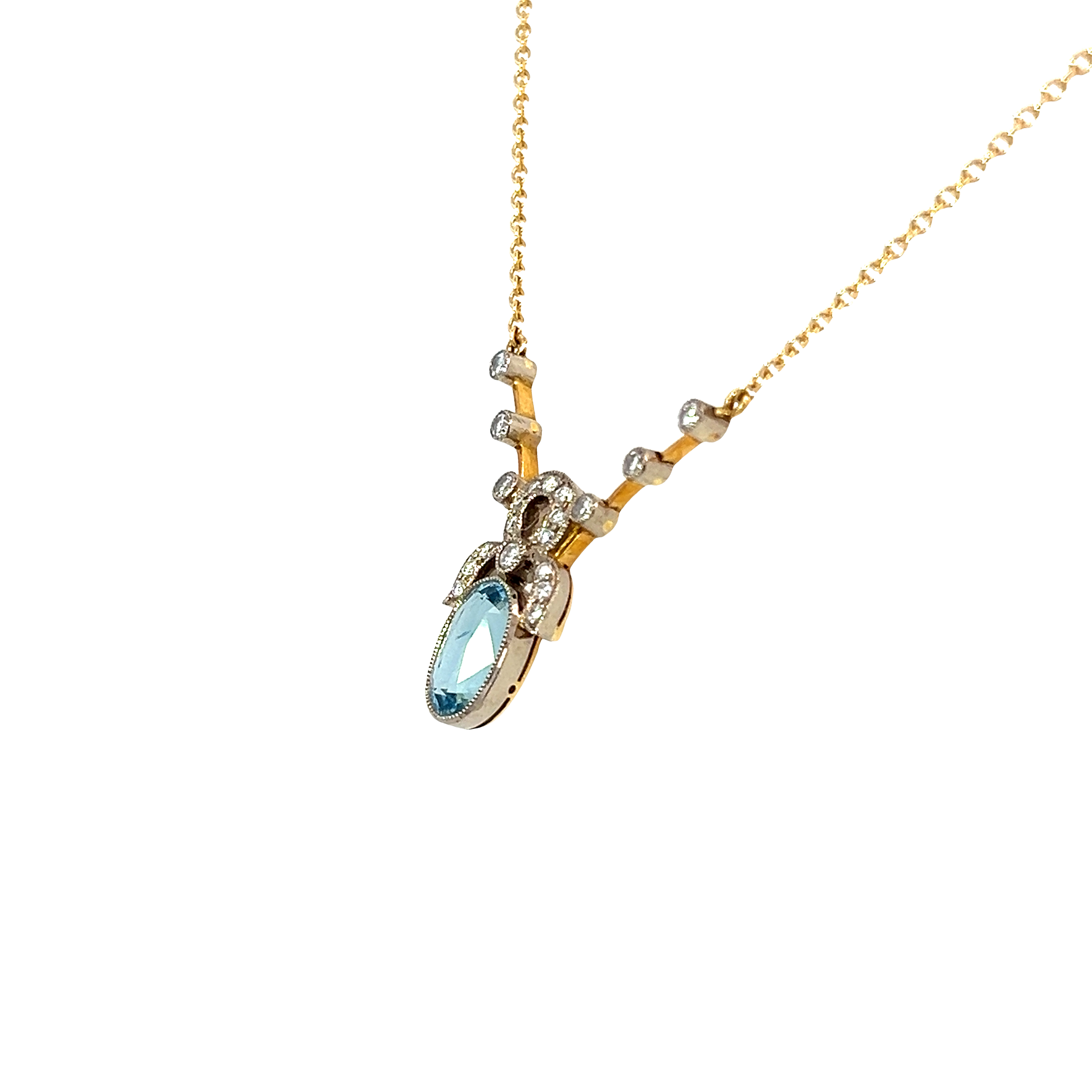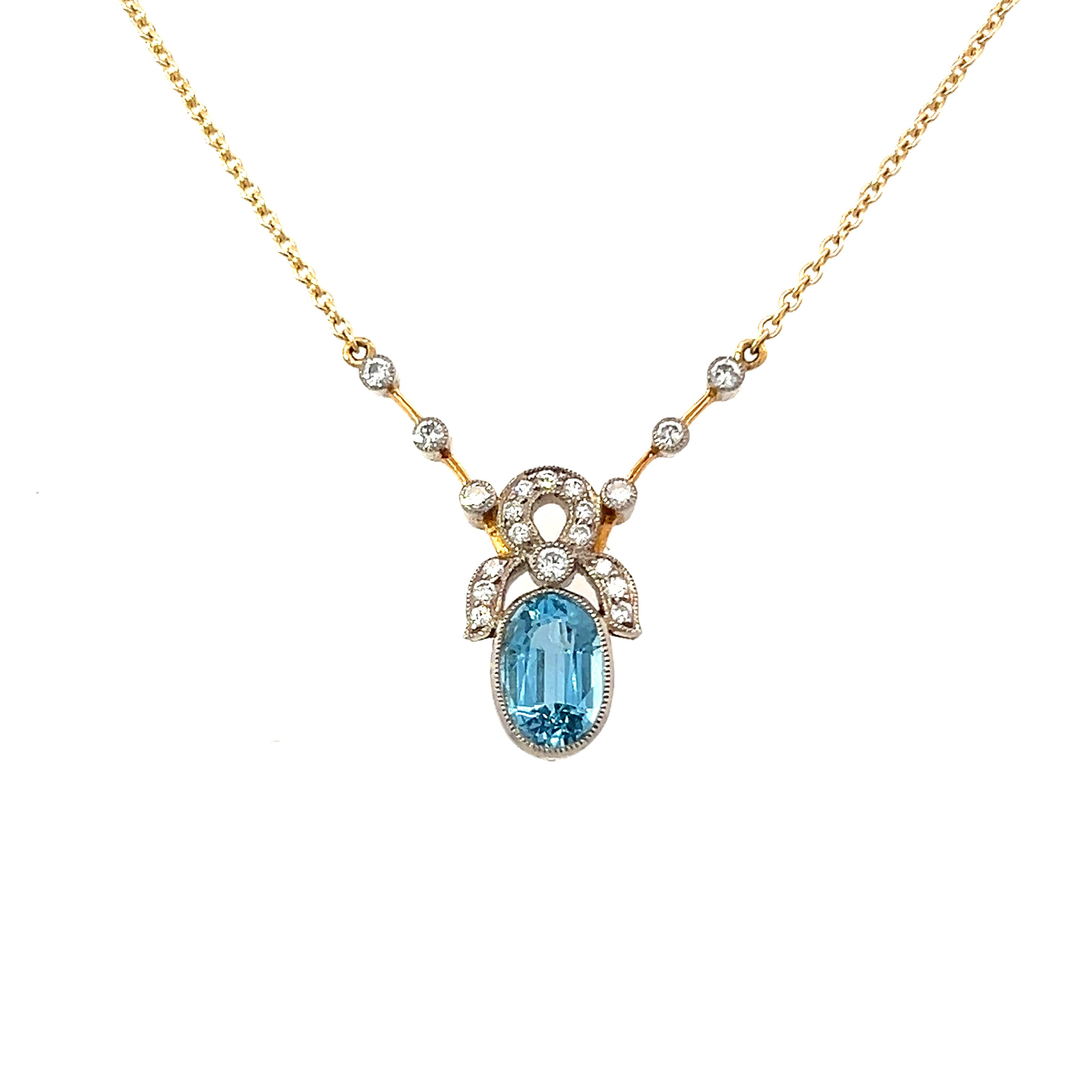 An antique pendant featuring an oval cut Aquamarine in a bow like design set with Diamonds in yellow and white gold settings. Set on a modern 18ct yellow gold 18inch trace chain the pendant measures approximately 21mm in length 19mm at the widest point. 4.4g