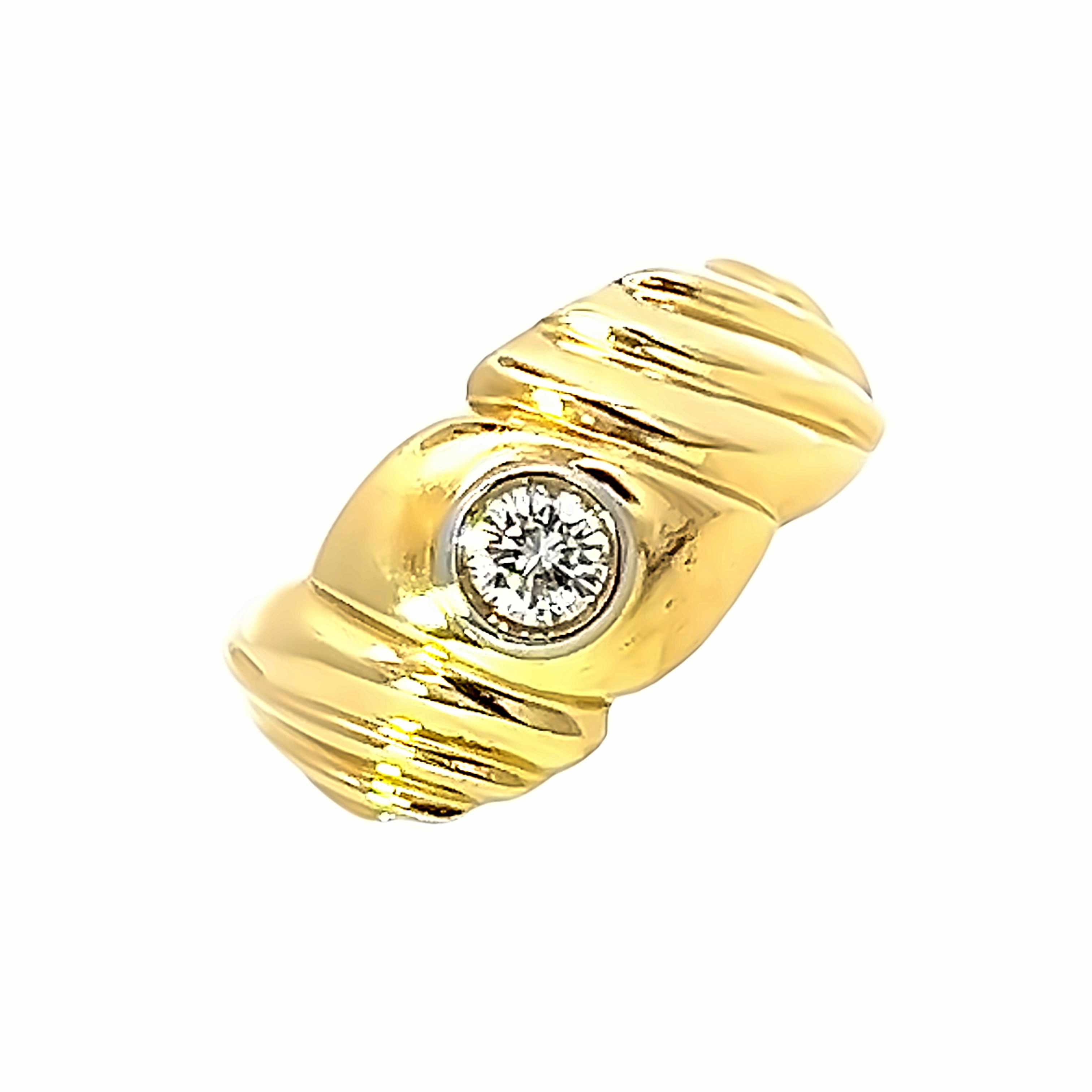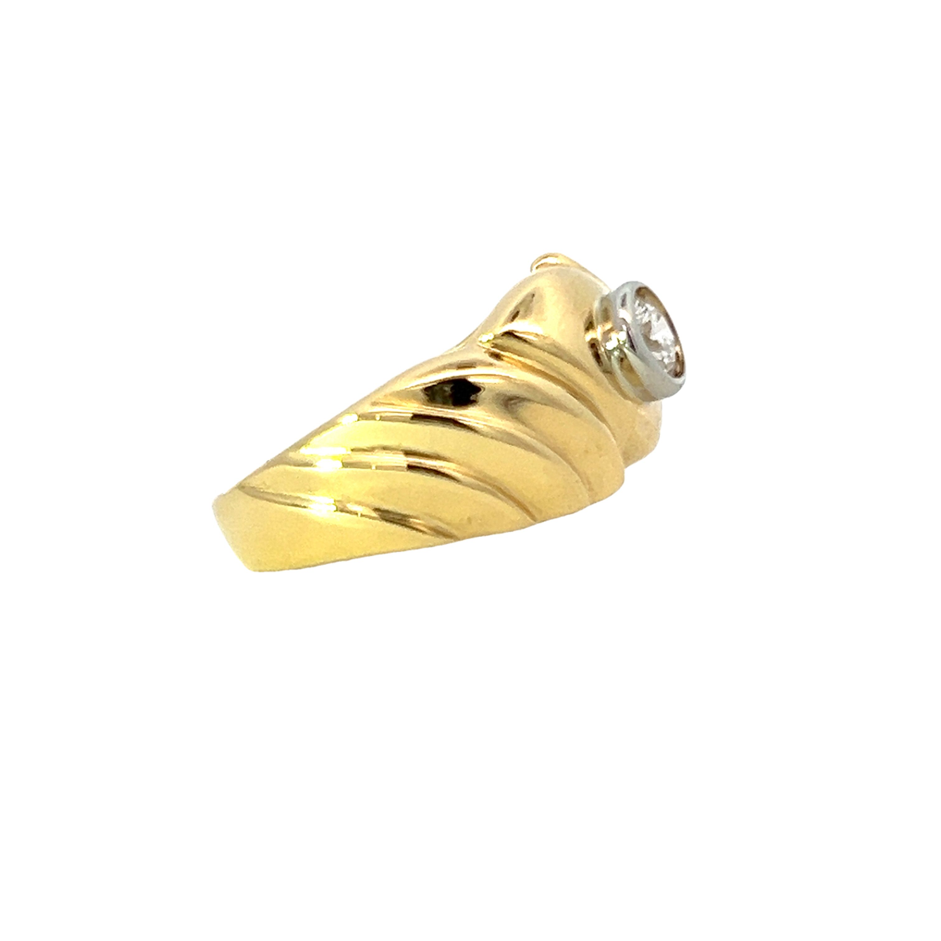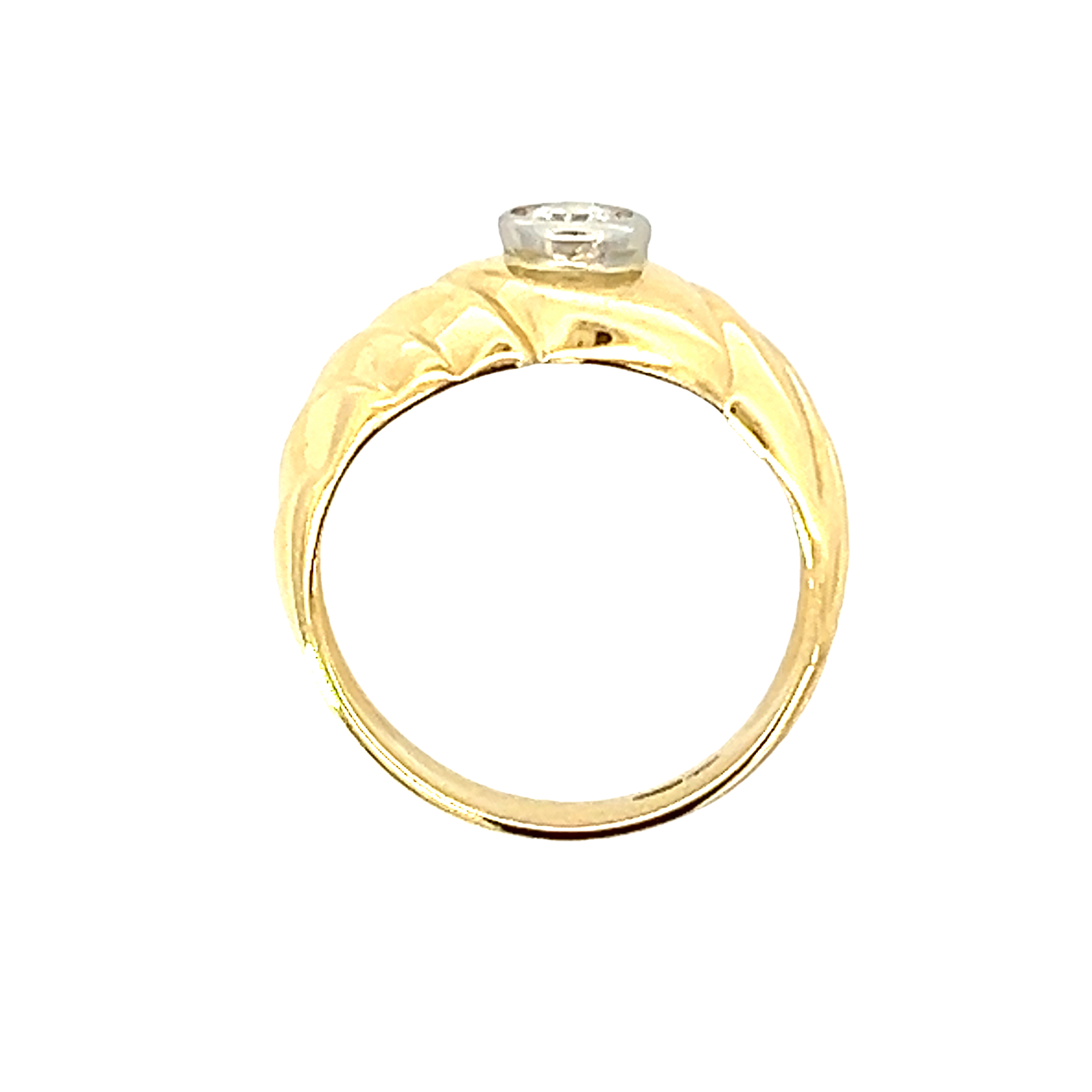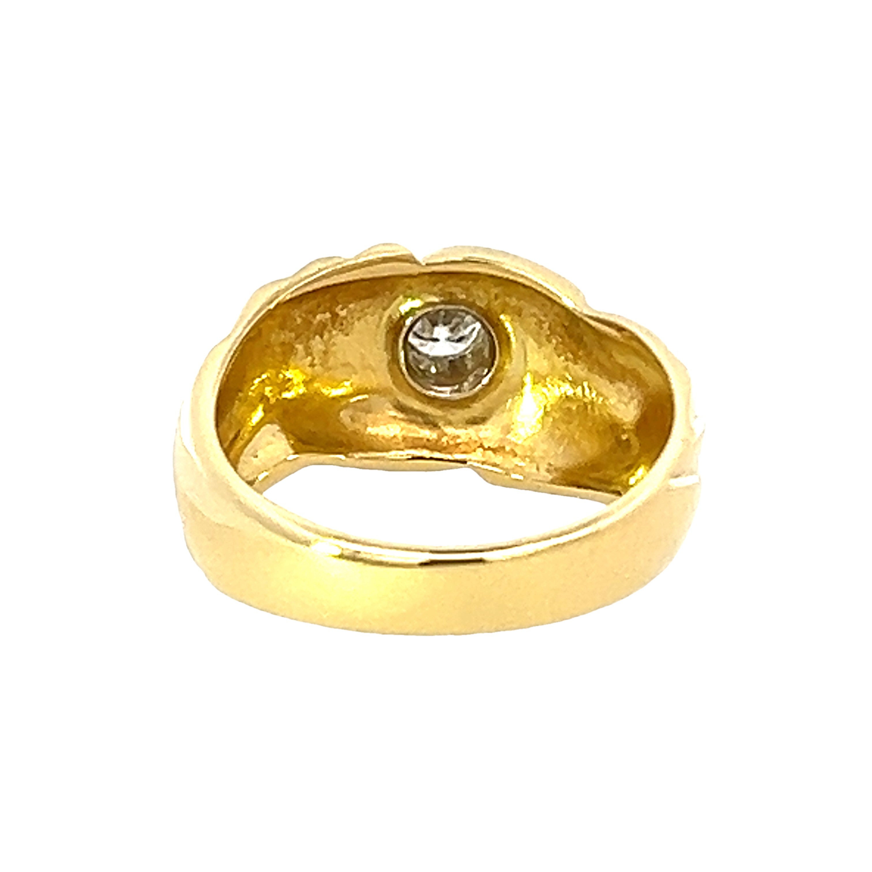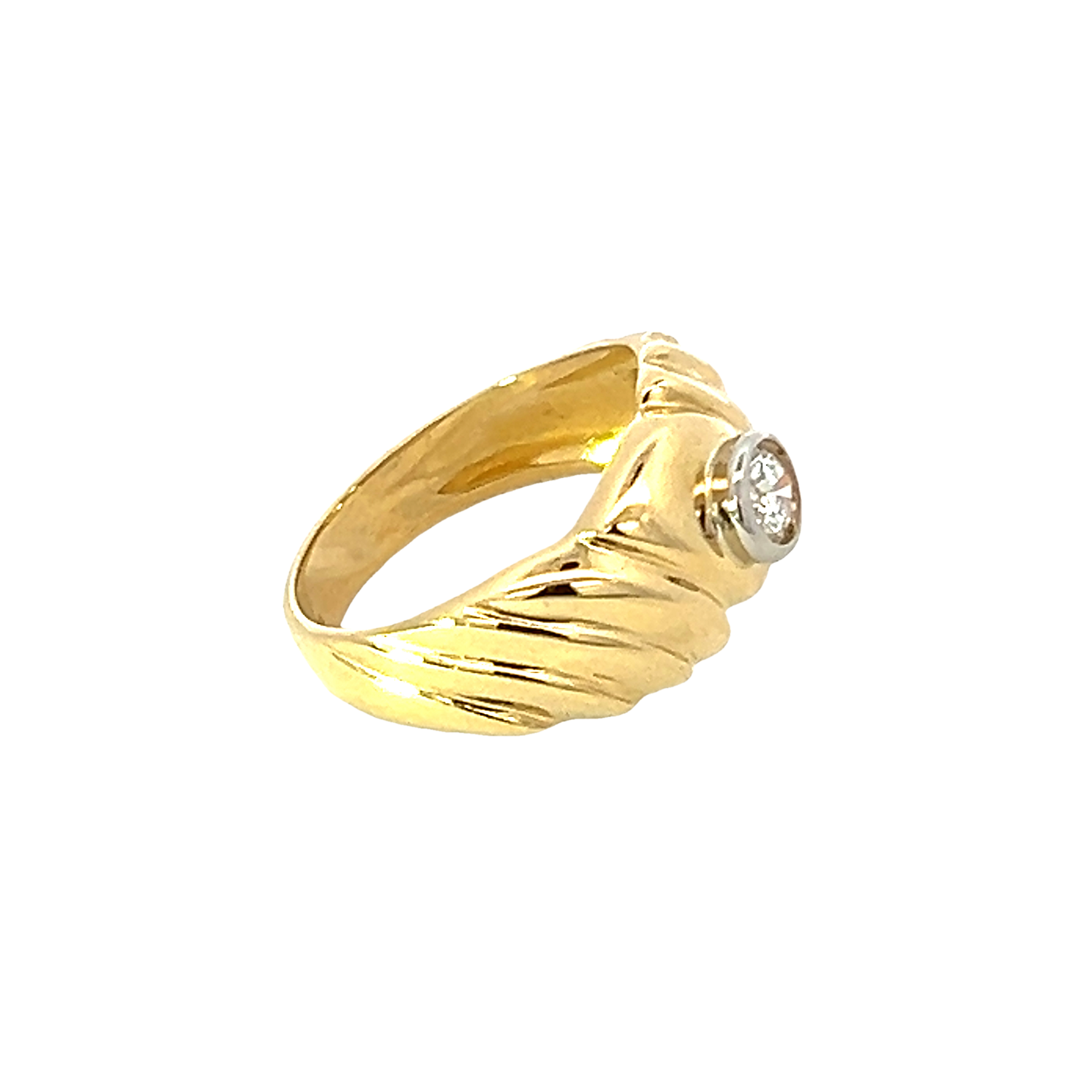 A modern chunky 18 carat yellow gold ring featuring a single round brilliant diamond approximately 0.45ct in white gold rubover setting. Condition: Excellent Era: Vintage Approximate dimensions: 10mm width Finger size N1/2 Weight: 6.59 grams