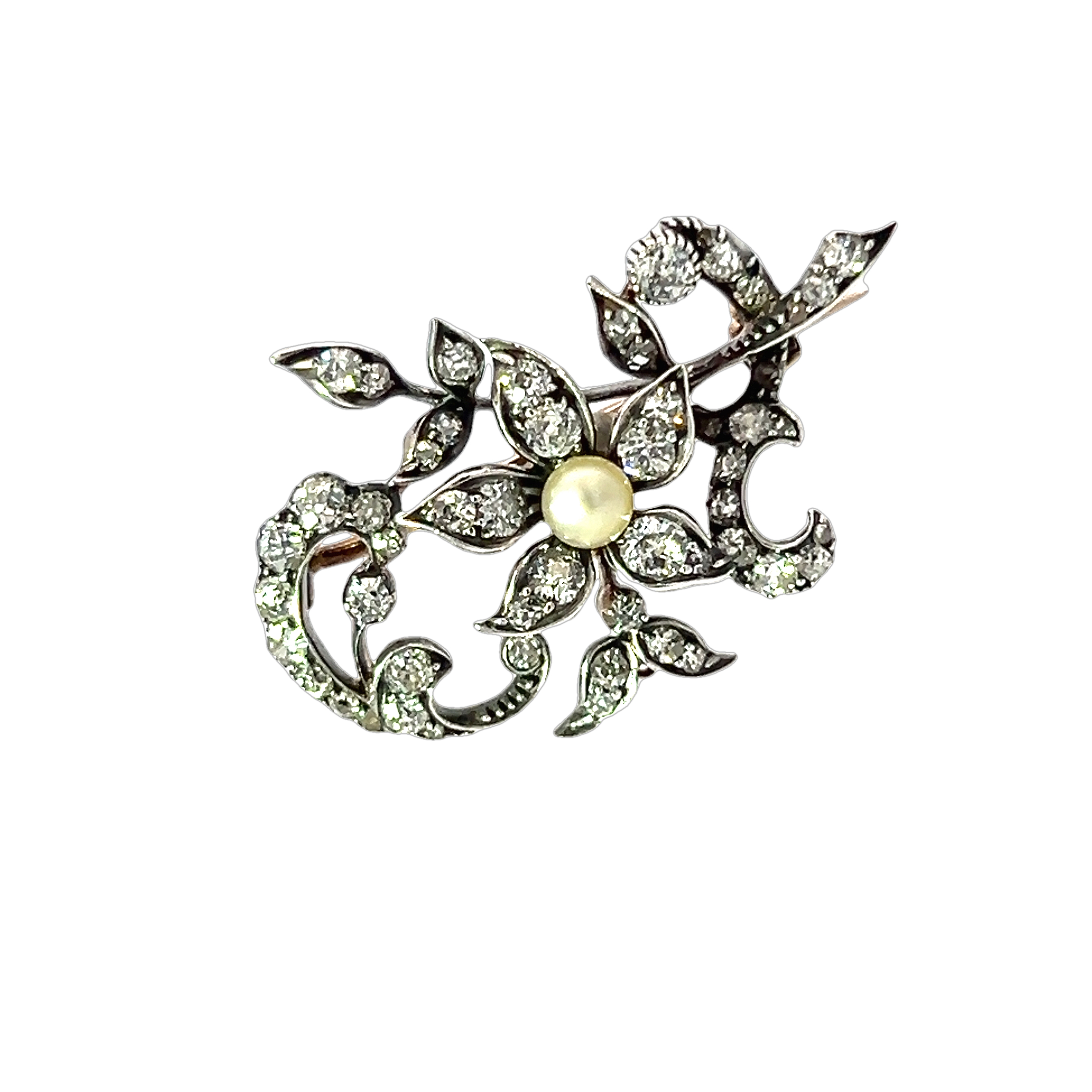 A charming Victorian brooch featuring a forget-me-knot flower set with a central pearl (likely to be natural due to date of piece) and surrounded by a spray of diamond set leaves and floral decoration. The forget-me-knot flower symbolises love and devotion bringing a beautiful sentiment to this piece. Set with old cut diamonds ranging from H to J in colour and handset into silver back with gold. The brooch is fastened with a classic pic and is sure to catch the sunlight and sparkle in the unique way that old cut diamonds do. Condition: Excellent Era: Victorian circa 1840-1870 Approximate dimensions: 3.50 x 2.50 cm Weight: 5.82 grams