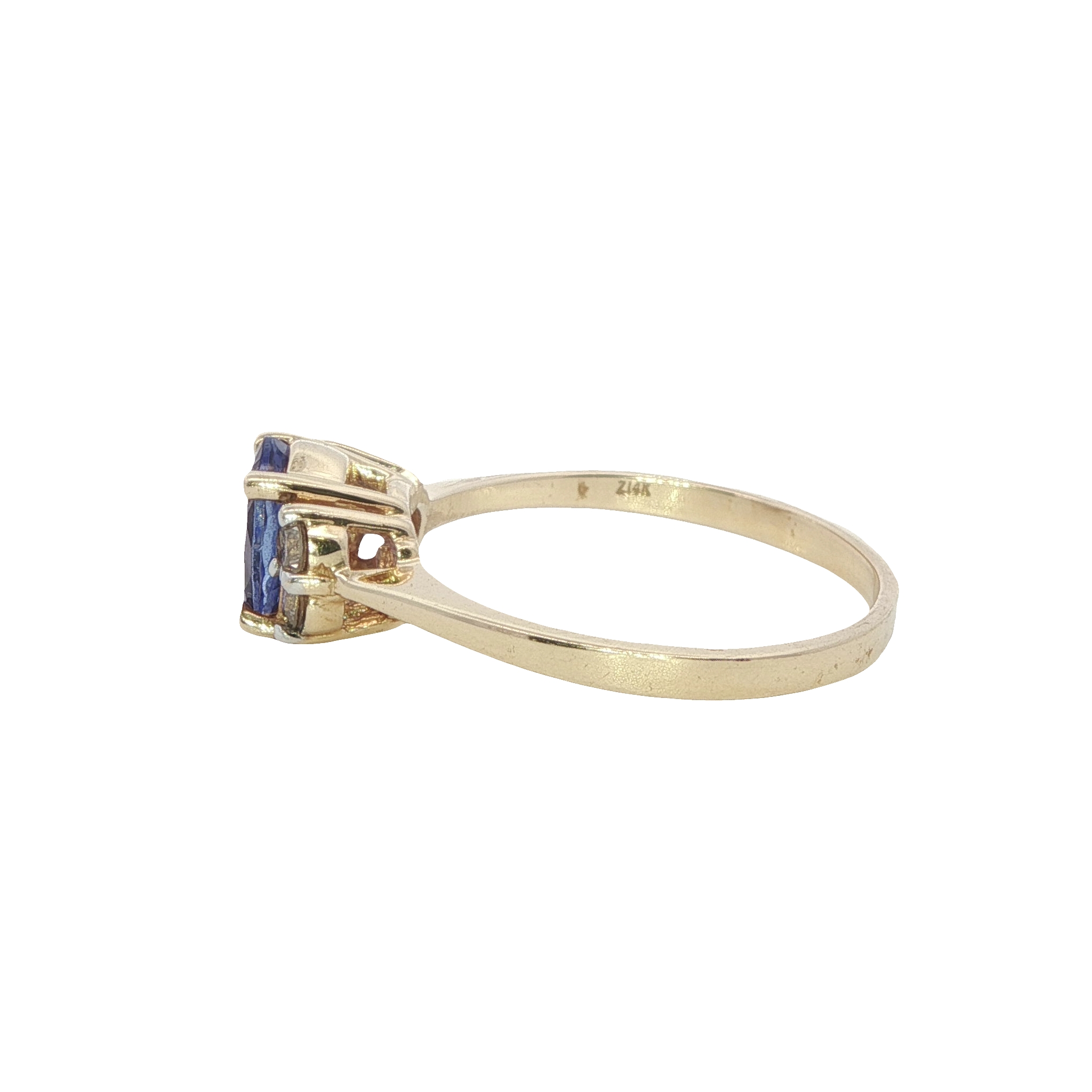 A modern 14ct yellow gold ring featuring an oval tanzanite in a claw setting, framed by four diamonds in claw settings.