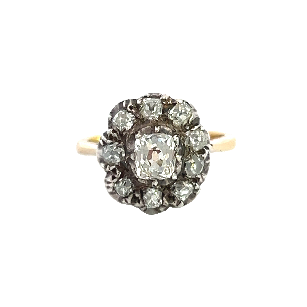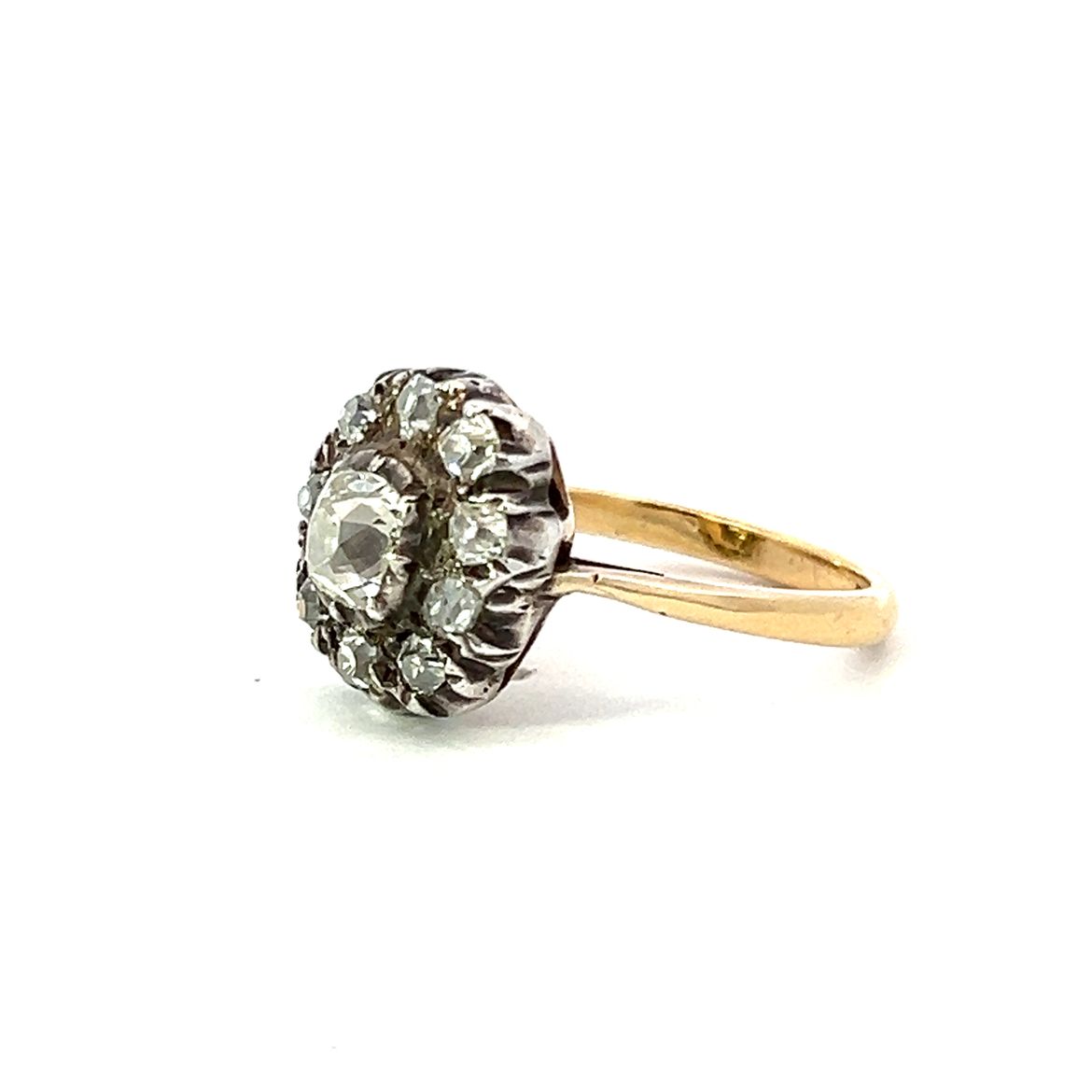 A beautiful 18 carat yellow gold and silver antique ring featuring a central old cut diamond in a cut down collet setting surrounded by a cluster halo of old cut diamonds mounted on a 18ct yellow gold shank. The central old cut is approximately 0.60ct. Condition: Very Good Era: Early Victorian with possible modern replacement shank Finger size: M1/2 Weight: 5.79 grams