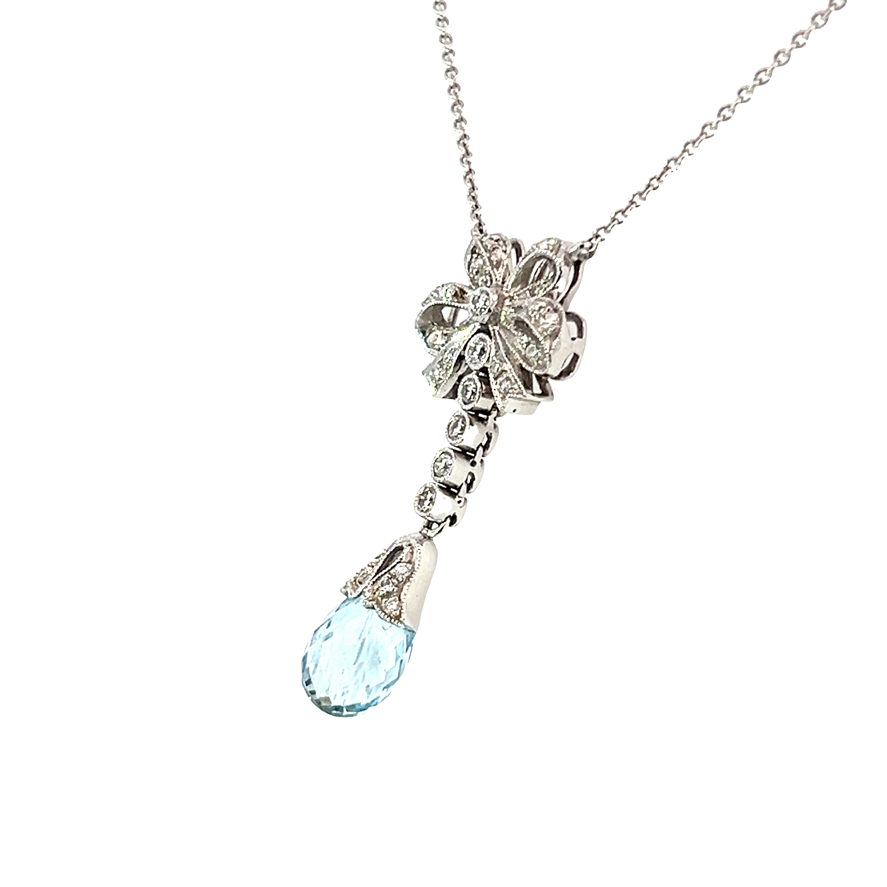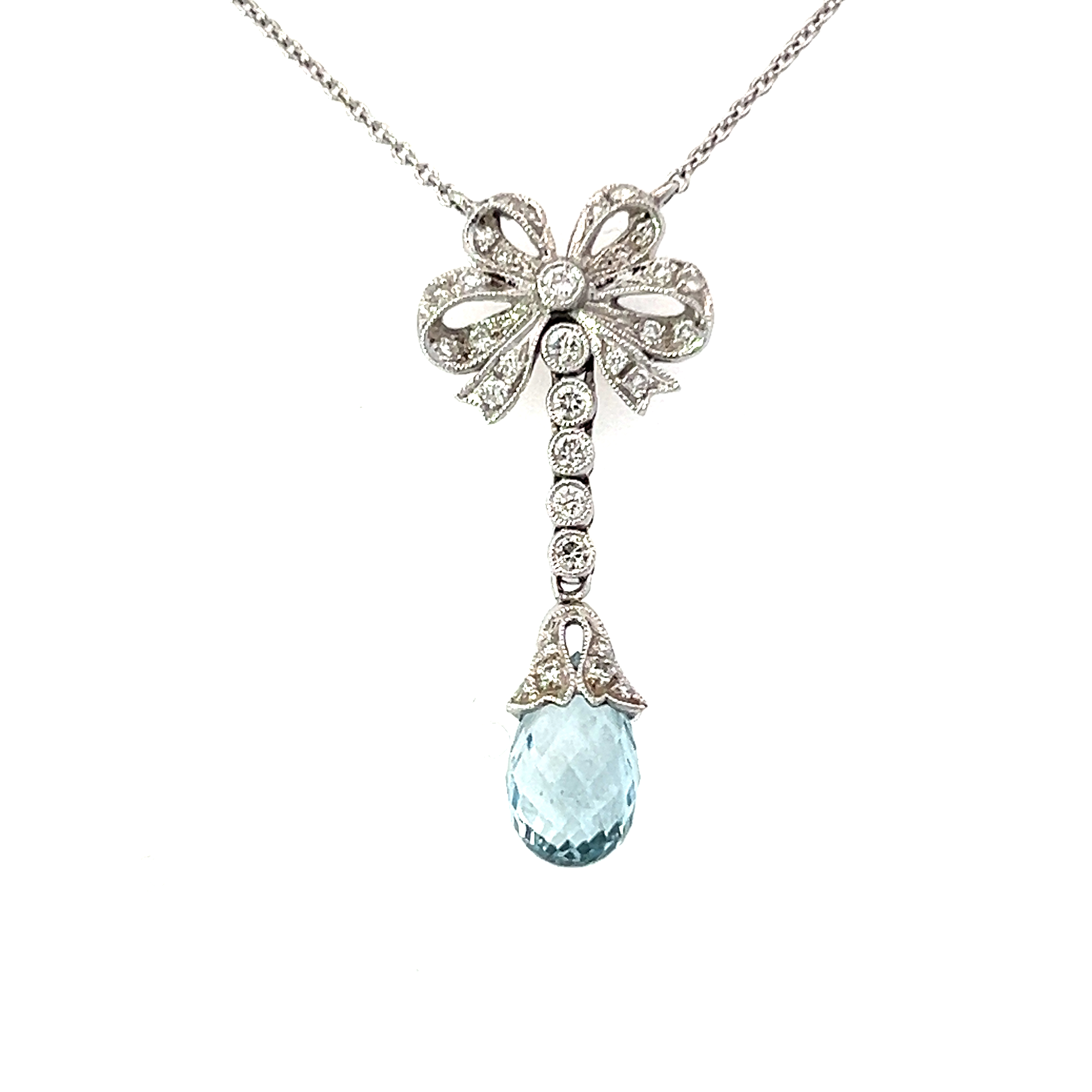 A vintage pendant featuring a diamond set bow design with five diamonds in a rubover set with millgrain with a briolette cut aquamarine measuring 10mmx6mm. Overall pendant measures 31mm x 13mm with a fine trace chain measuring 15cm.