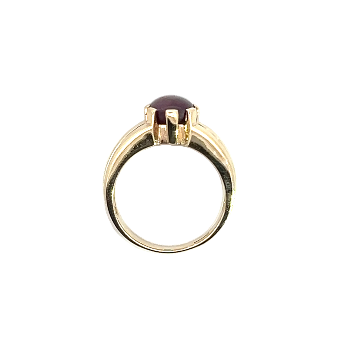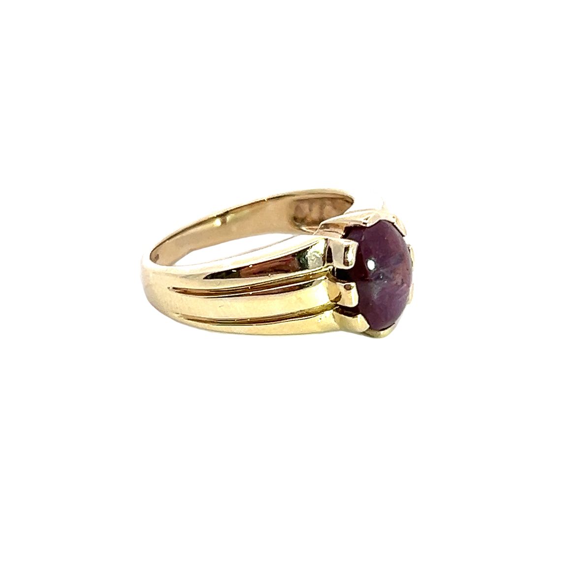 A chunky 9 carat yellow gold ring featuring an oval cabochon star ruby gemstone set in a claw setting and chunky wide band with engraved line detail. Condition: Excellent Era: Modern Approximate dimensions: 10.50 x 8.50mm Finger size: N Weight: 4.96grams