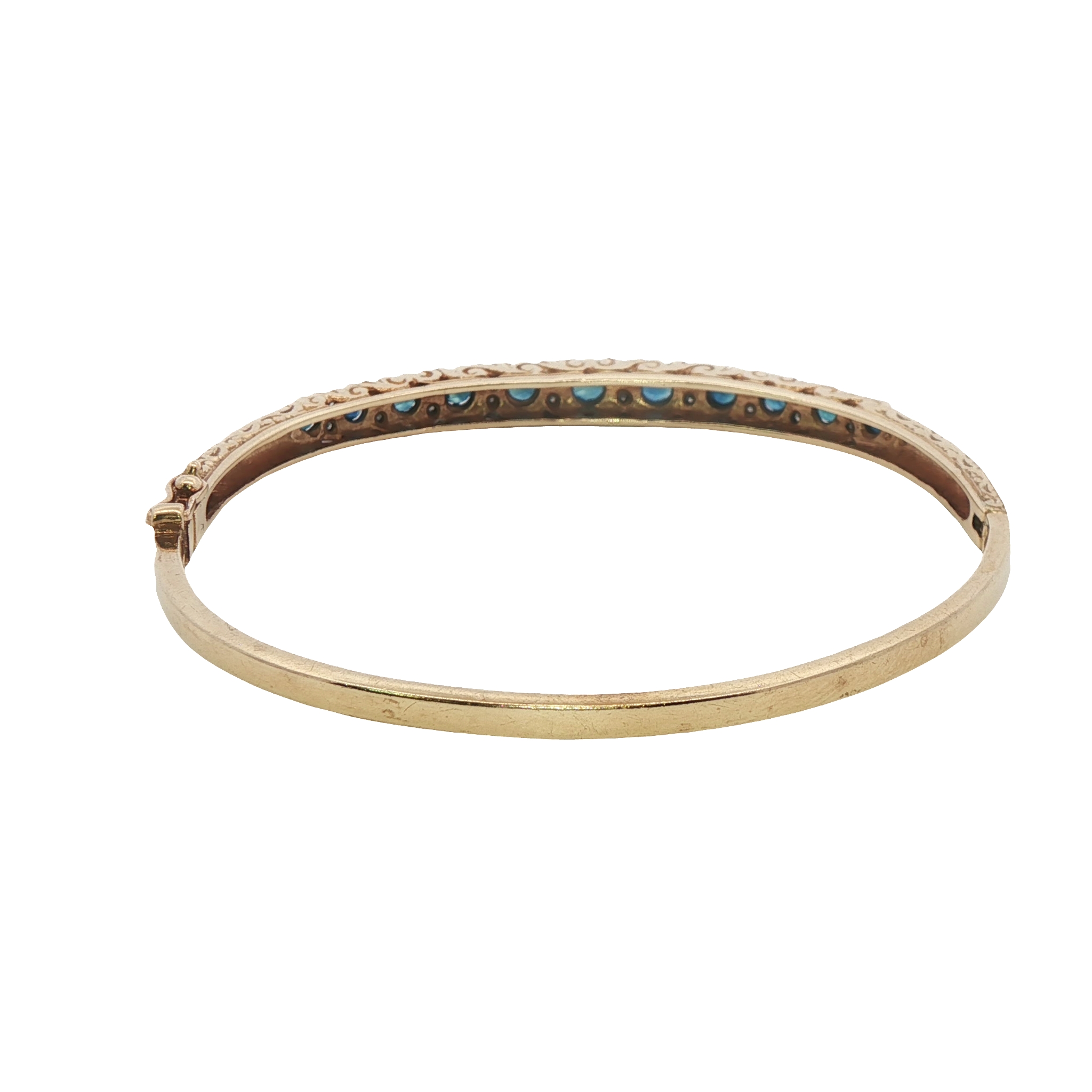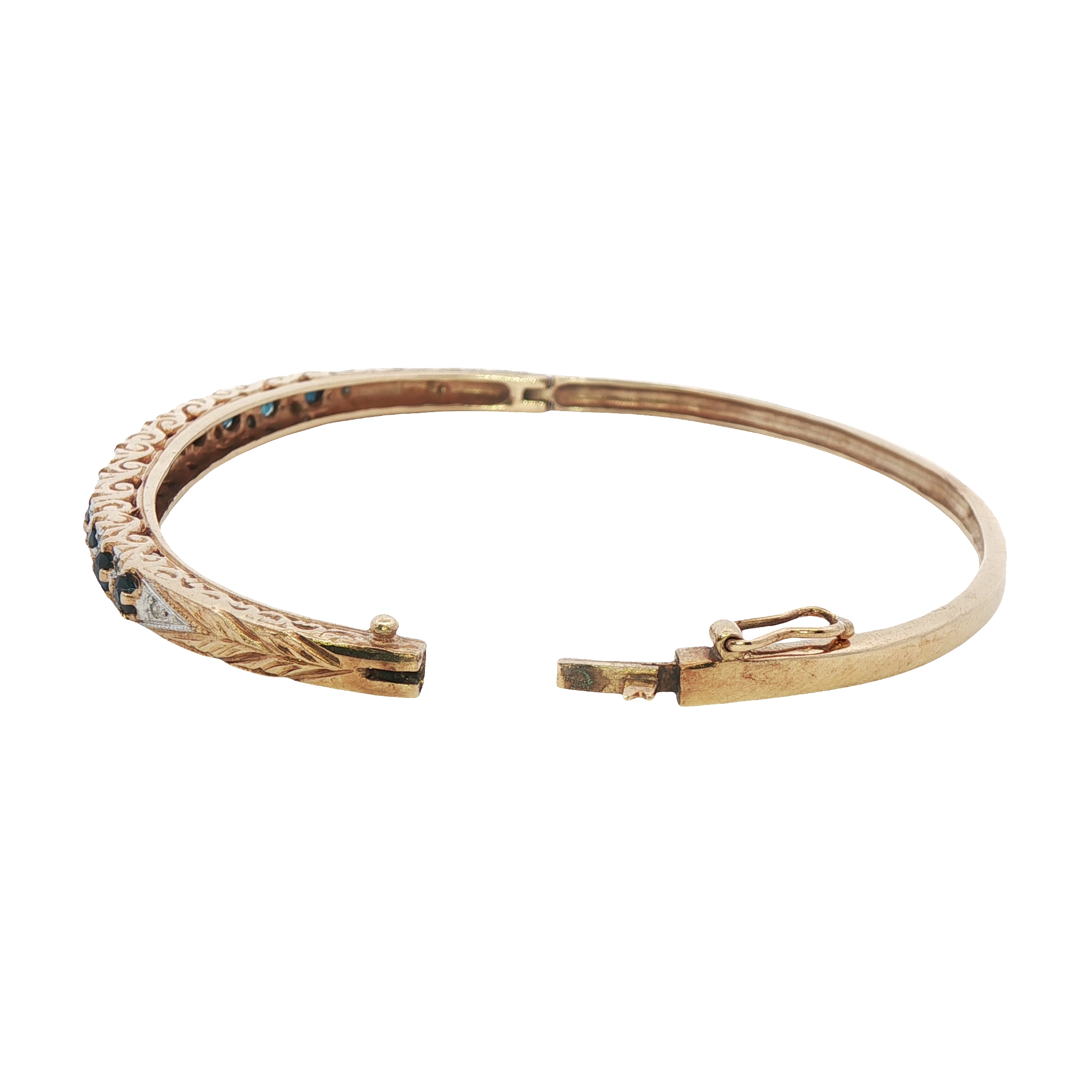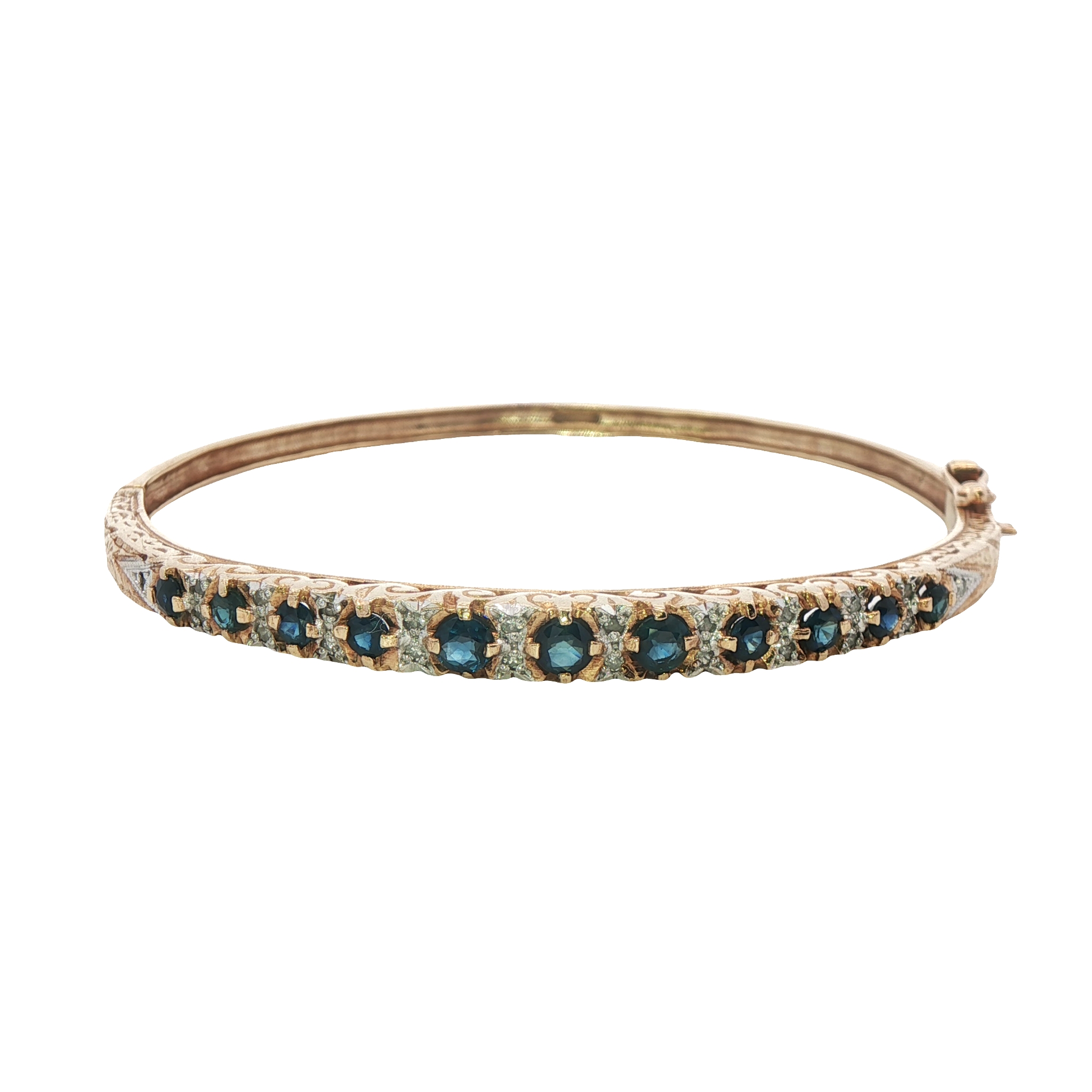A pretty vintage 9ct yellow gold bangle featuring sapphires and diamonds with decorative detailing. Fastened with a box clasp and extrage figure of eight safety catch.