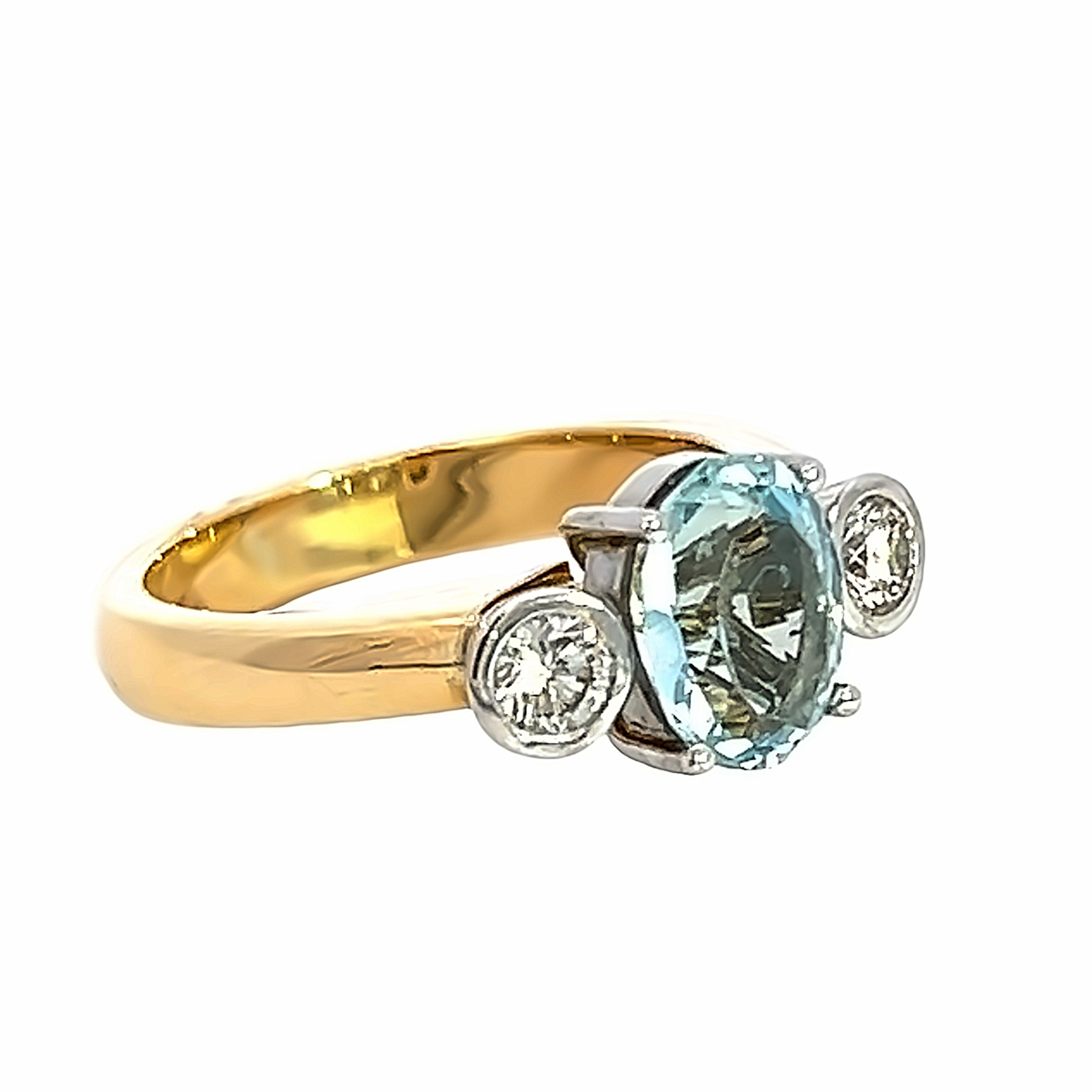 A modern 18 carat yellow gold ring featuring an oval faceted aquamarine measuring approximately 9.85 x 8.00mm in a four claw setting framed by two modern round brilliant diamonds in rub-over white gold settings. Condition: Excellent Era: Modern Diamond details: approximately 0.35ct each Finger size: T Weight: 9.87 grams