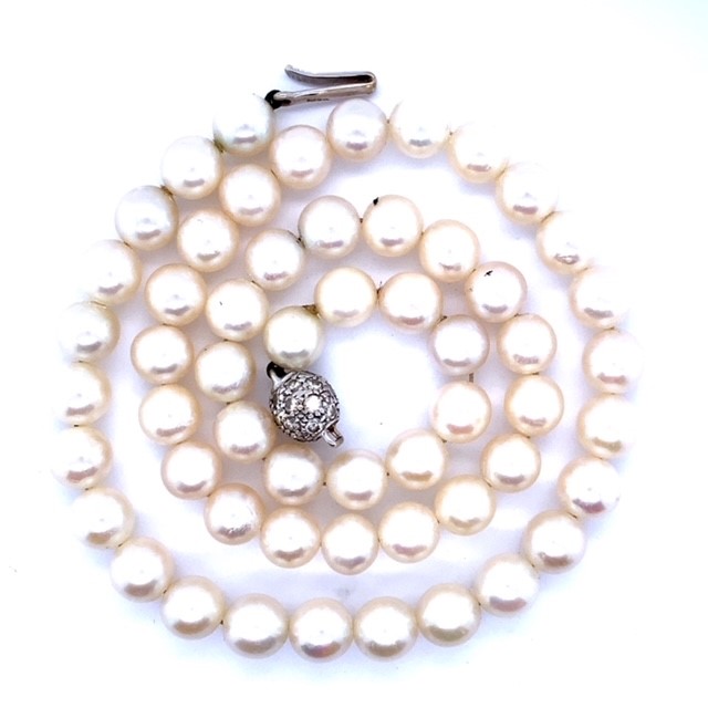 A beautiful pearl necklace featuring freshwater pearls approximately 7 to 8mm in size with a white gold diamond pave set ball shape clasp. Overall length approximately 24cm
