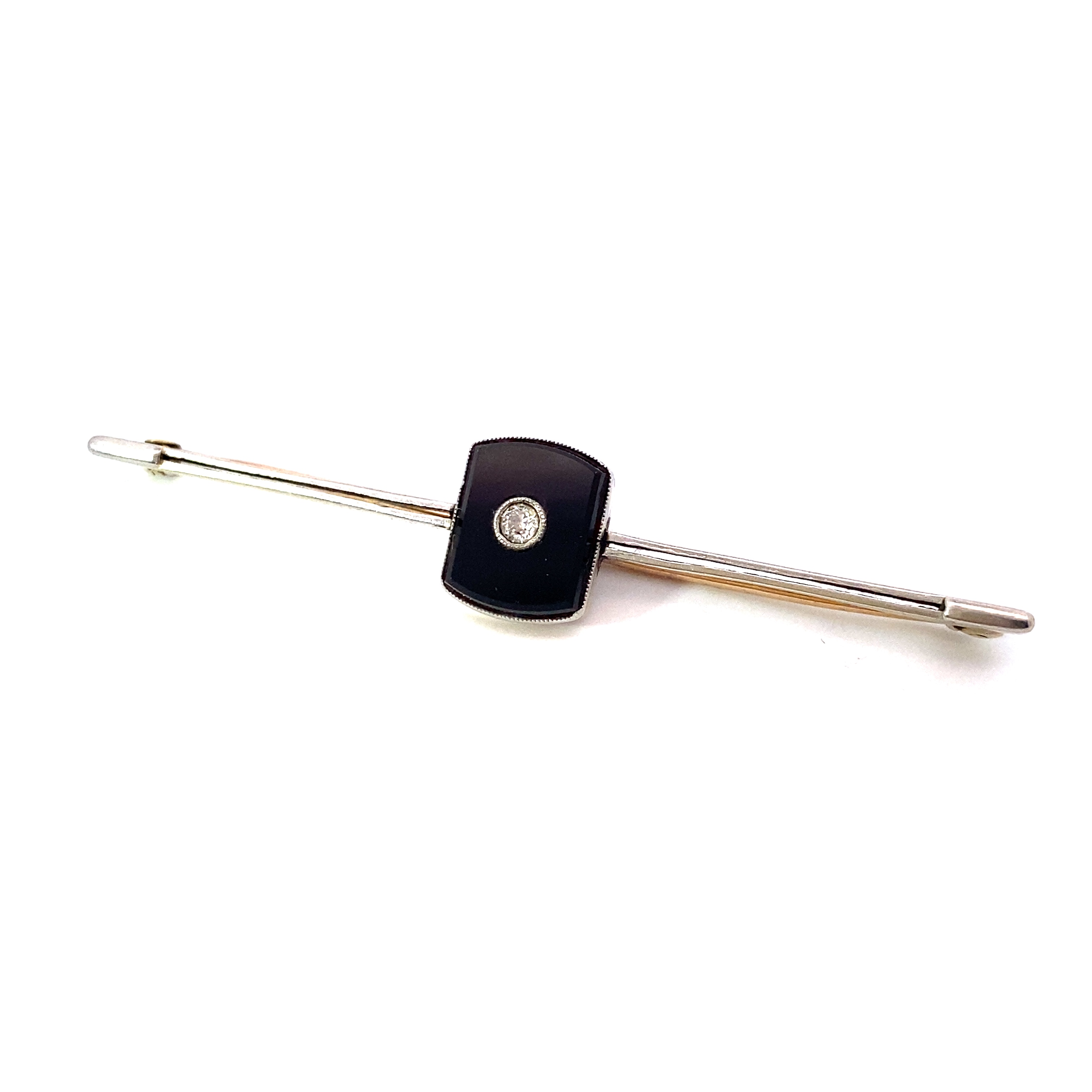 An antique brooch featuring an onyx shield shape set with a single old cut diamond measuring approximately 0.05ct in a rubover setting with a millgrain edge detail. The brooch has a a typical pin with a safety clasp.