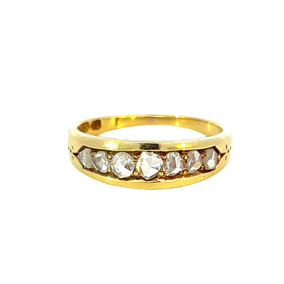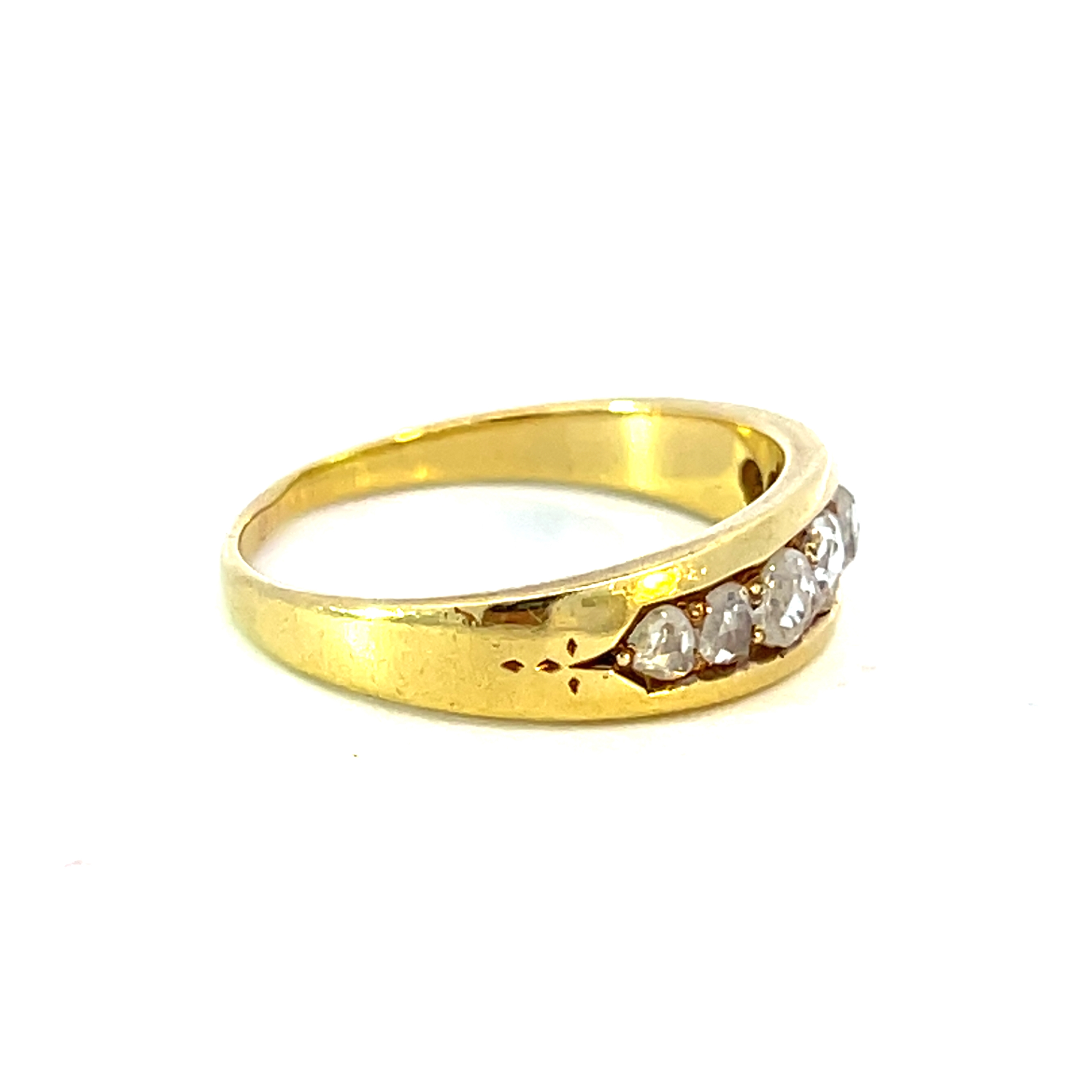 A beautiful antique ring crafted in 18ct yellow gold featuring a row of tapering rose cut diamonds set into grain set channel in the ring, finished with the sweetest decorative detailing either end.
