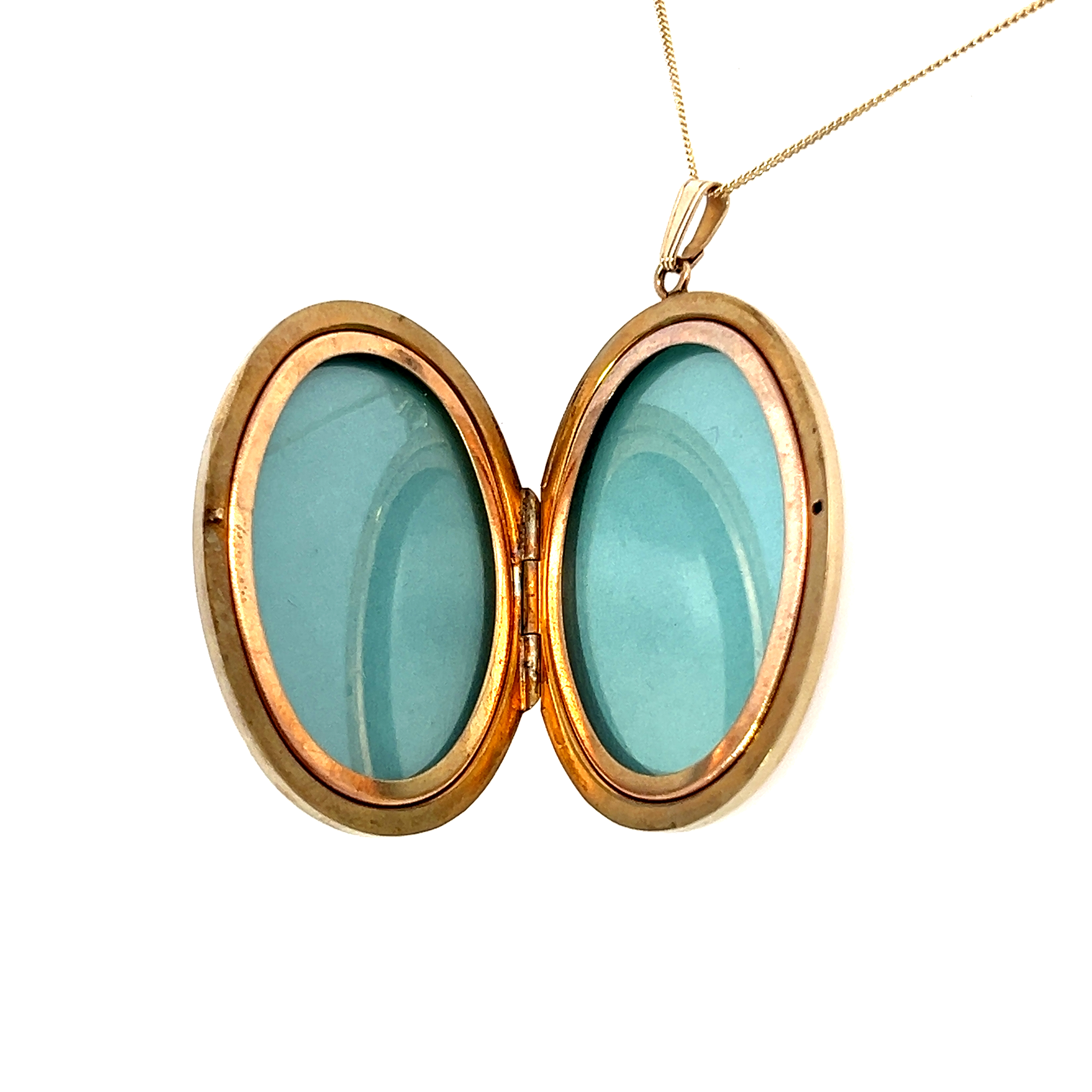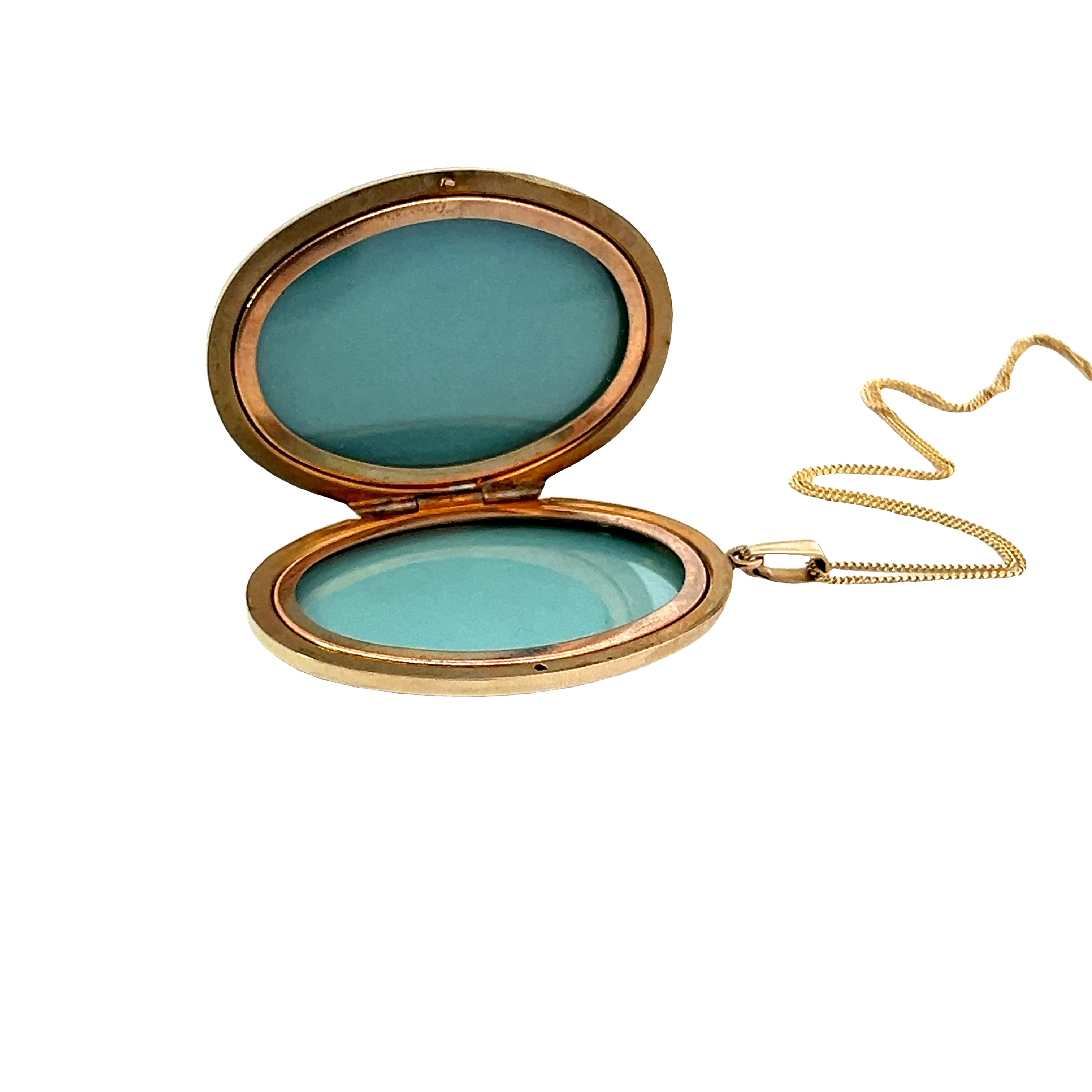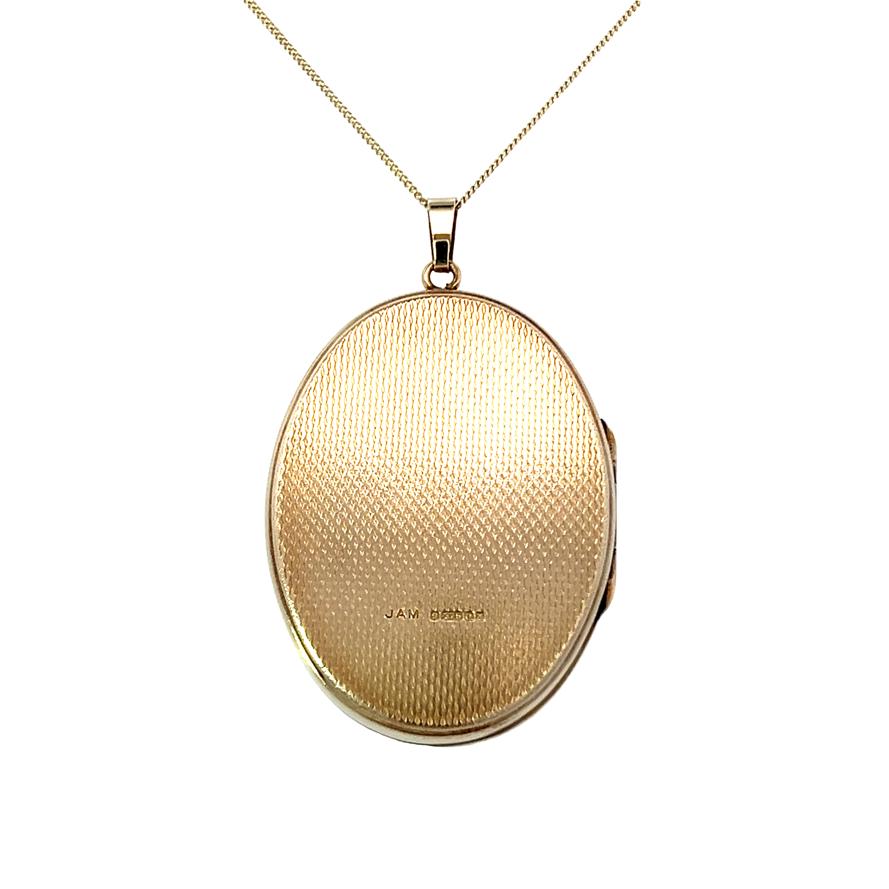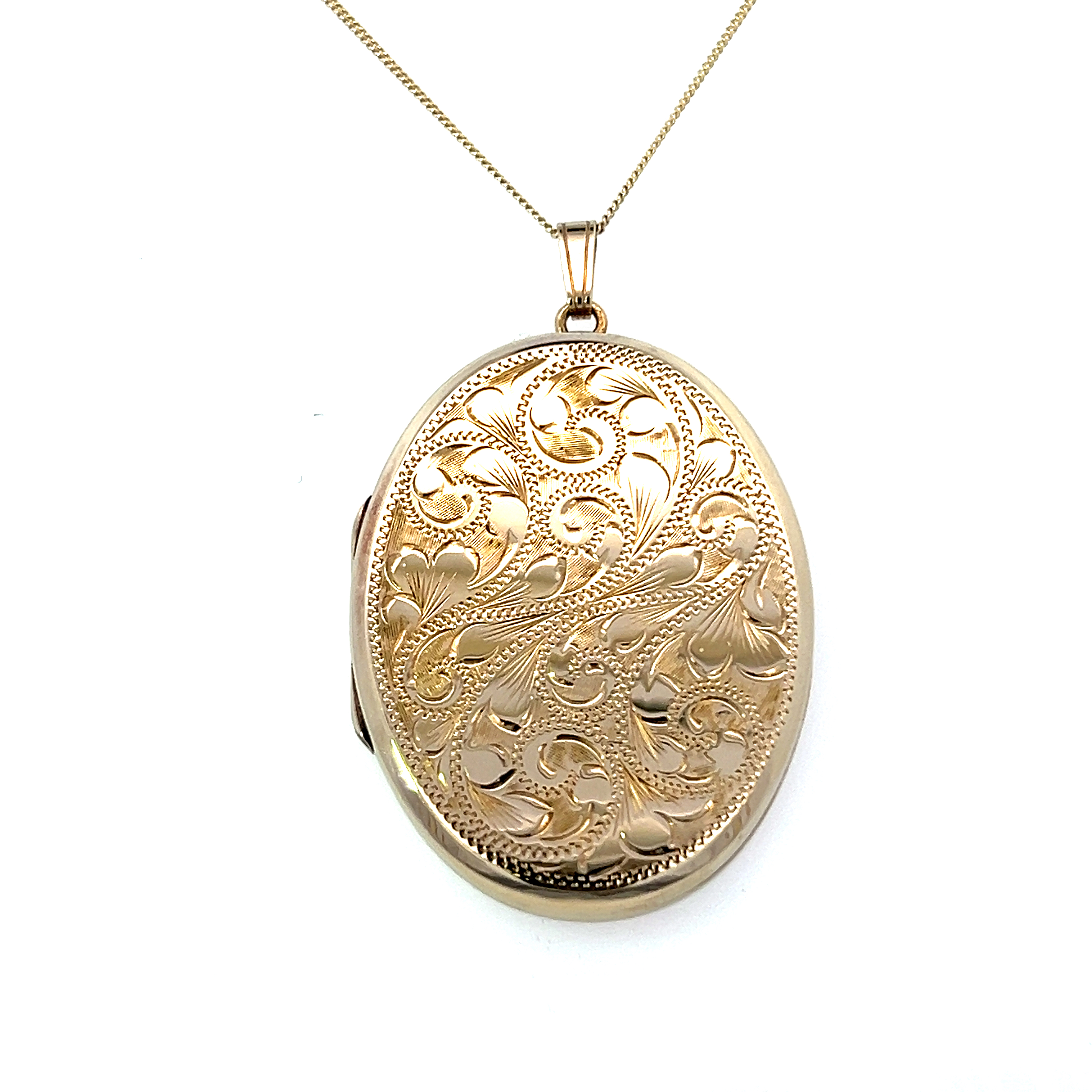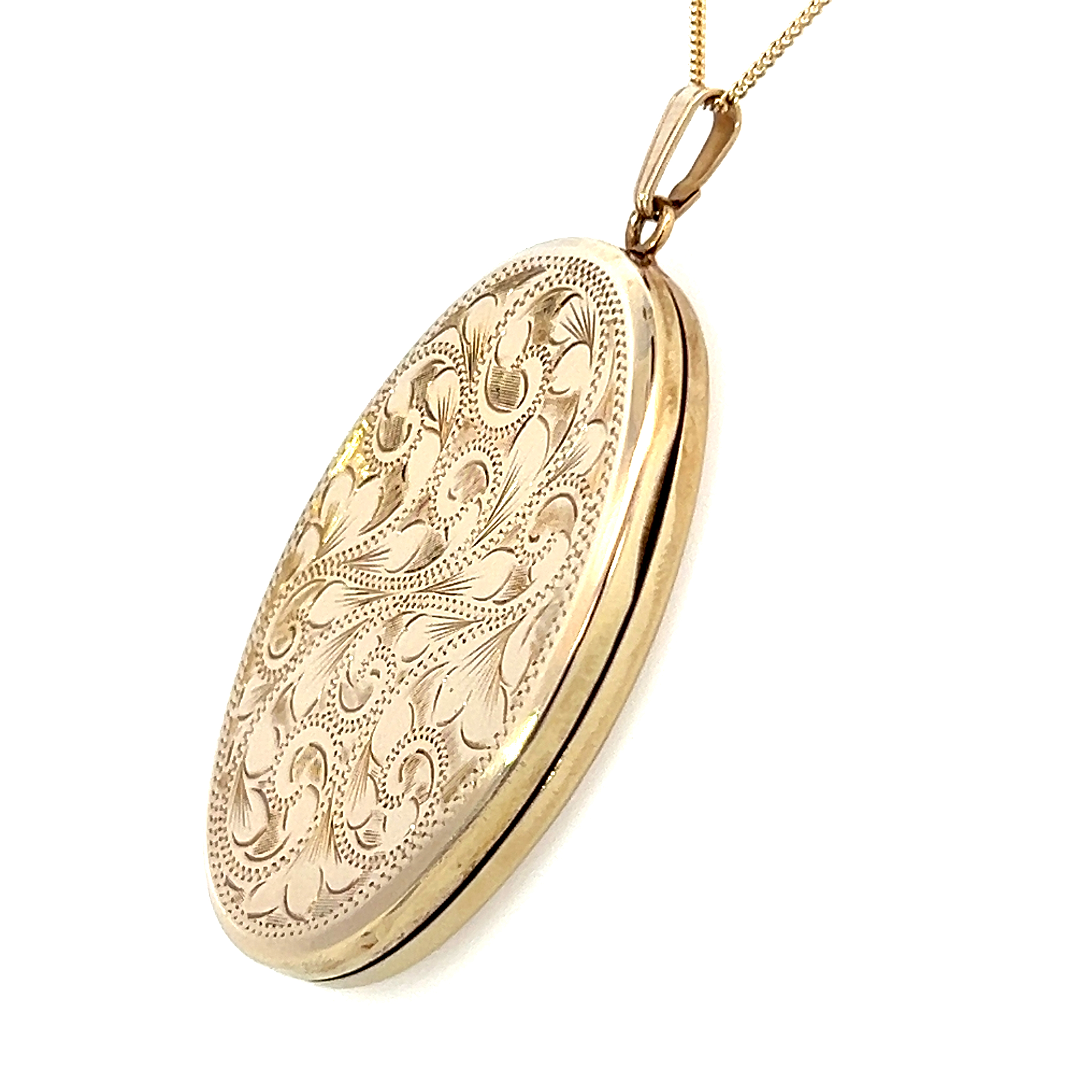 A vintage 9 carat yellow oval design gold locket with engraved floral detail. Approximate measurements 5.50 x 3.00cm Hung on a modeern 9 carat yellow gold chain