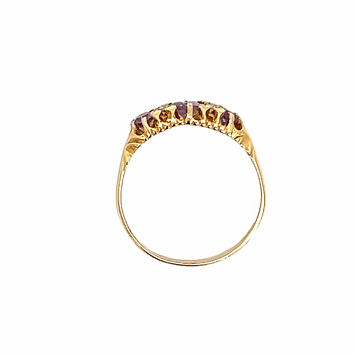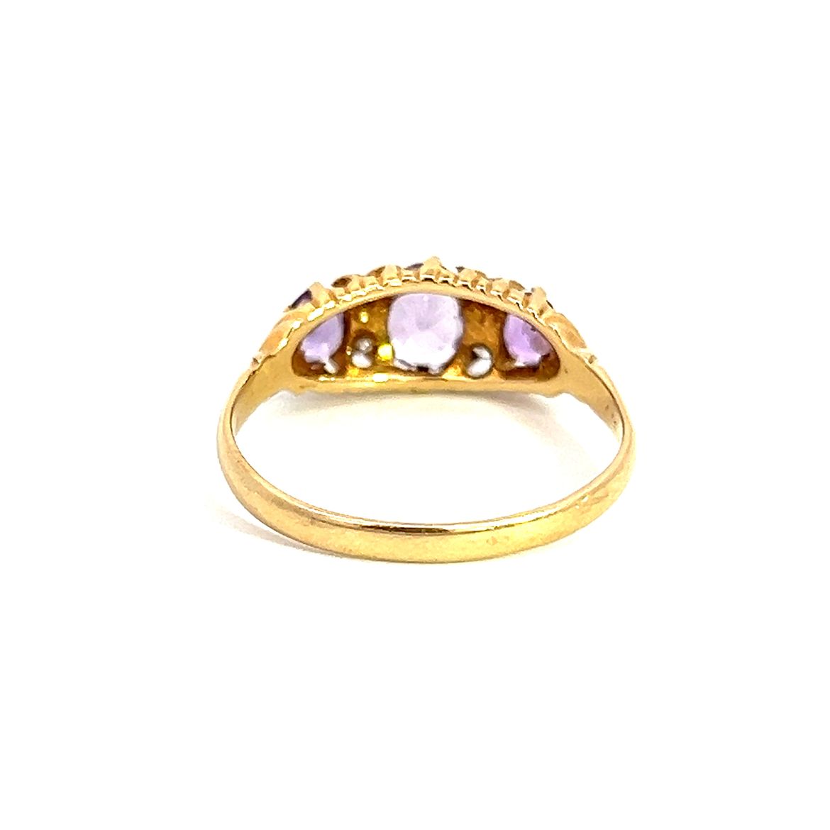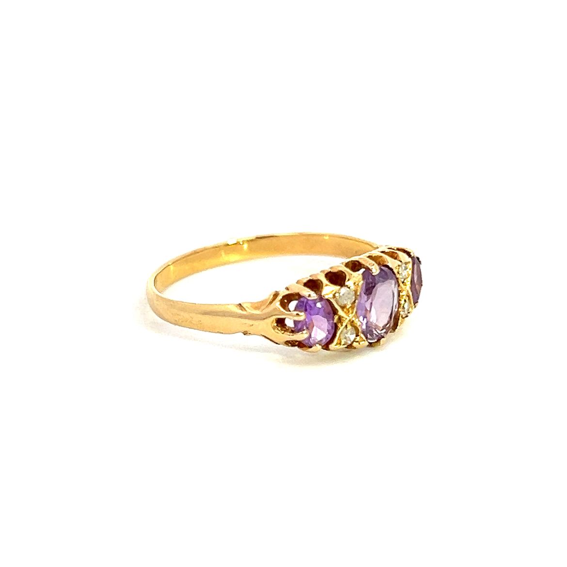A lovely 15ct carat yellow gold ring featuring three oval mix cut amethyst interspersed by four diamonds. The central amethyst measuring approximately 6 x 4 mm and the two outer 4 x 3.5mm. Condition: Very Good Era: Early 20th century Finger size: O Weight: 1.97 grams