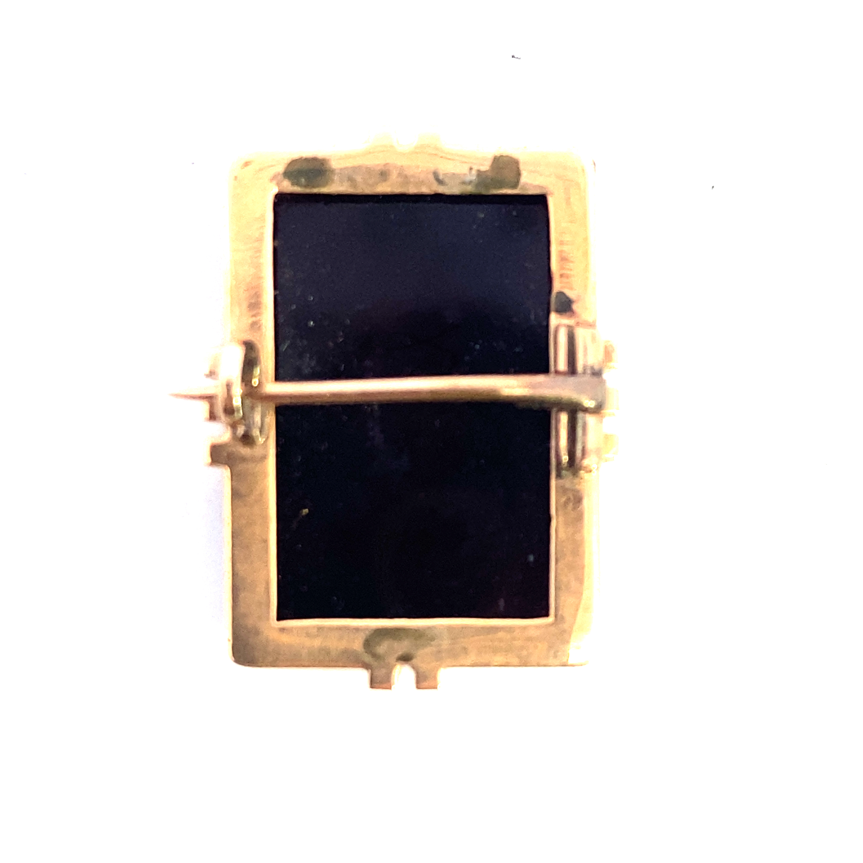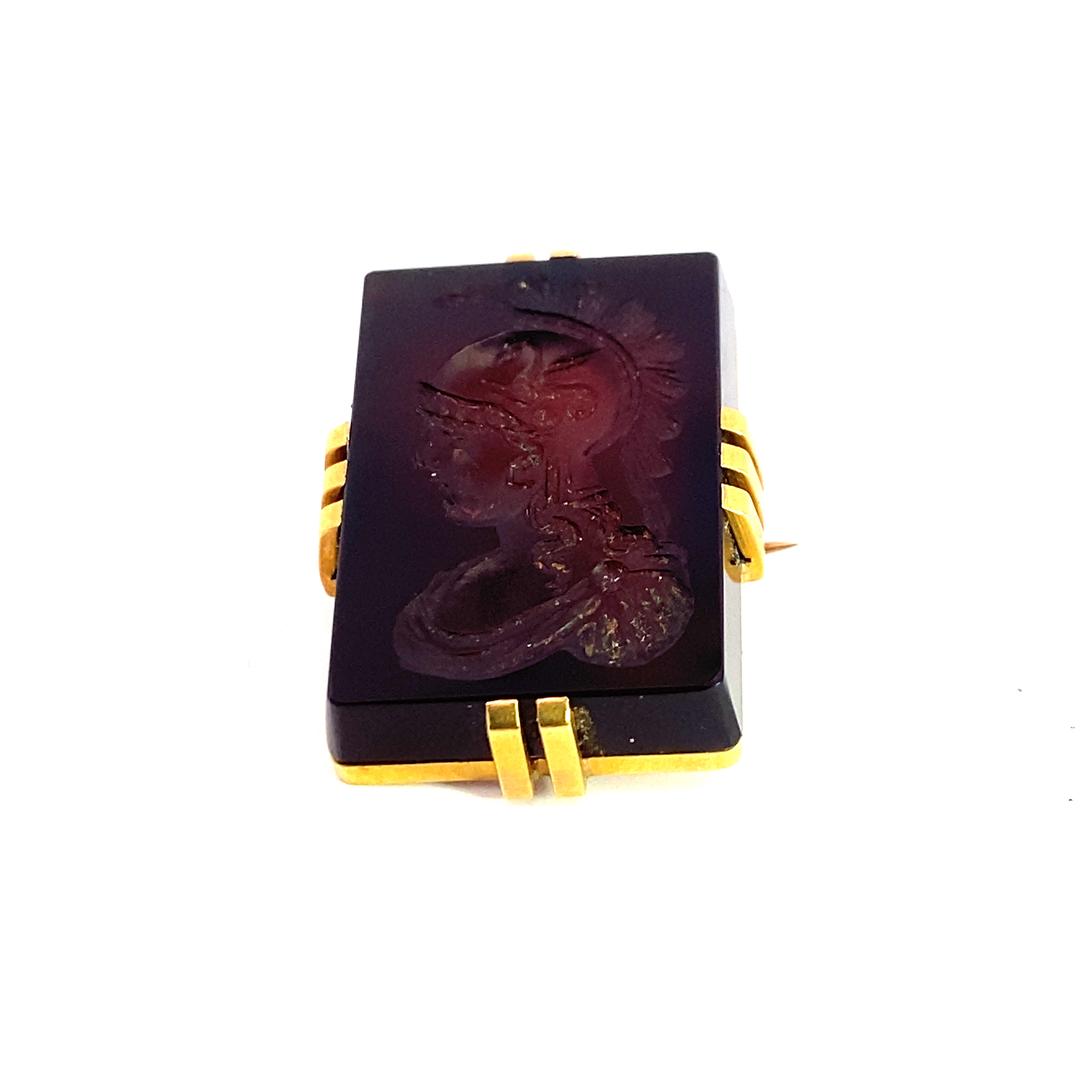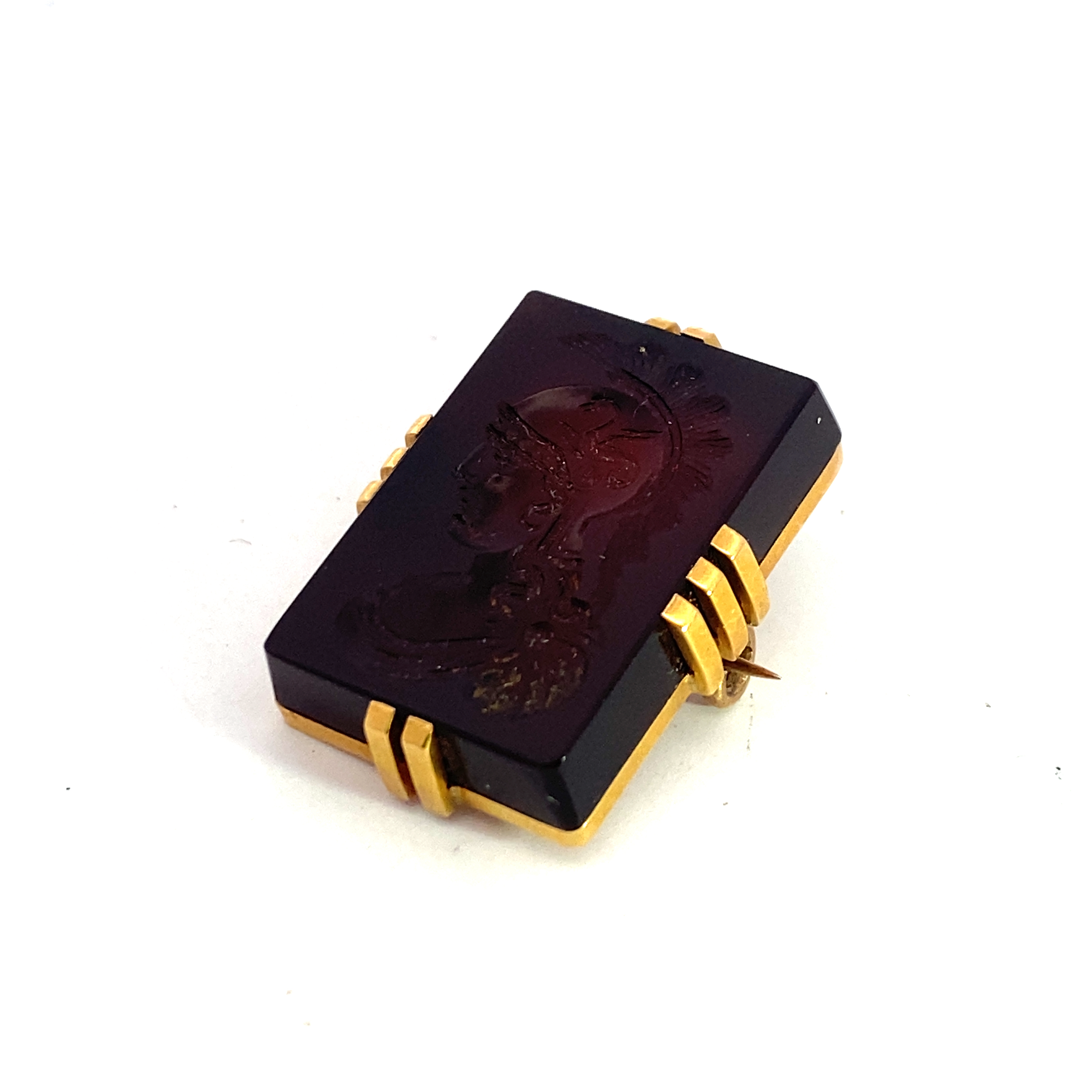 A carnelian rectangle intaglio brooch set in yellow gold depicting a Roman god. Approximate measurements 24 x 17.50 mm