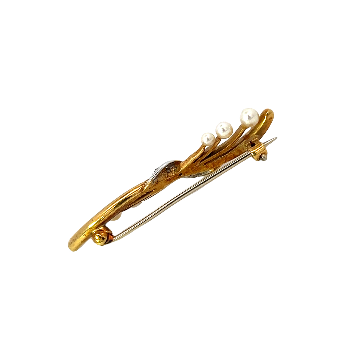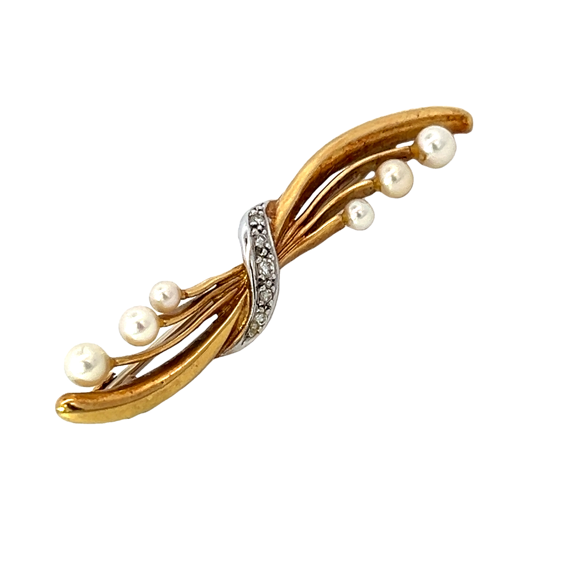 A beautiful vintage 18 carat yellow gold brooch set with graduated sizes of pearls and a grain set diamond detail to the centre. The makers mark of Alabaster and Wilson is seen to the back of the brooch. Condition: Excellent Era: hallmarked 1991 Approximate dimensions: 4.50 cm in length Weight: 5.80 grams
