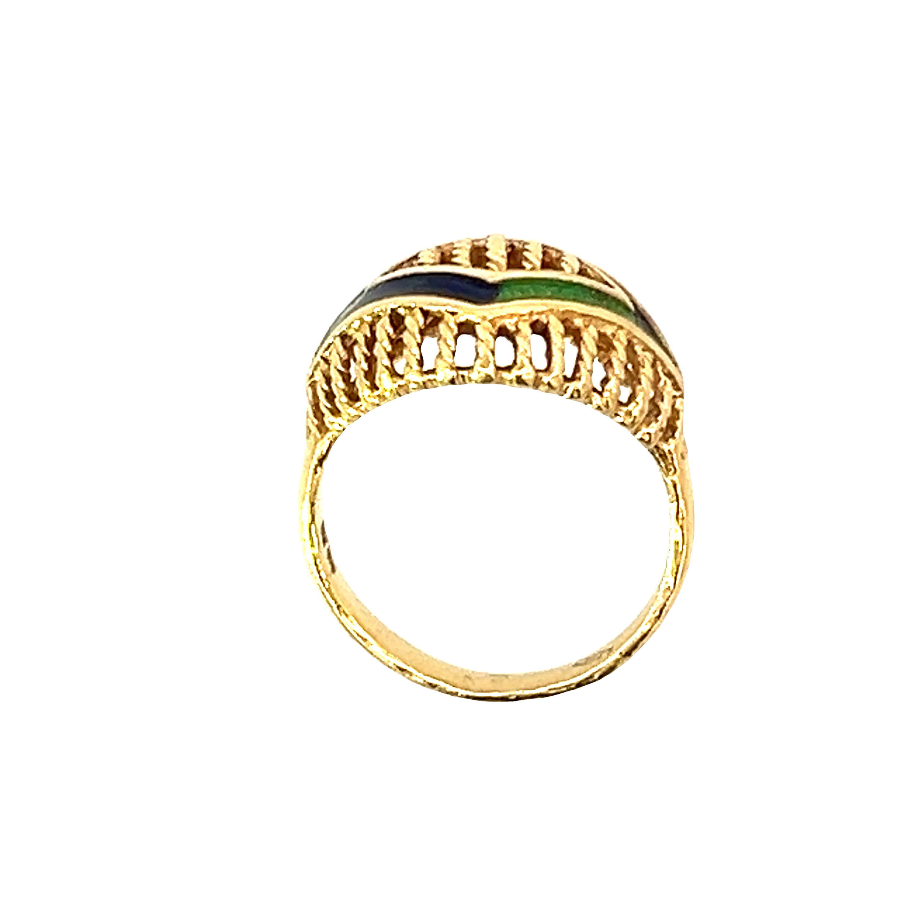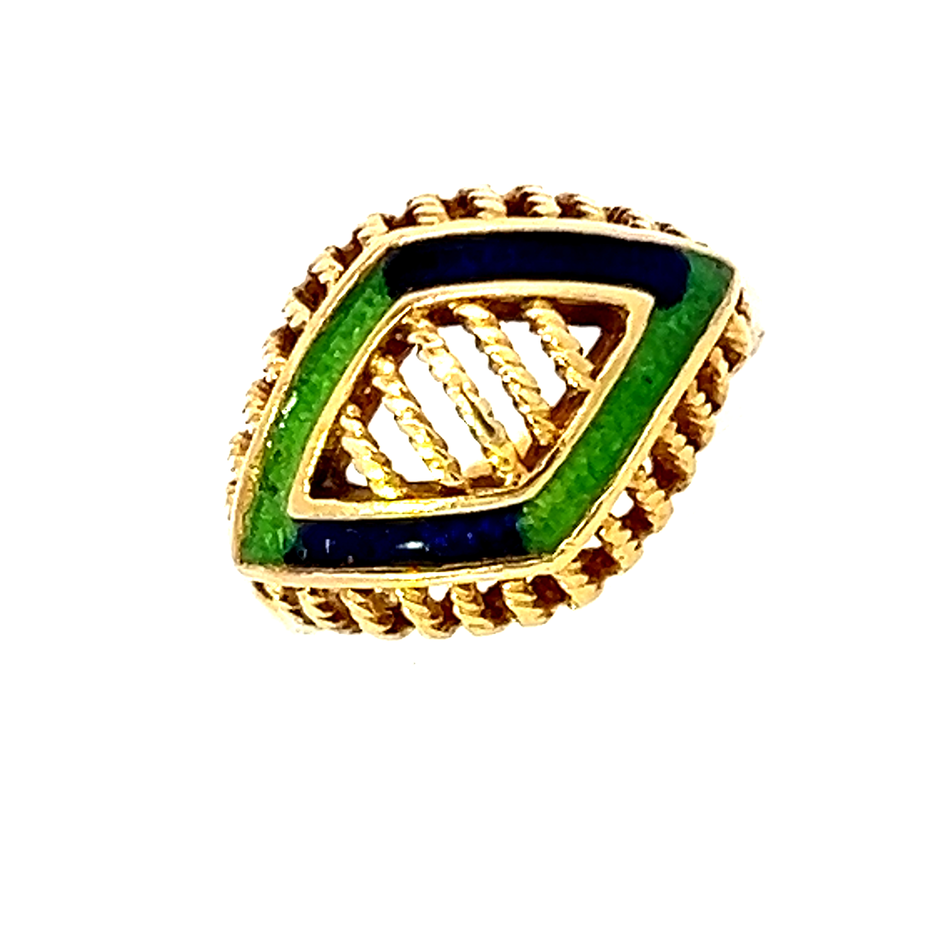 An unusual gold ring (tested as 18ct) featuring a two tone green and blue enamel design. Condition: Excellent Era: Modern Approximate dimensions: 18 x 13.5 mm Finger size: L Weight: 5.17 grams