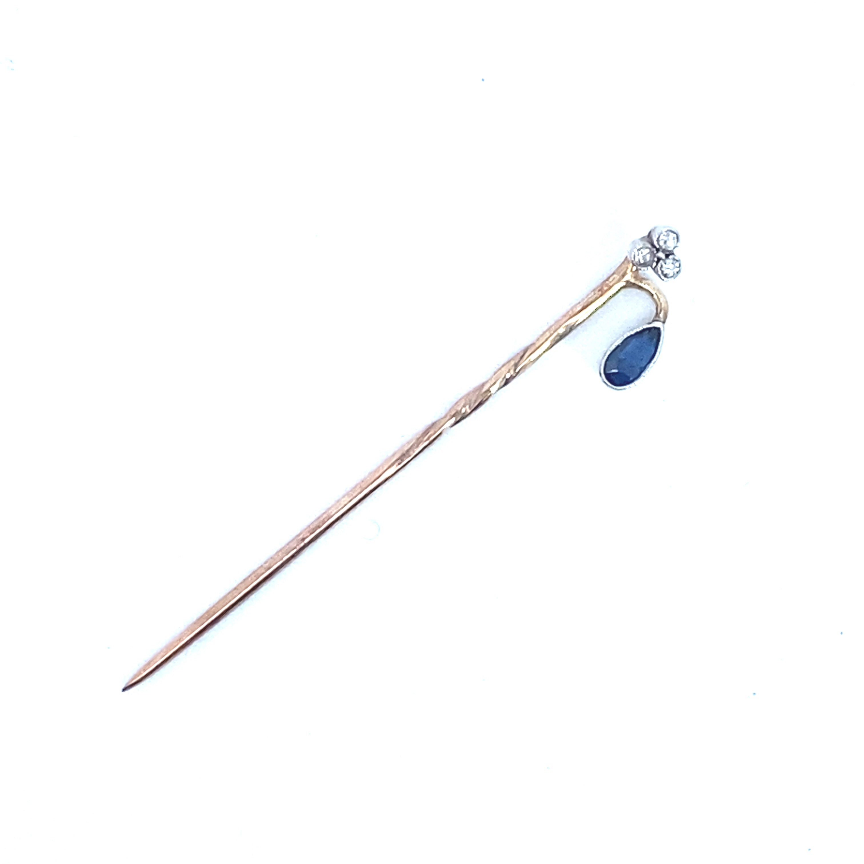 A yellow gold antique stick pin featuring a sapphire and trilogy of diamonds. Length 5cm Gross weight 1.08 grams