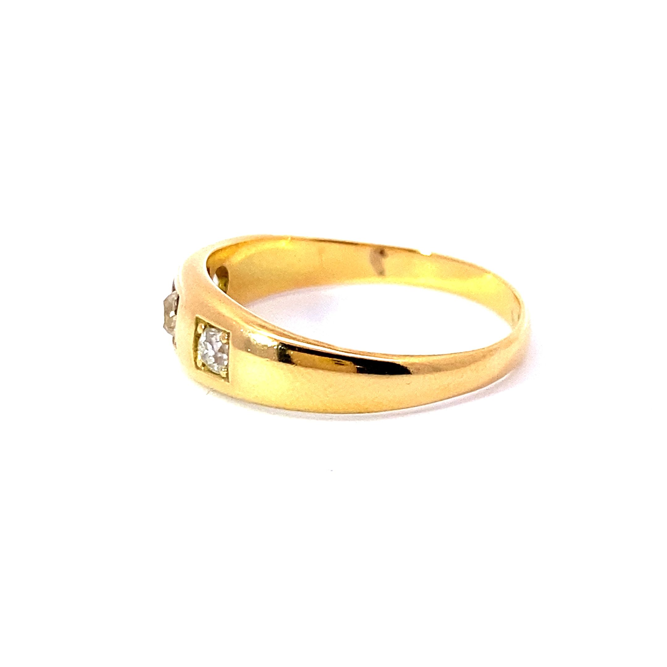 A lovely antique ring featuring three old cut diamonds totalling approximately 0.16ct in an individual grain setting style to a tapered domed band measuring 6mm wide to 2.5mm at the back of the shank. Finger size Q.