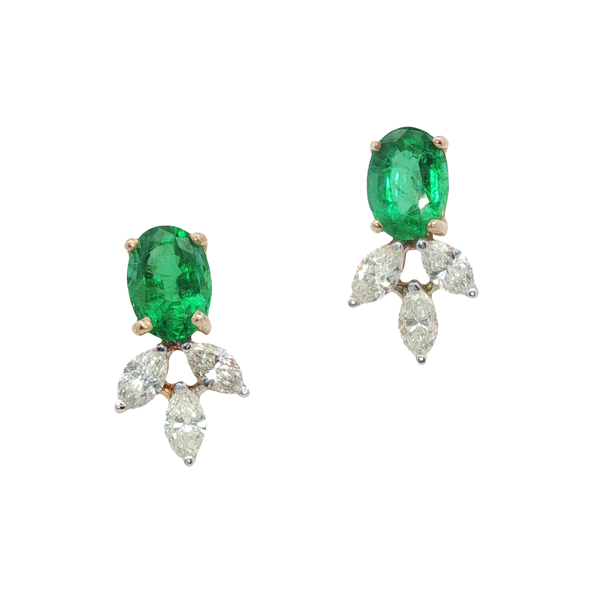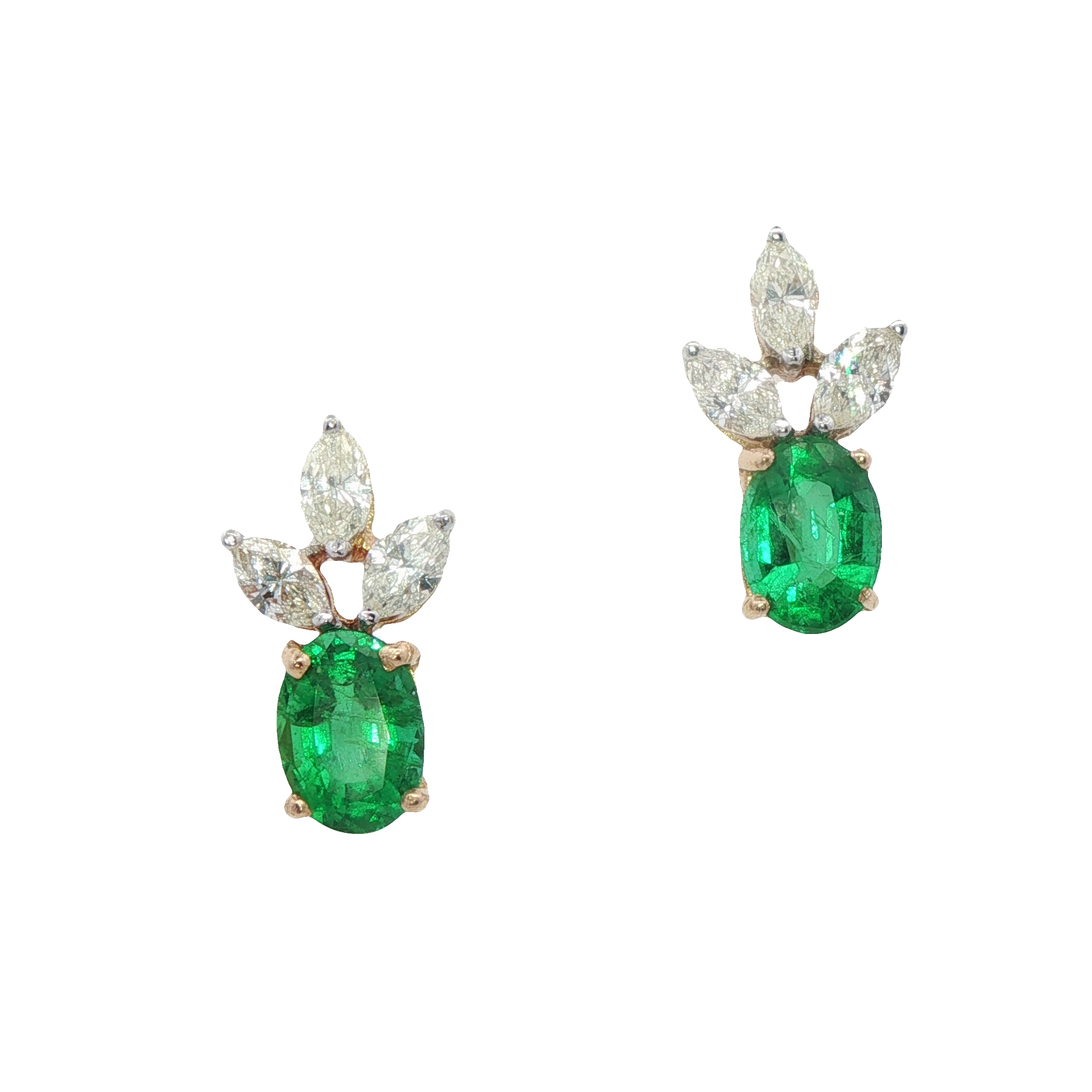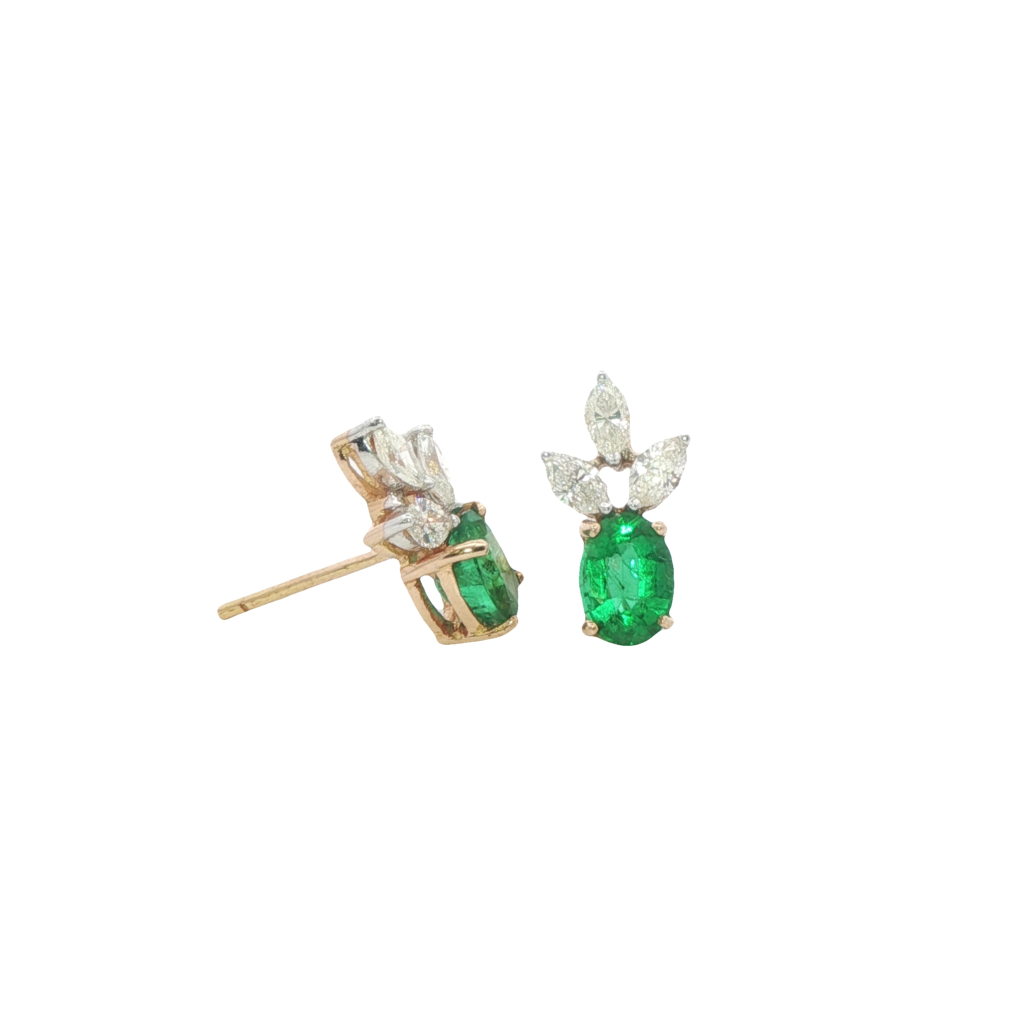 An incredible pair of 18ct yellow gold stud earrings featuring vibrant oval faceted emeralds in four claw settings topped with three sparkly marquise diamonds in claw settings. The earrings are fastened with posts and butterflies.