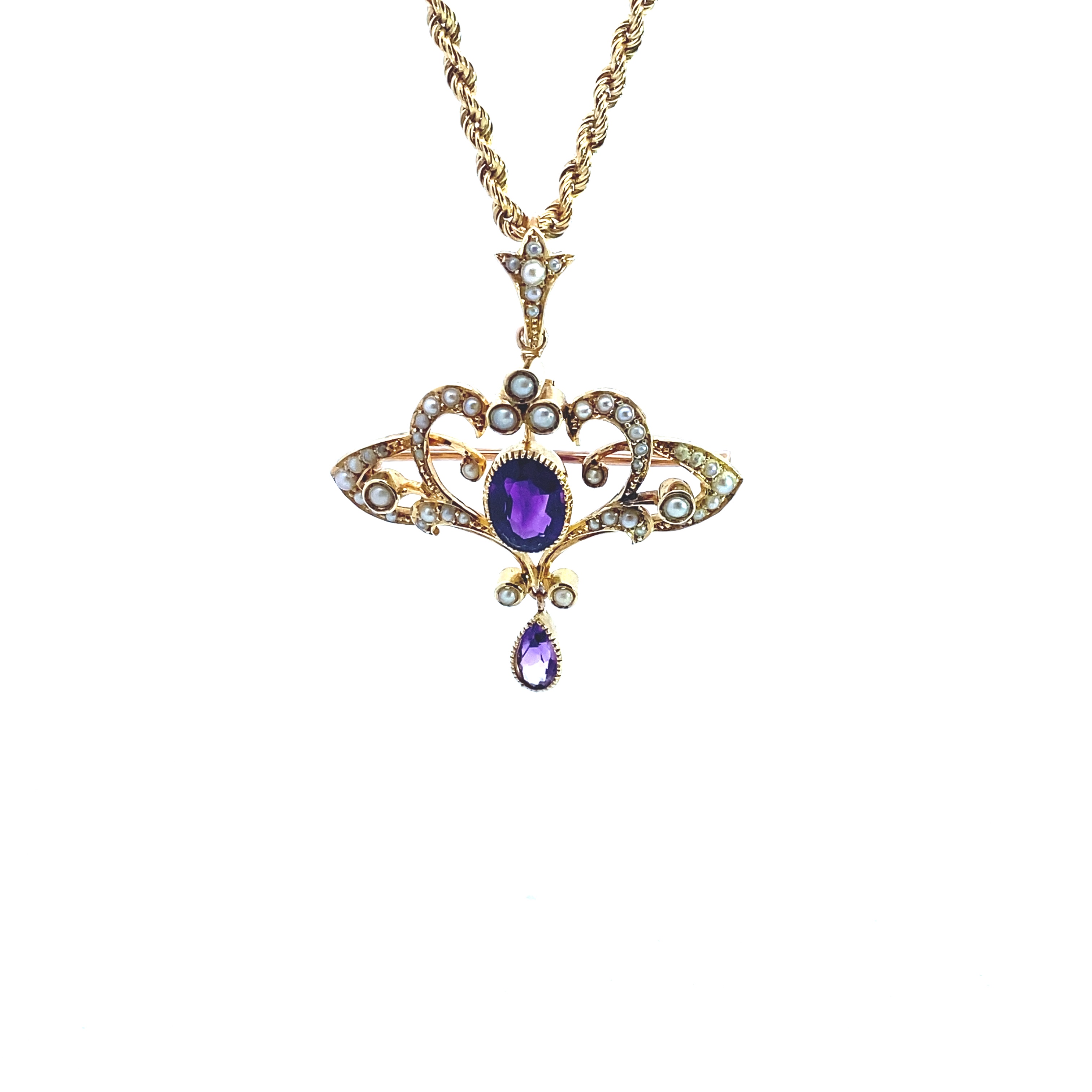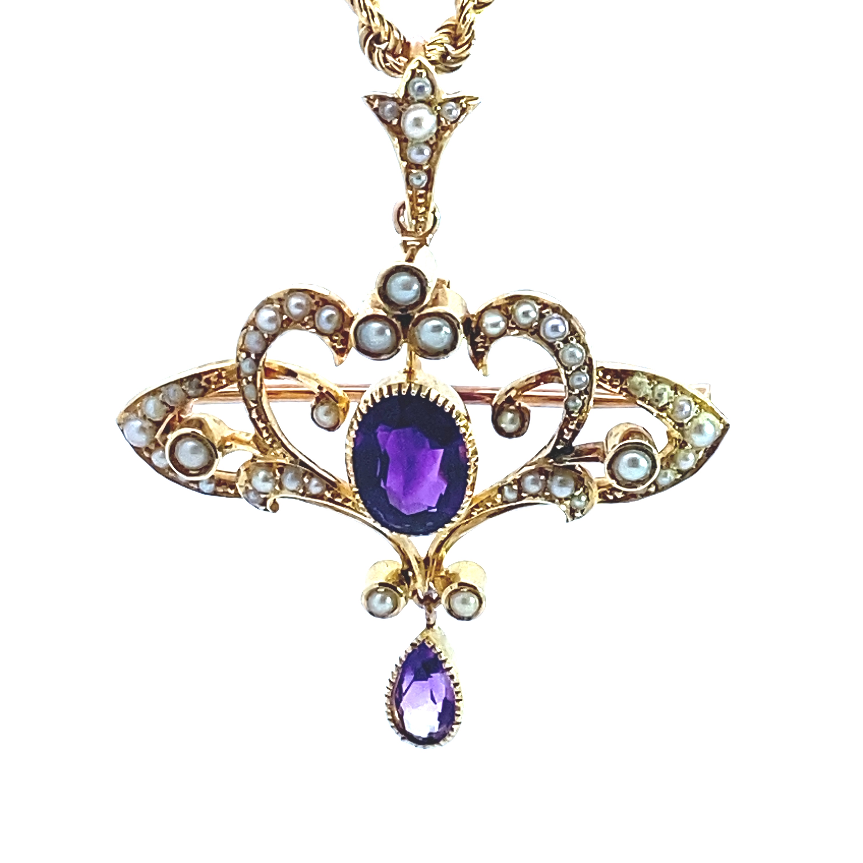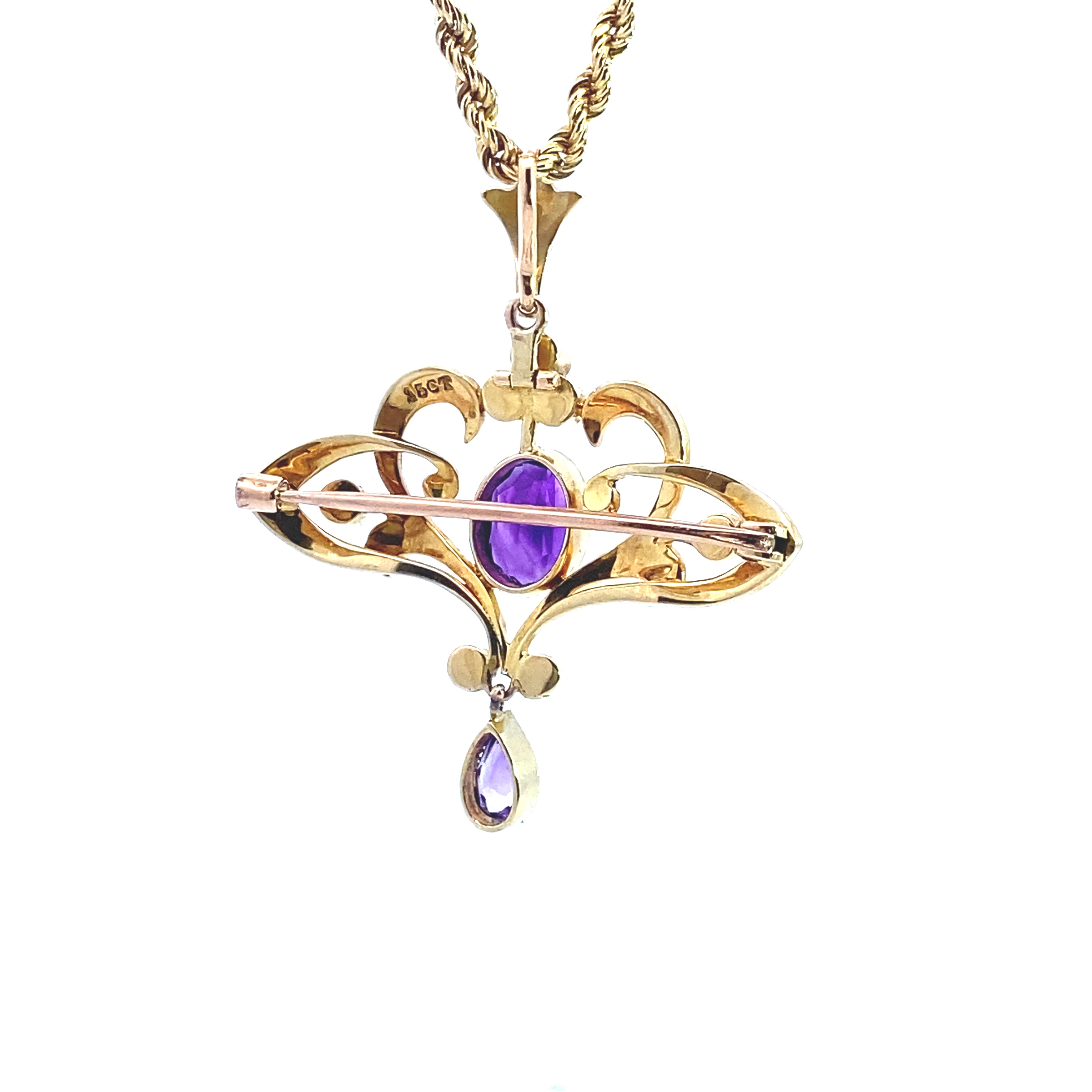 A 15 carat gold lavalier pendant featuring a central oval mixed cut Amethys measuring approximately 9x7mm t in a rubover setting with millegrain detail surrounded by a floral motif set with seed pearls surmounted by a detachable pearl set bail. The pendant has a beautiful dangling pear cut shape amethystin rubover setting articulated at the bottom. The pendant is assessed as a later 1930s/40s piece. Measuring approximately 5cm x 4cm Gross weight 11.16 grams Hung on a 9 carat gold rope style chain 50cm in length
