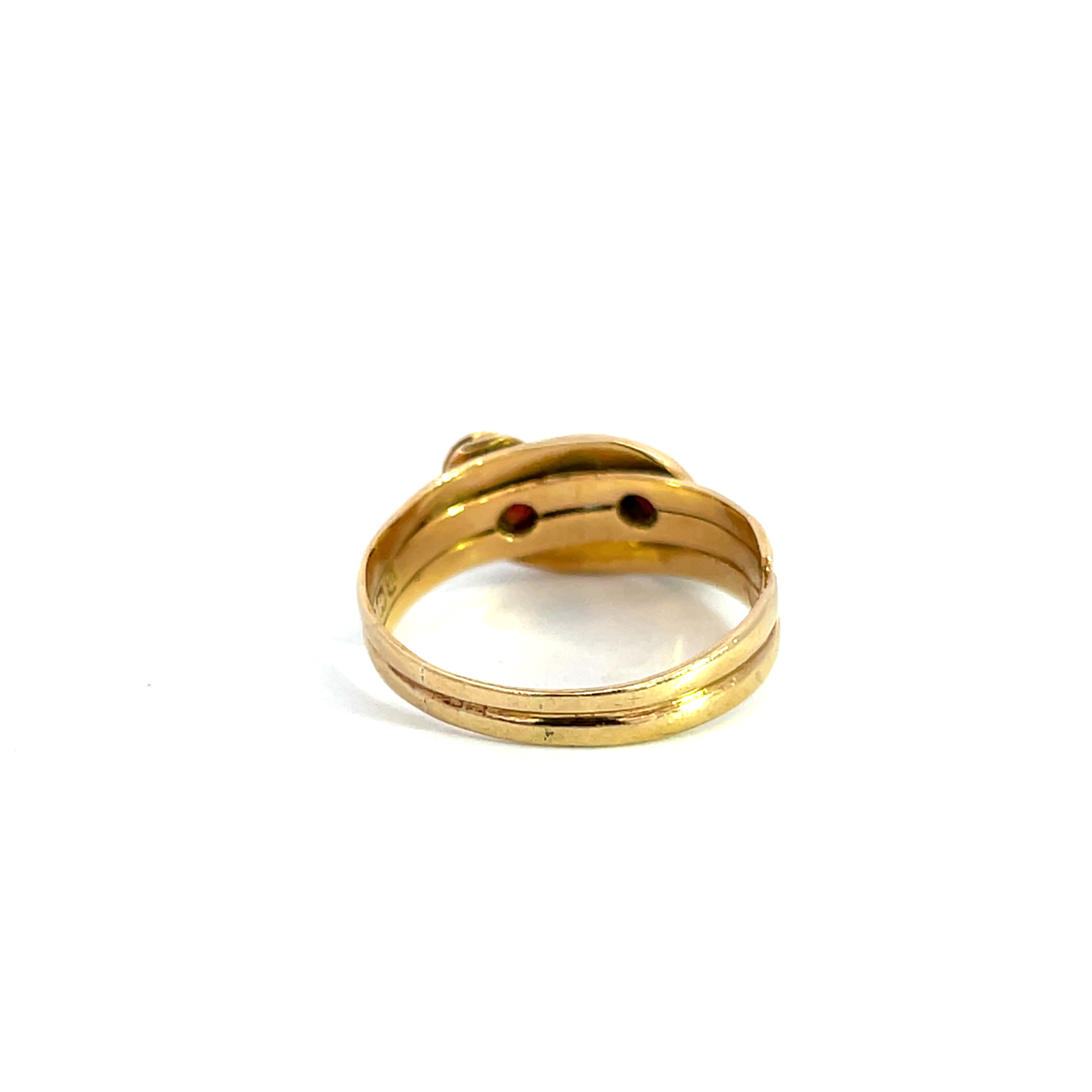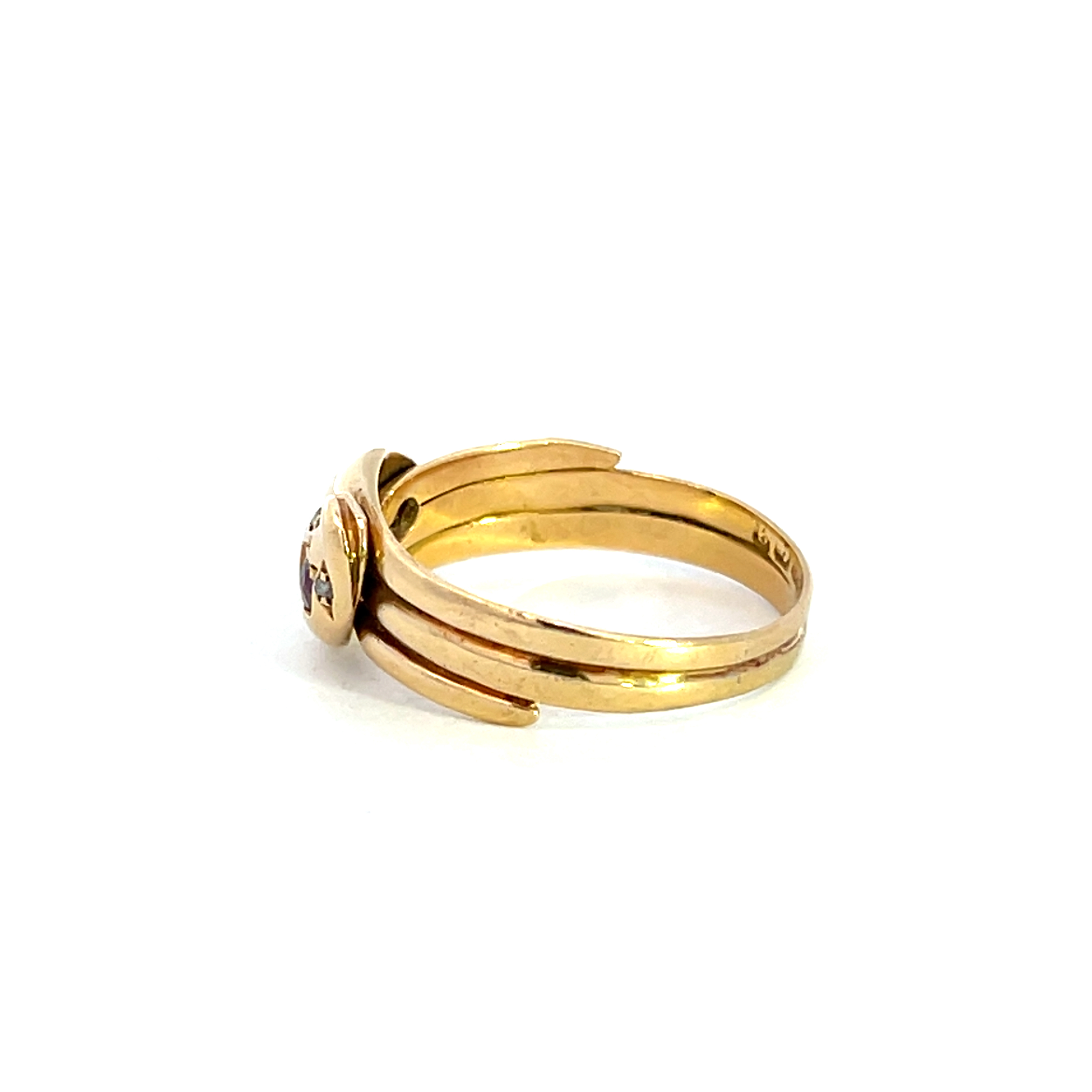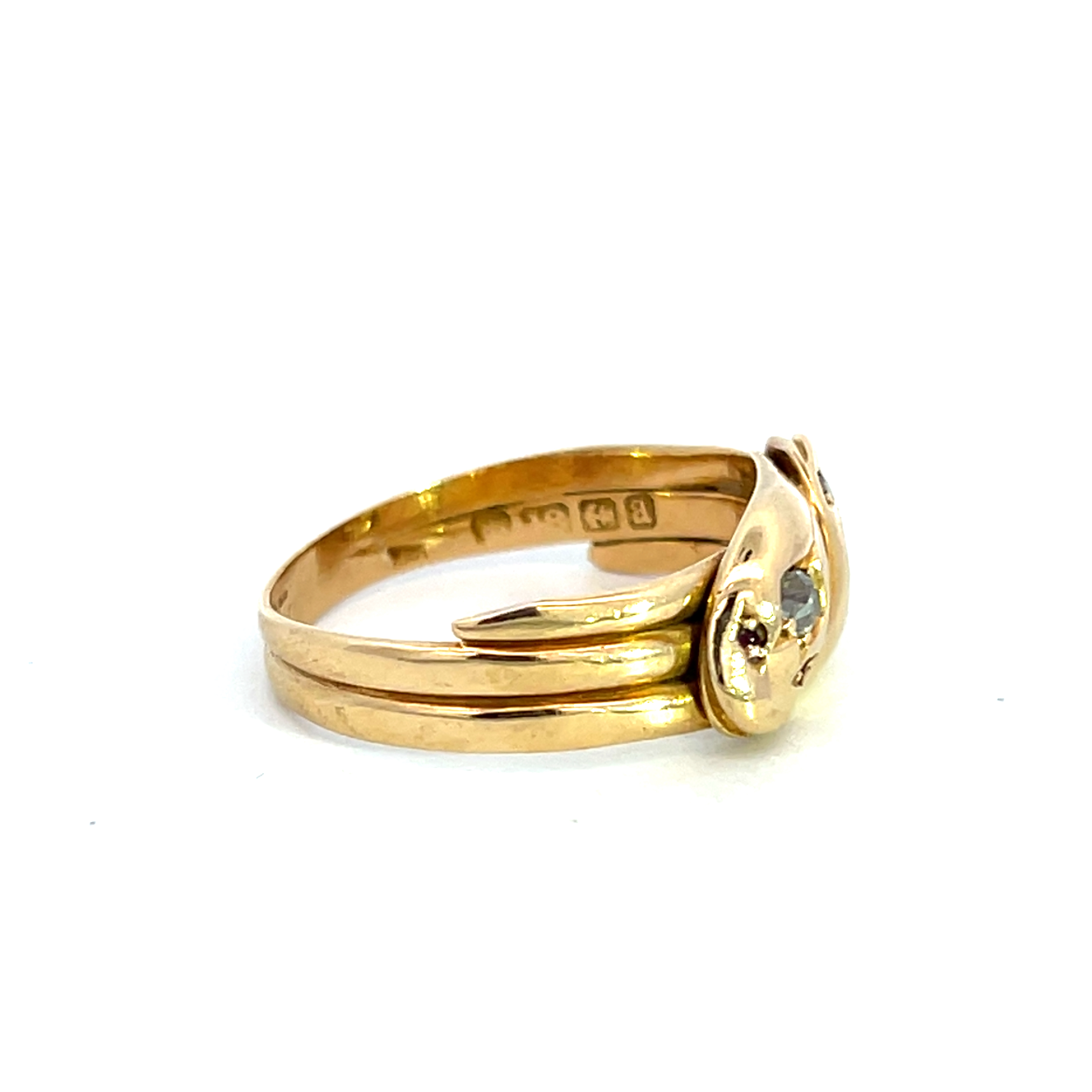 Description: A beautiful example of Victorian jewellery, this ring showcased the classic entwined snakes symbolising love and commitment, with he added sparkle of old cut diamonds and rubies.