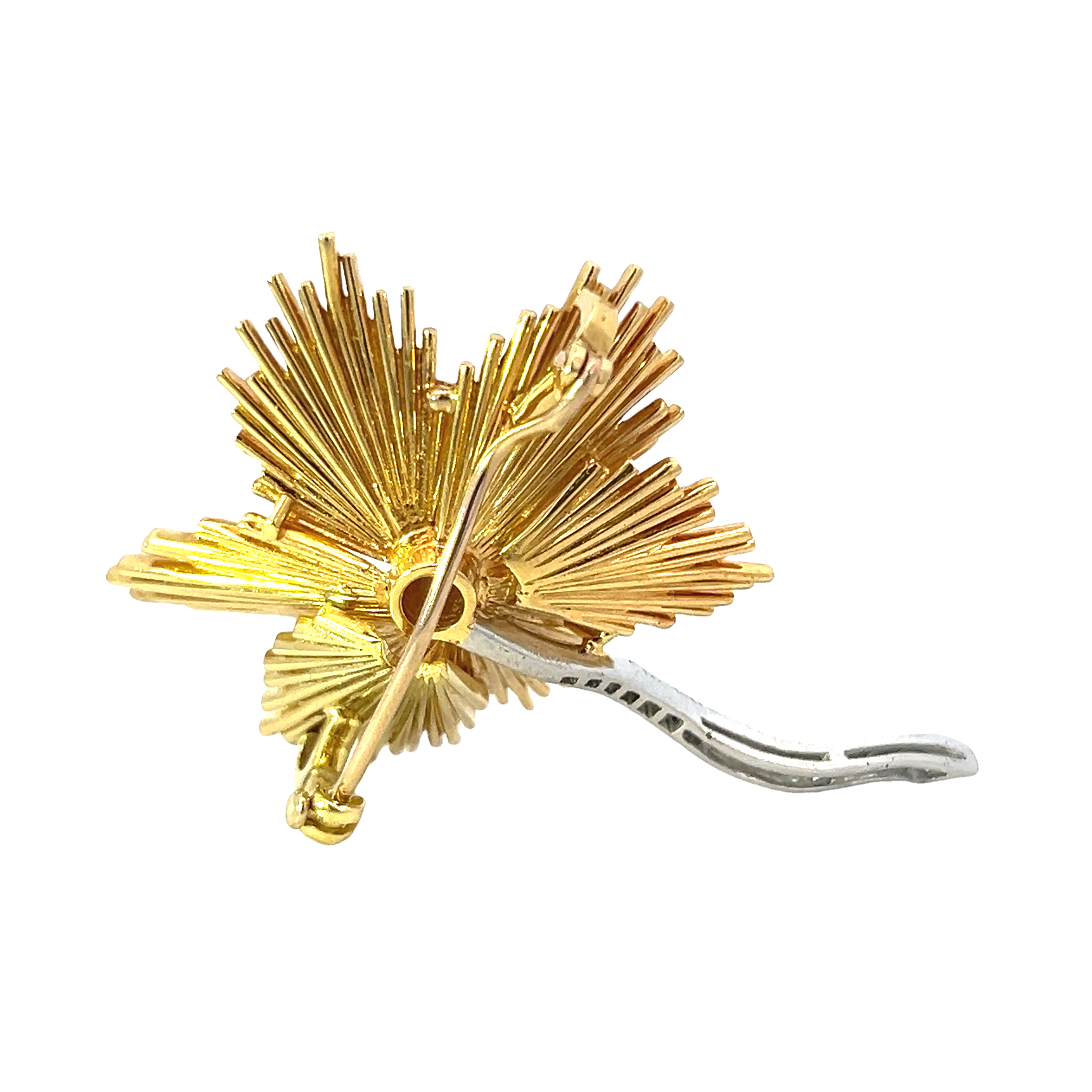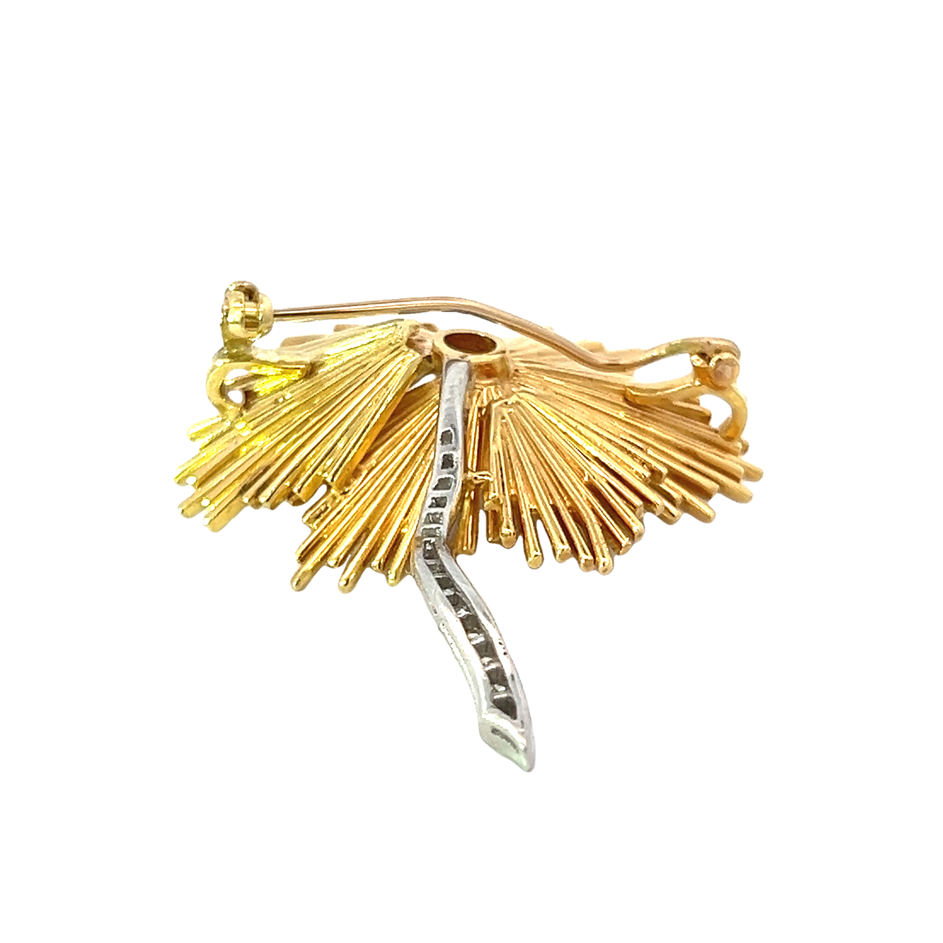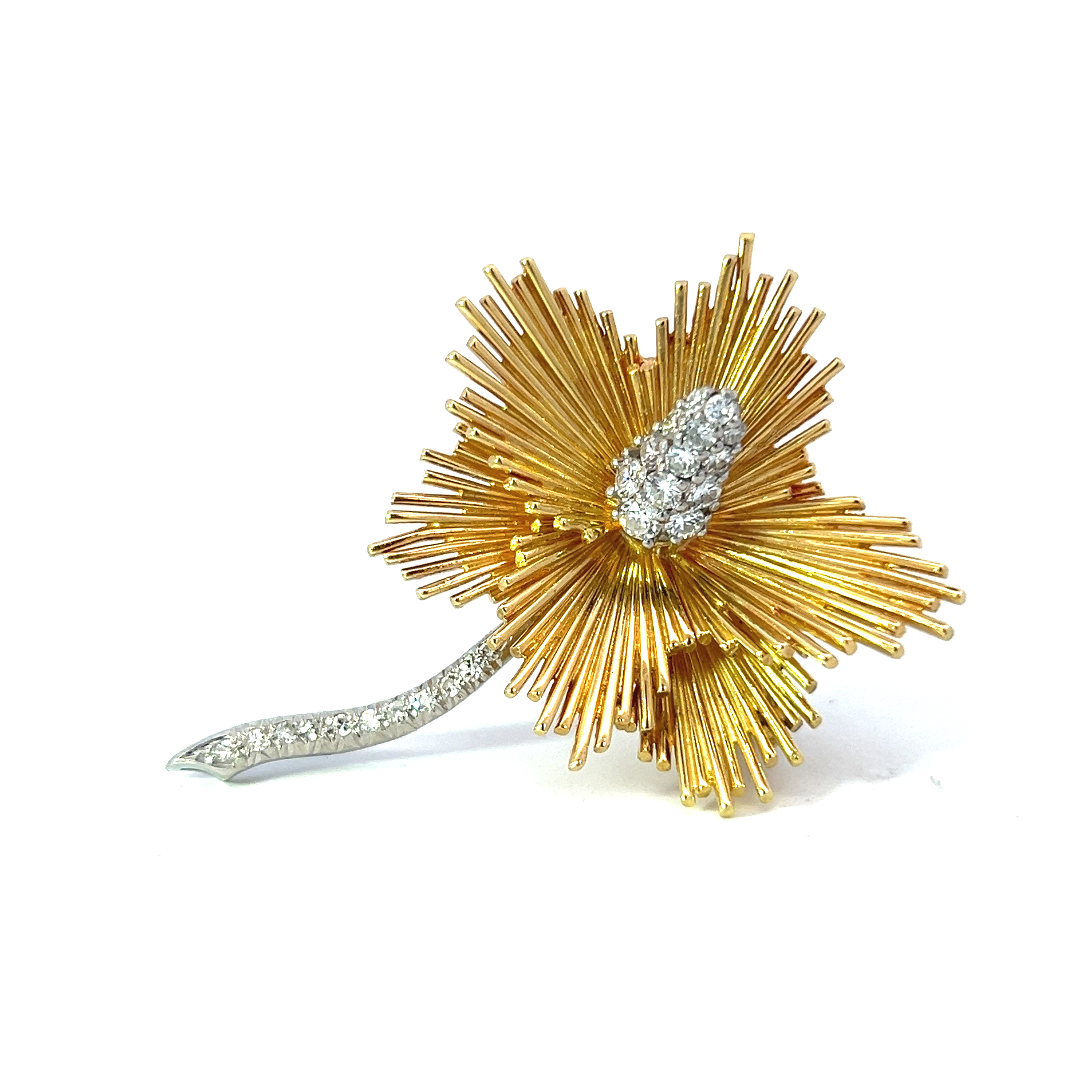 A fine example of 1960s jewellery this brooch showcases excellent craftsmanship in a hand-made design featuring a solid 18 carat gold abstract petal flower and pave diamond set centre and stem in platinum. The brooch is securely fastened with gold bar pin and closing catch. This splendid diamond brooch would look striking on a jacket or evening dress. A truly eye-catching piece. Condition: Excellent Era: Circa 1960s Approximate dimensions: 5.00 x 4.00cm Weight: 25.20 grams