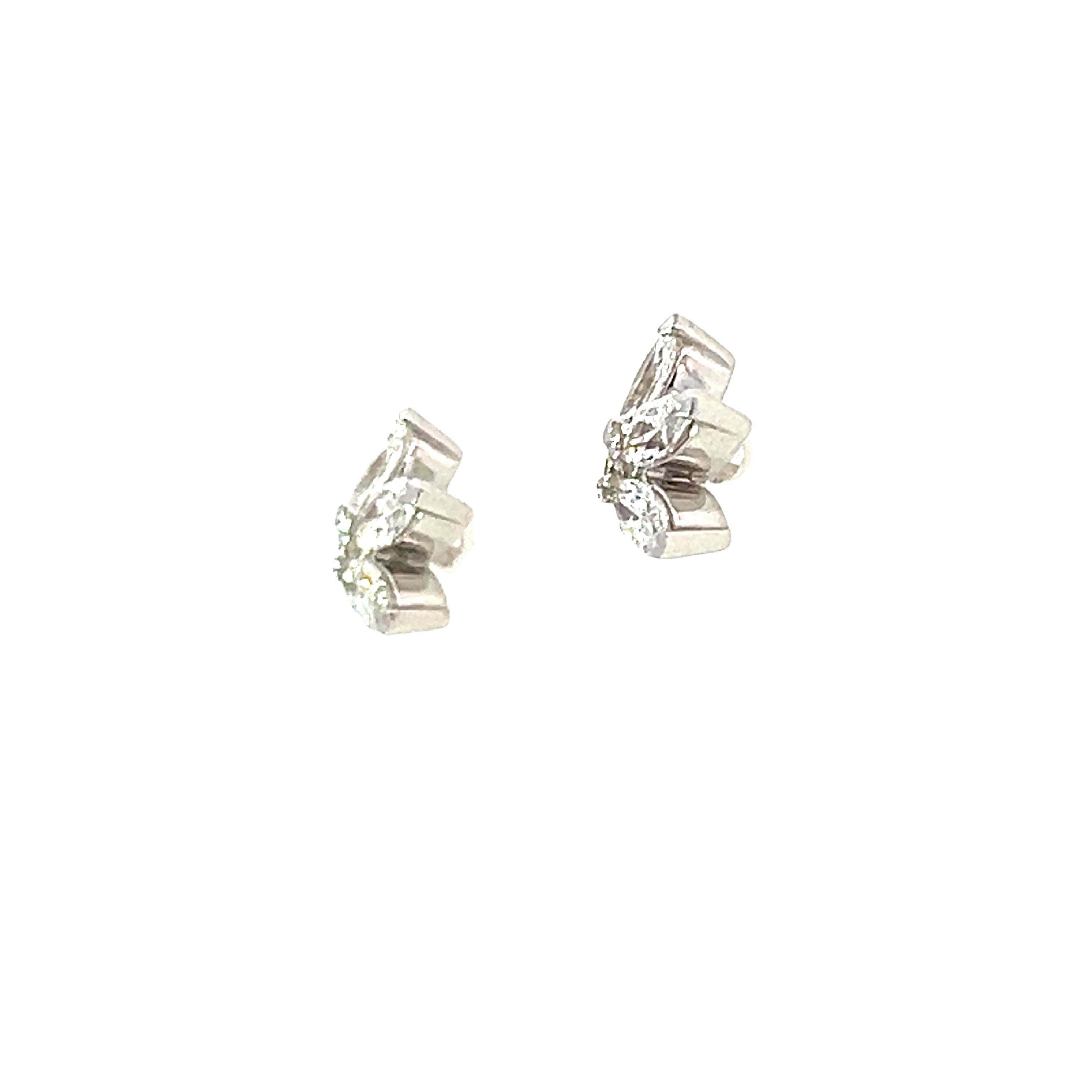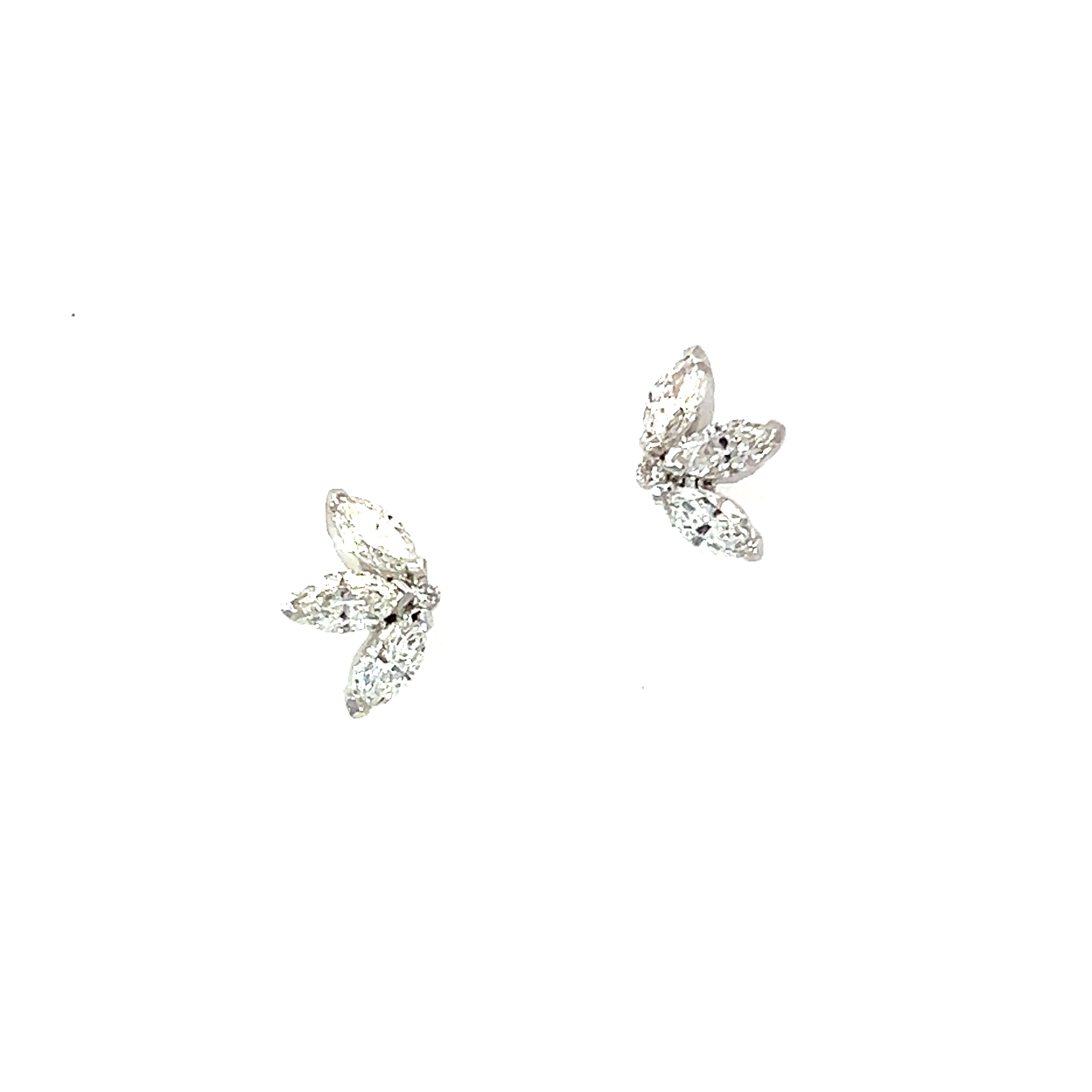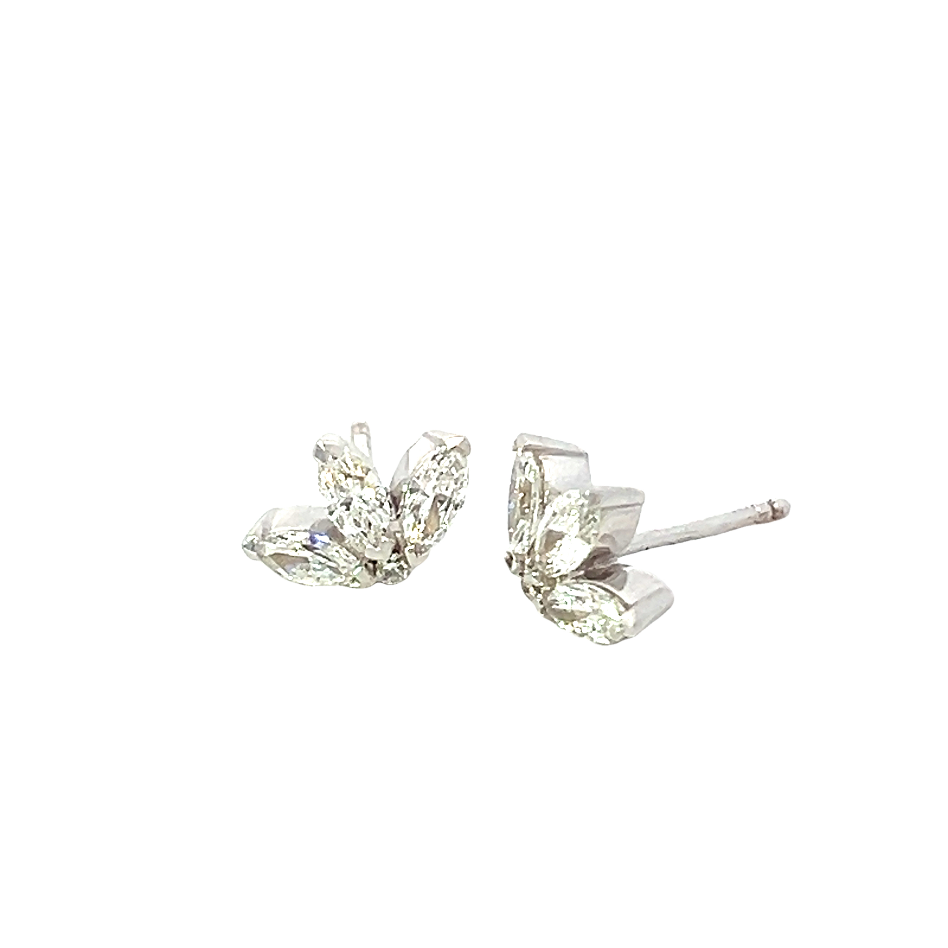 A modern pair of 18 carat white gold and diamond studs featuring 3 marquis shaped and one small modern round brilliant in claw settings to the shape of ½ a flower. Total Diamond weight 0.76 carats of G colour VS clarity Diamonds