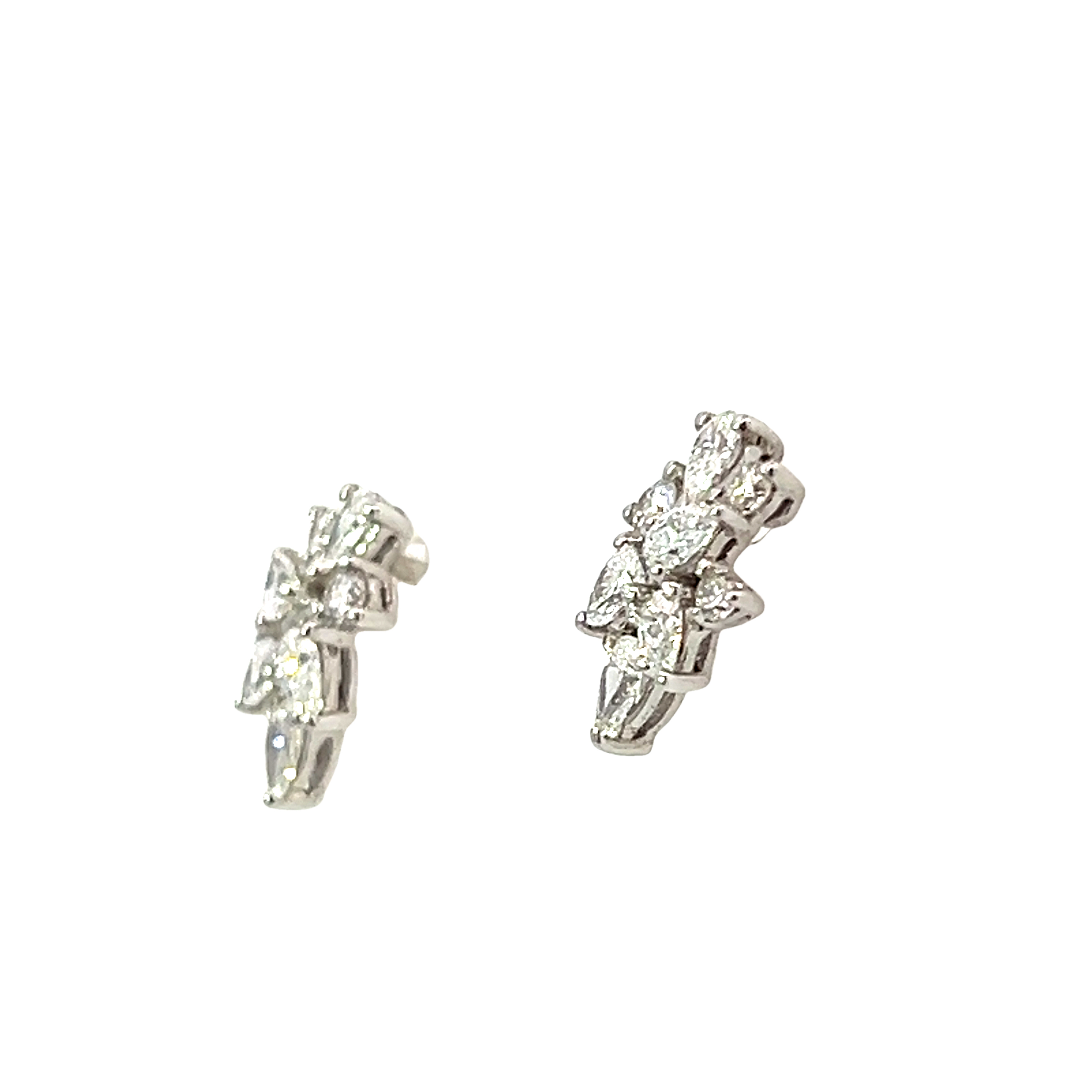 A pair of modern 18 carat white gold diamond cluster studs featuring a cluster ten (10) claw set pear shaped diamond totaling 0.60 carats interspersed with six (6) modern round brilliant diamonds totaling 0.16 carats Giving a total diamond weight of 0.76 carats of G colour VS clarity diamonds.