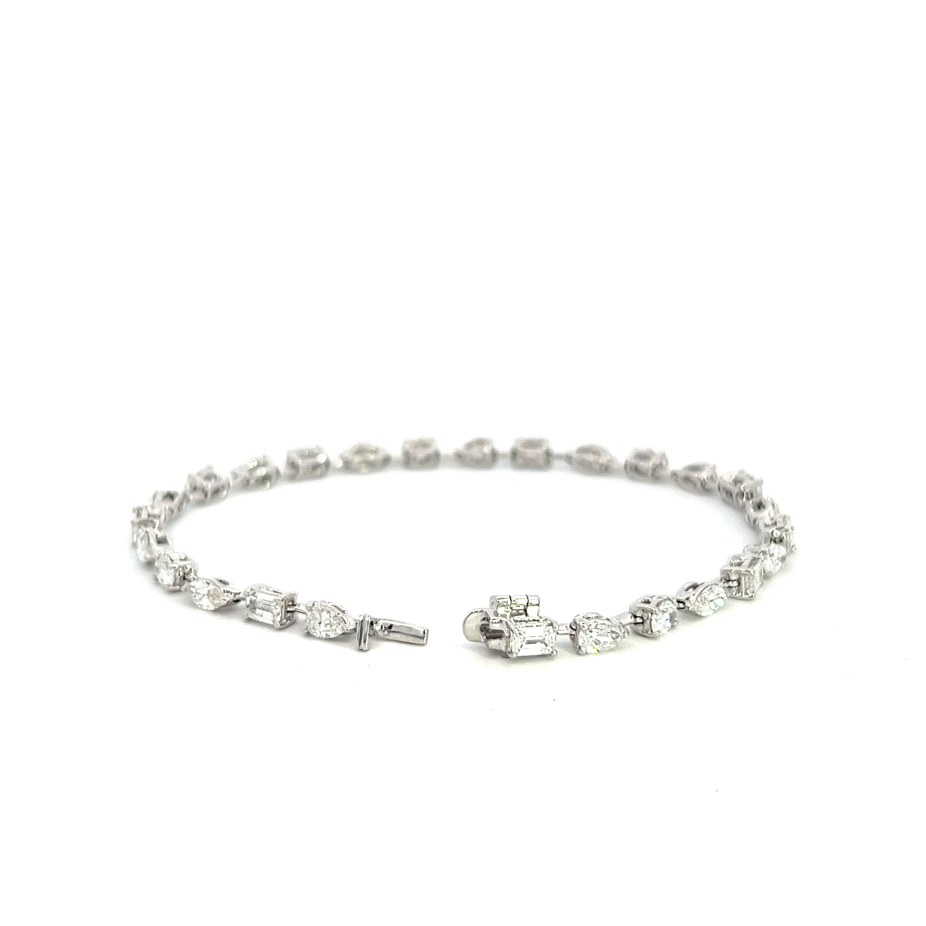 A modern 18 carat white gold and diamond bracelet featuring alternating shapes of Oval, Marquis, Emerald cut and Pear shape mix cut natural diamonds in articulated claw settings with bar spacers between each diamond. The Diamonds are all G colour VS clarity and total diamond weight is 5.03 Carats. With a box clasp and underslung safety snap. Overall length 180mm, Gross weight 8.48grams