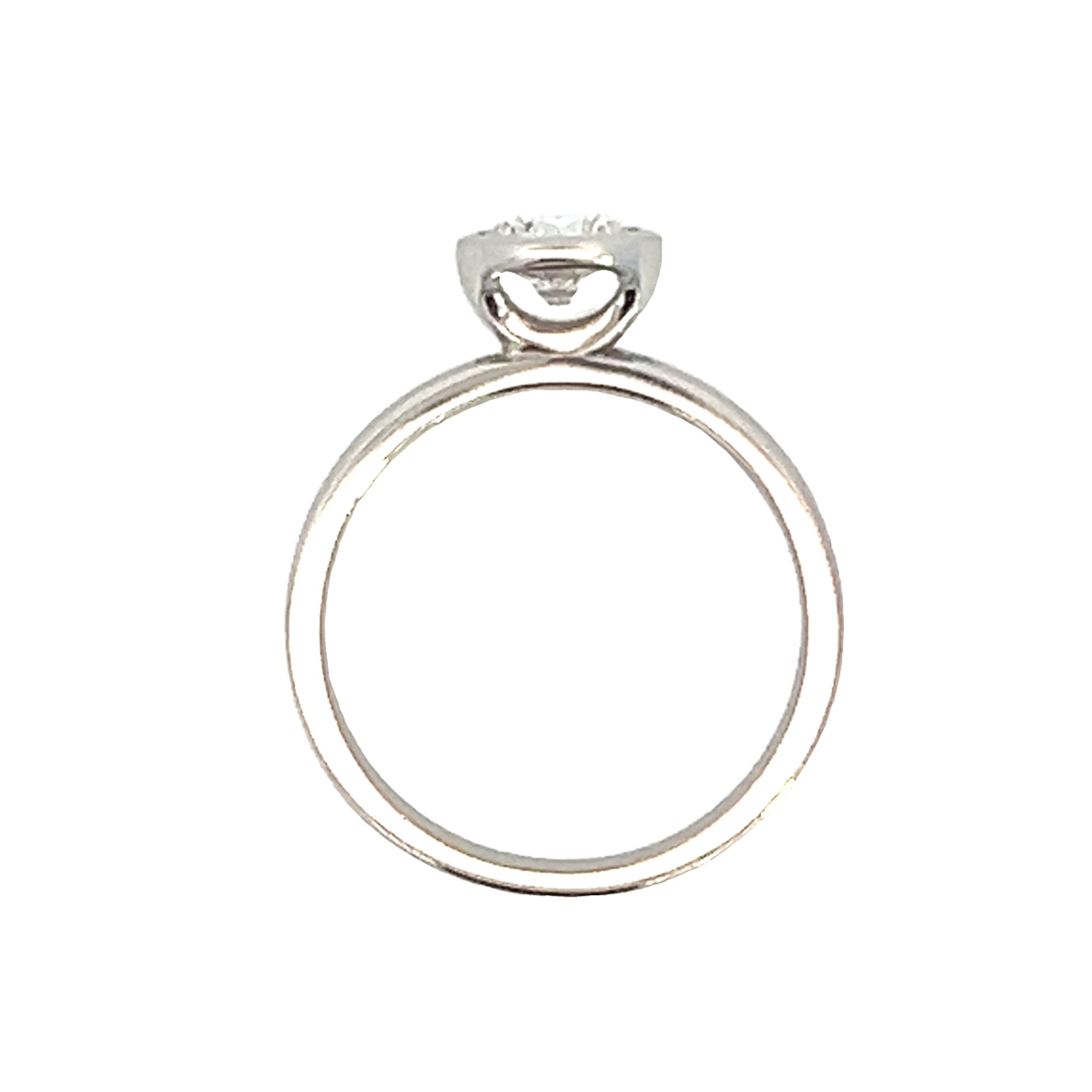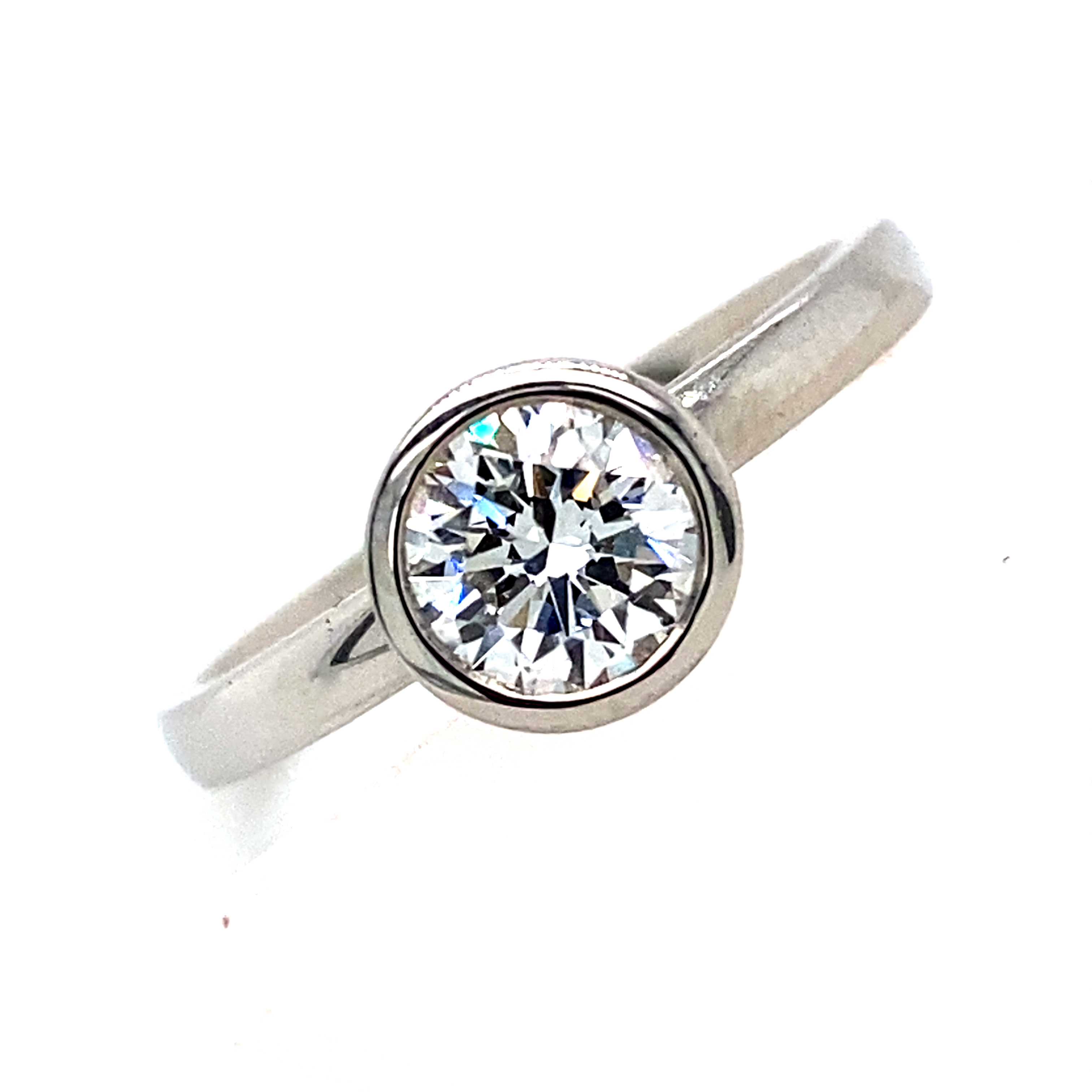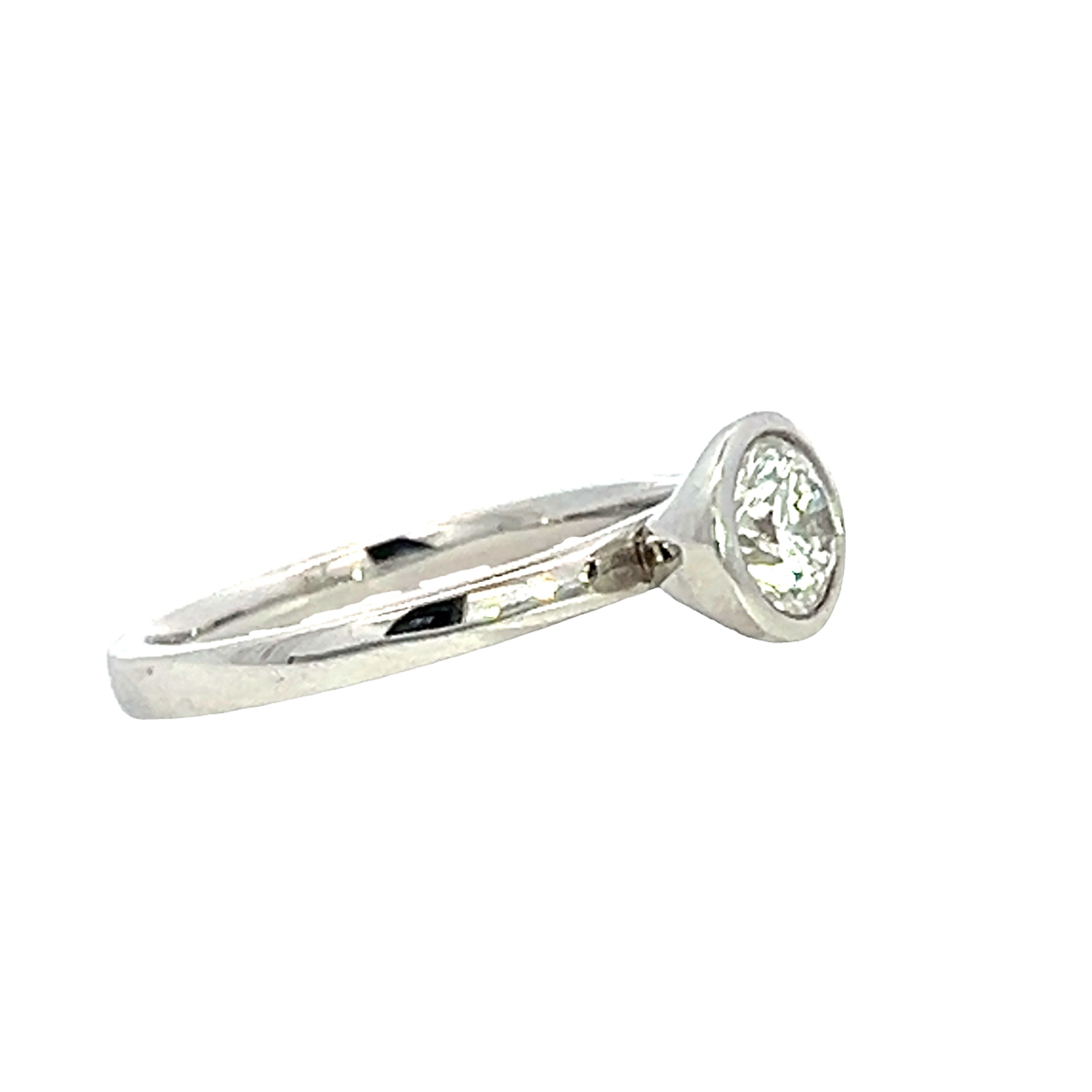 A modern Platinum and modern round brilliant diamond. Featuring a certified 0.66 carat diamond of D Colour VS1 clarity in a rub over raised basket setting to a parallel 2.20 mm D band shank. Gross weight 4.60 Grams Size M