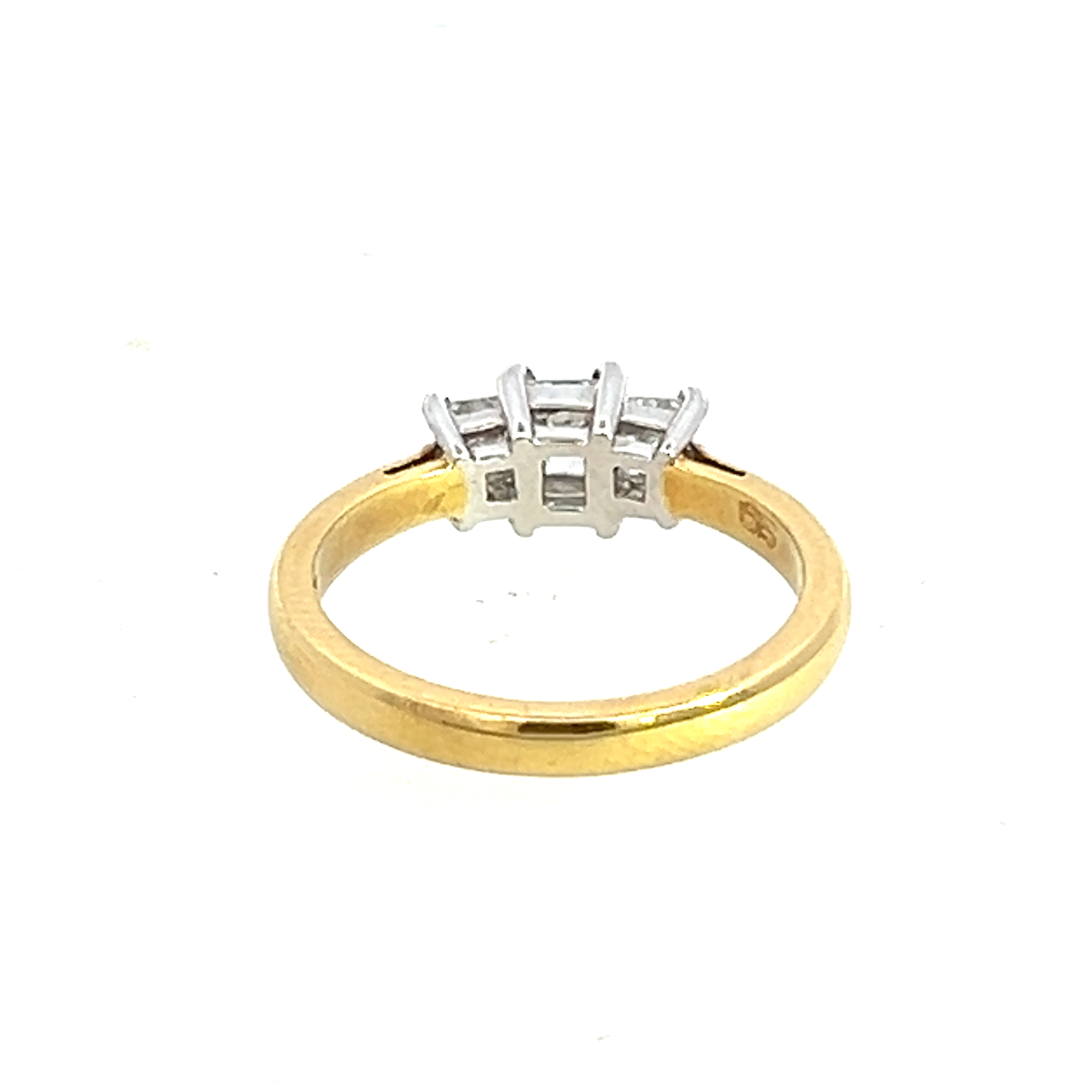 An 18 carat yellow gold and platinum diamond ring. This ring has three princess cut diamonds set in classic four claw settings on a court shape band. The centre diamond is 0.33 carats G Colour VVS clarity. The sides stones have a total additional weight of 0.64 carats giving a total carat weight of 0.97 carats. The centre diamond is independentlty certified and all diamonds are guaranteed conflict free. It is finger size M.