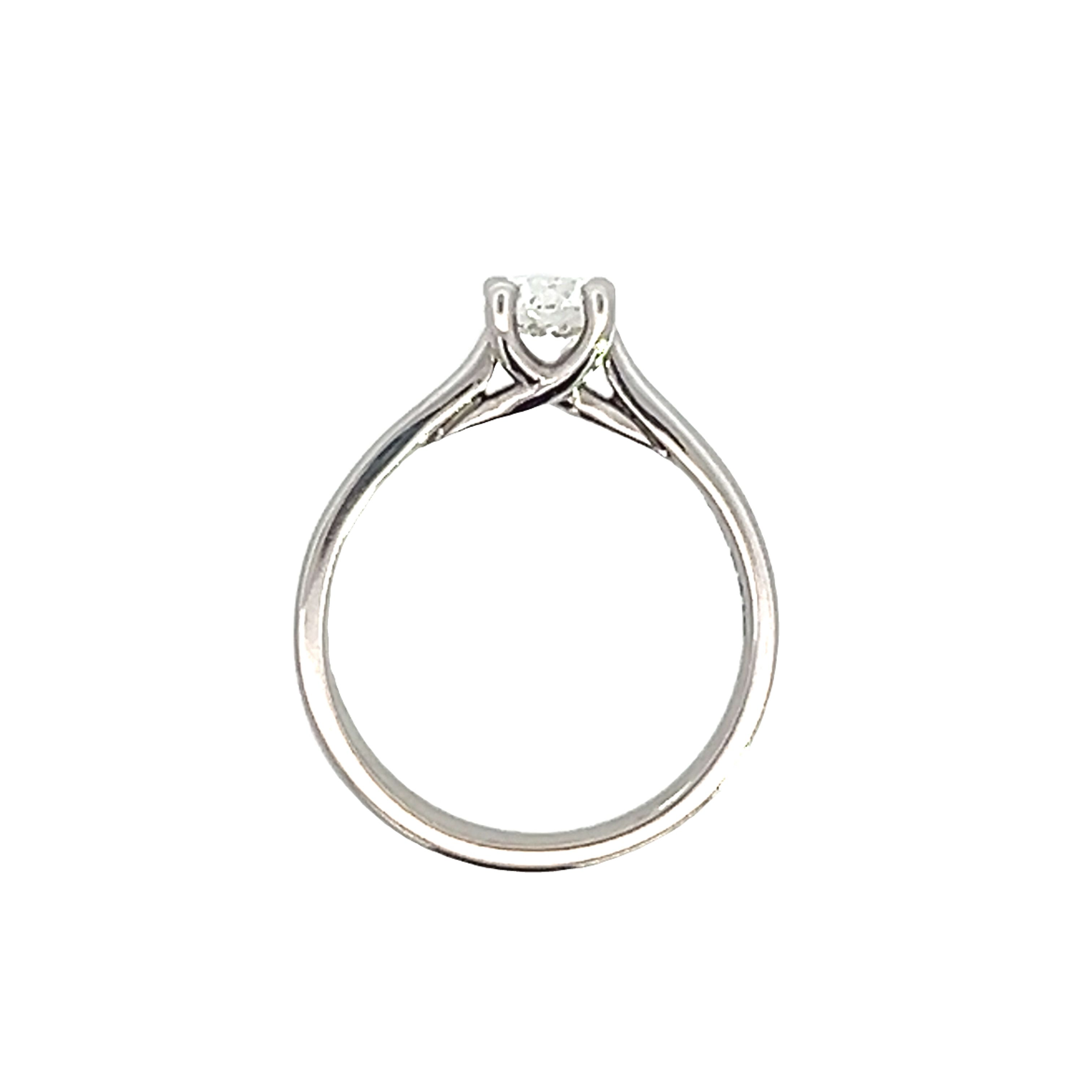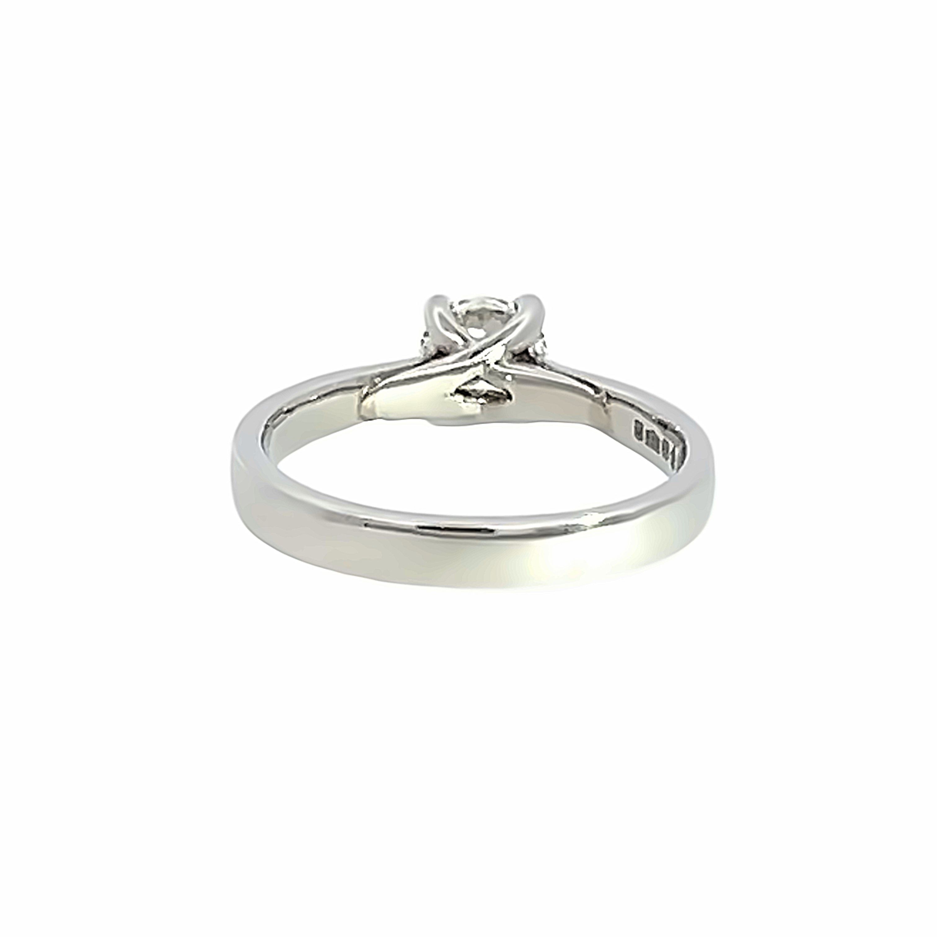 A modern platinum and diamond single stone engagement ring featuring a GIA certified modern round brilliant diamond weighing 0.74 carats of G colour VS2 clarity set in a 4 claw cross over under wire setting with no top bezel. To a slightly tapered 2.90mm heavy weight court shank. Finger size M. Gross weight 5.47