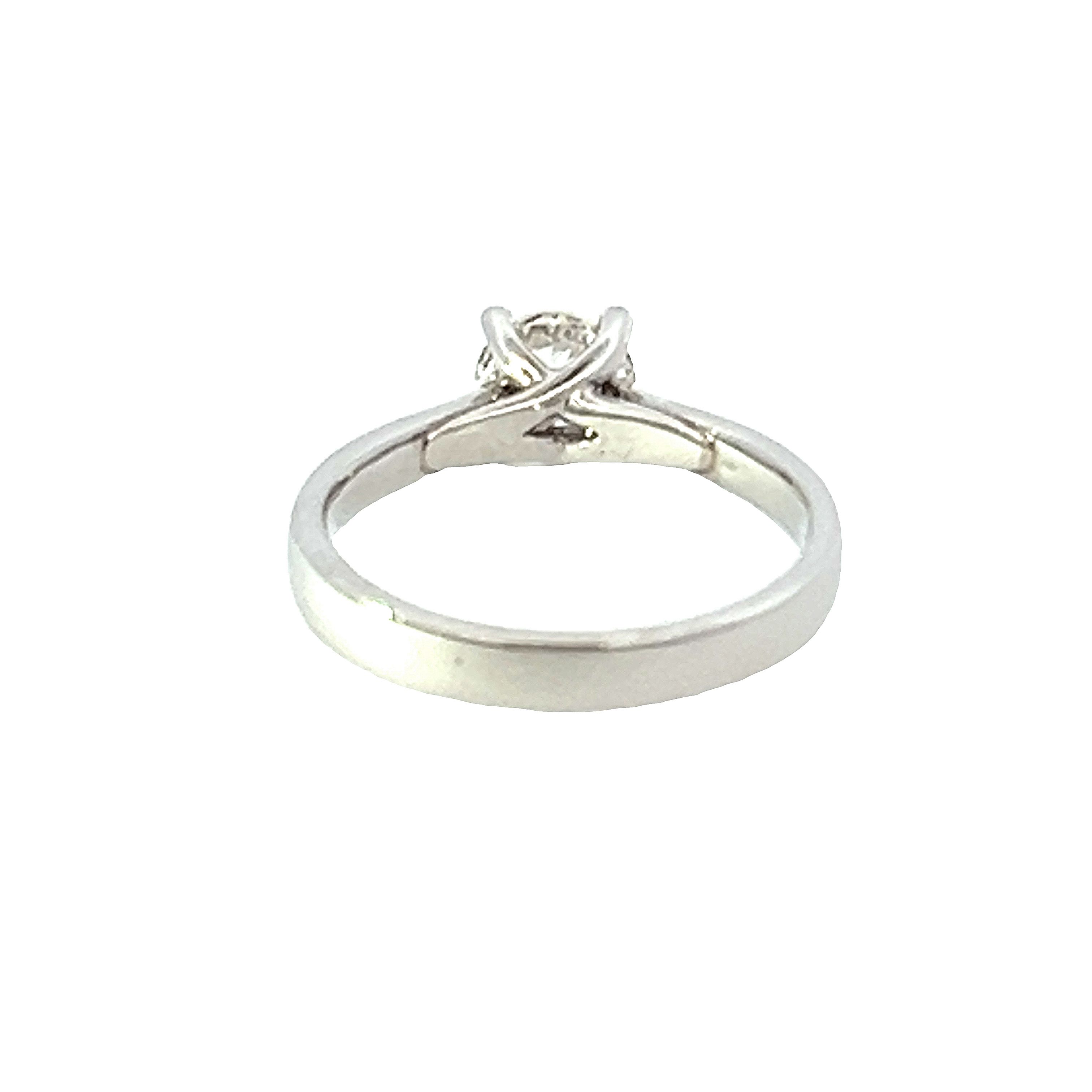 A Marmalade original design with a classic four claw setting for the centre diamond with a delightfully modern cross over setting that gives un-parrallelled side views of the stone. Set in platinum on a 2.9 mm shank the ring is finger size N. The round brilliant diamond weighs 0.90 carats and is independently certified by the GIA as G colour and VVS2 clarity. All Marmalade diamonds are guaranteed conflict free.