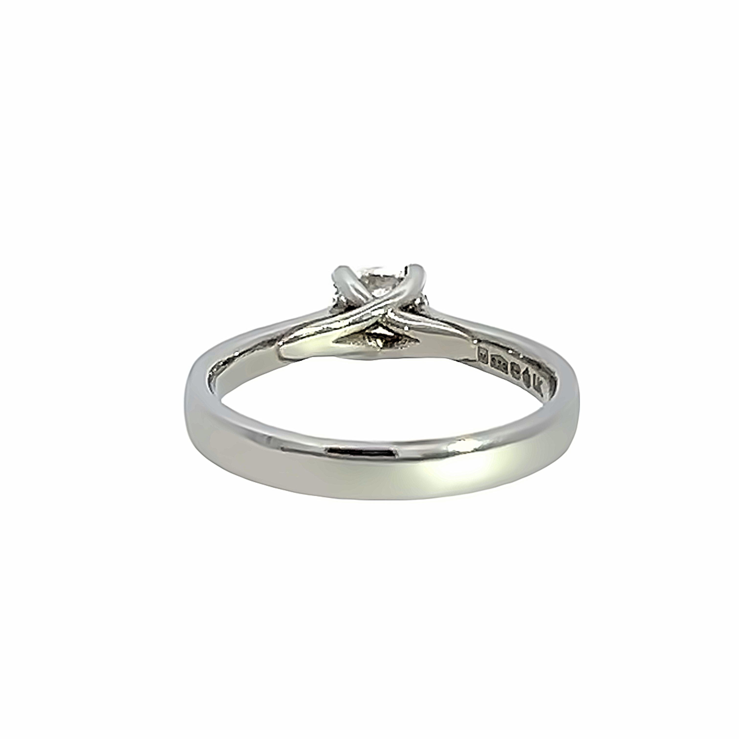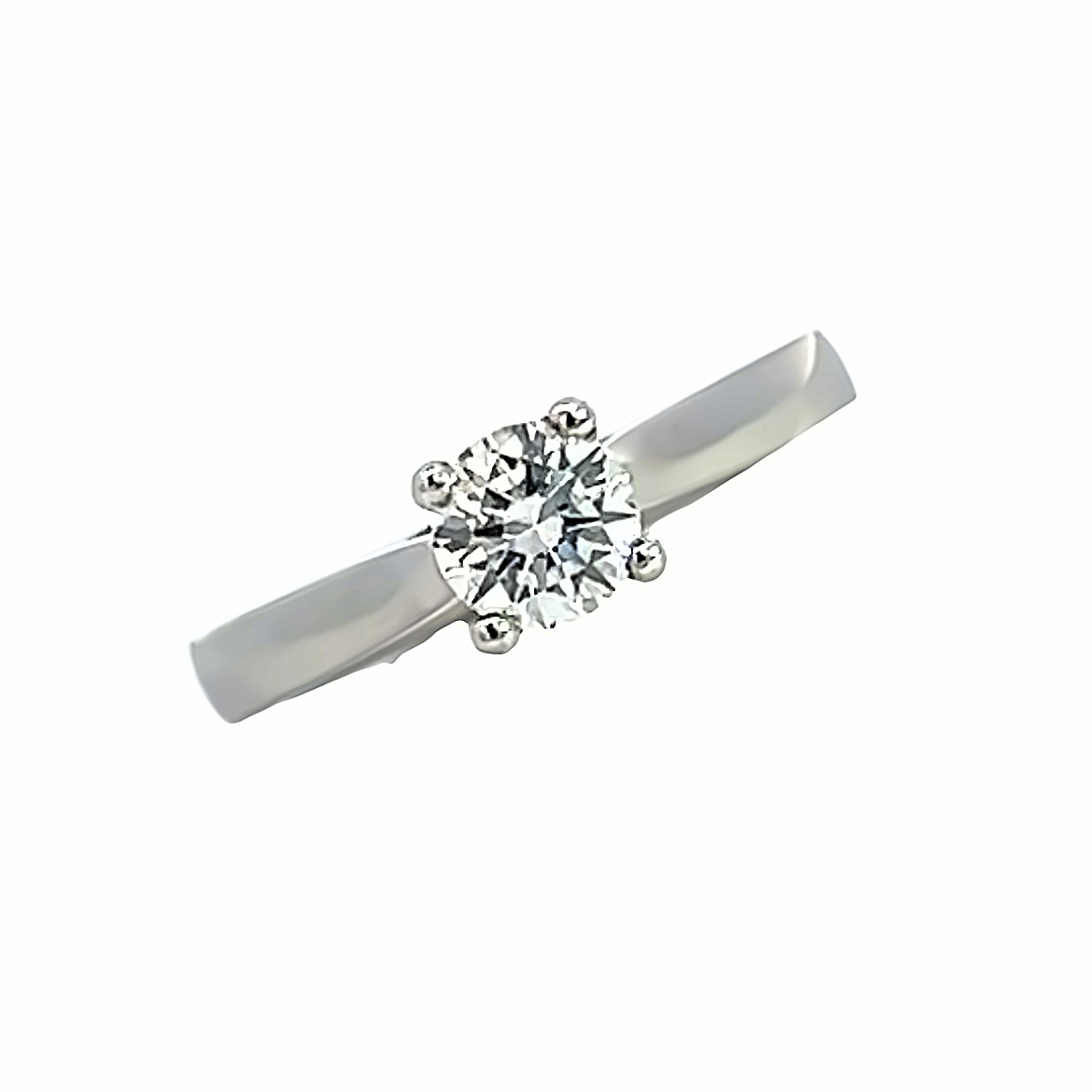A modern platinum and diamond single stone engagement ring featuring a GIA certified modern round brilliant diamond weighing 0.55 carats of E colour VS2 clarity set in a 4 claw cross over under wire setting with no top bezel. To a slightly tapered 2.90mm heavy weight court shank. Finger size M. Gross weight 4.96