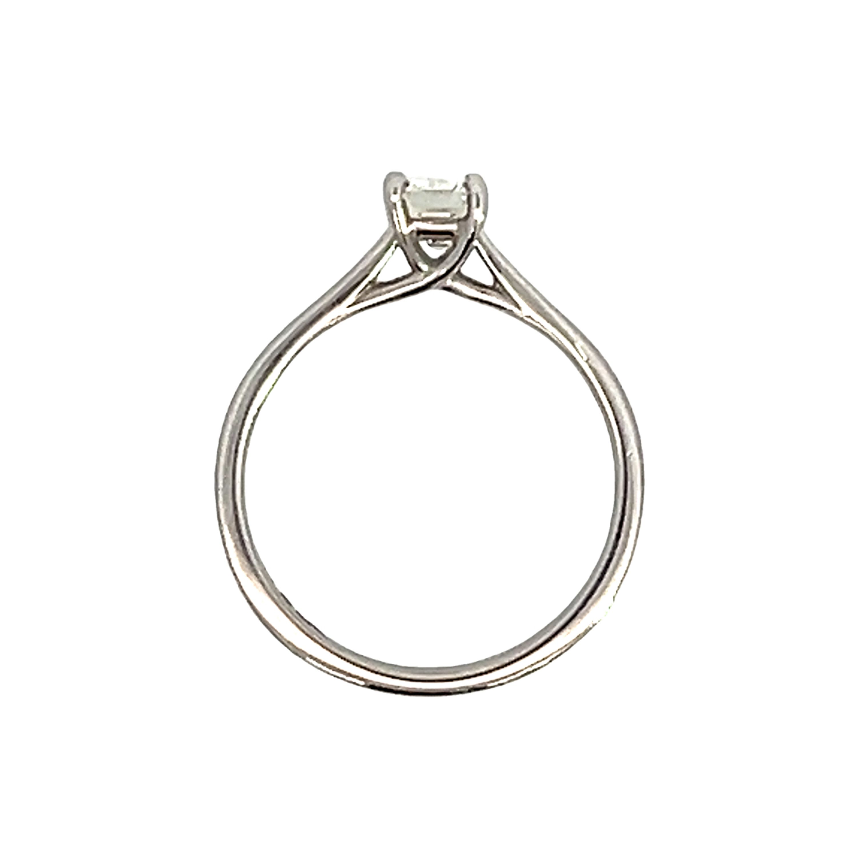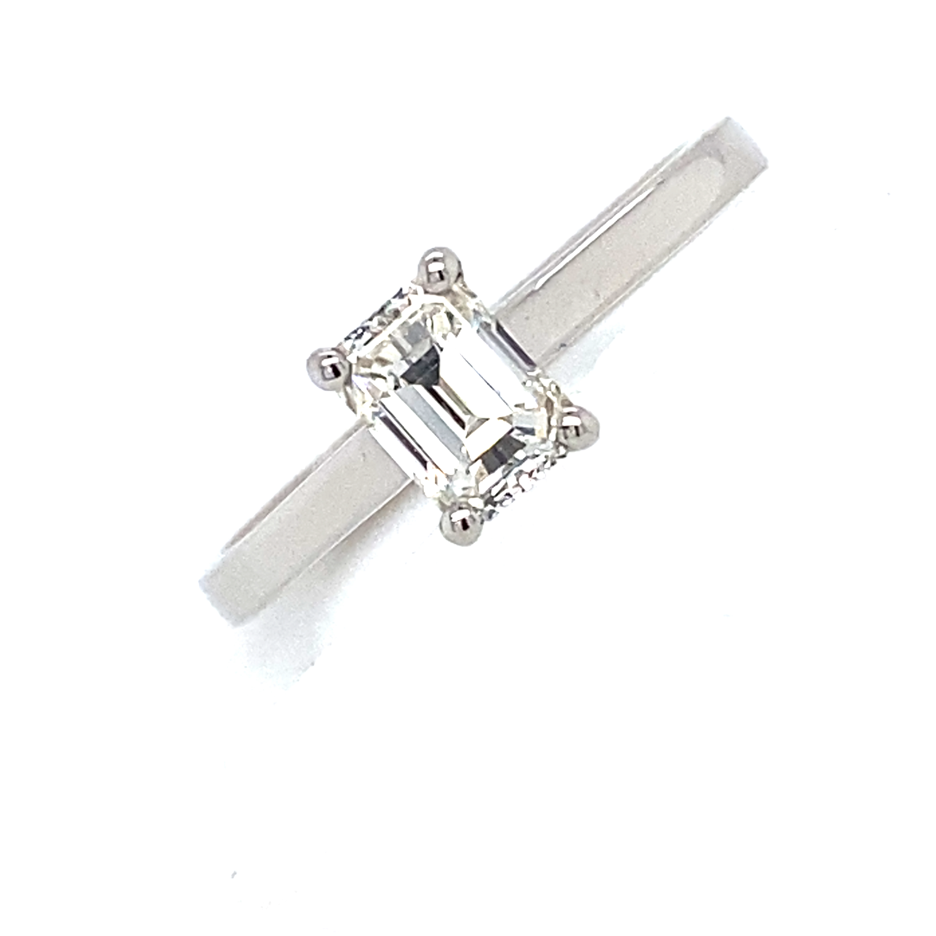 A modern Platinum and Diamond Emerald Cut Diamond Ring from our Lillian collection with a centrally set emerald cut diamond in a four claw setting with cross over under wires To a parallel court shank. The Diamond weighs 0.71 Carats and is assessed as G/H colour Si clarity. Finger size M