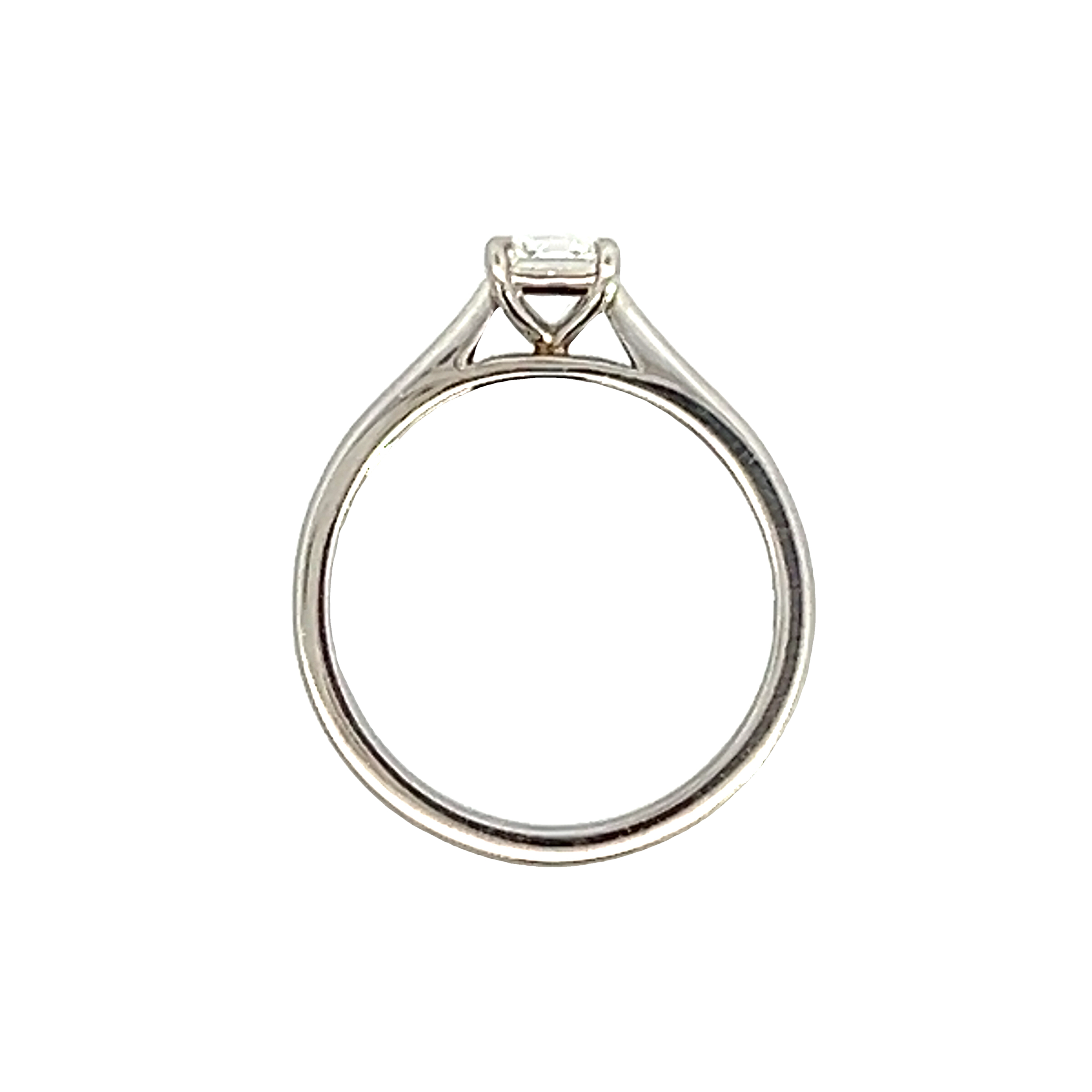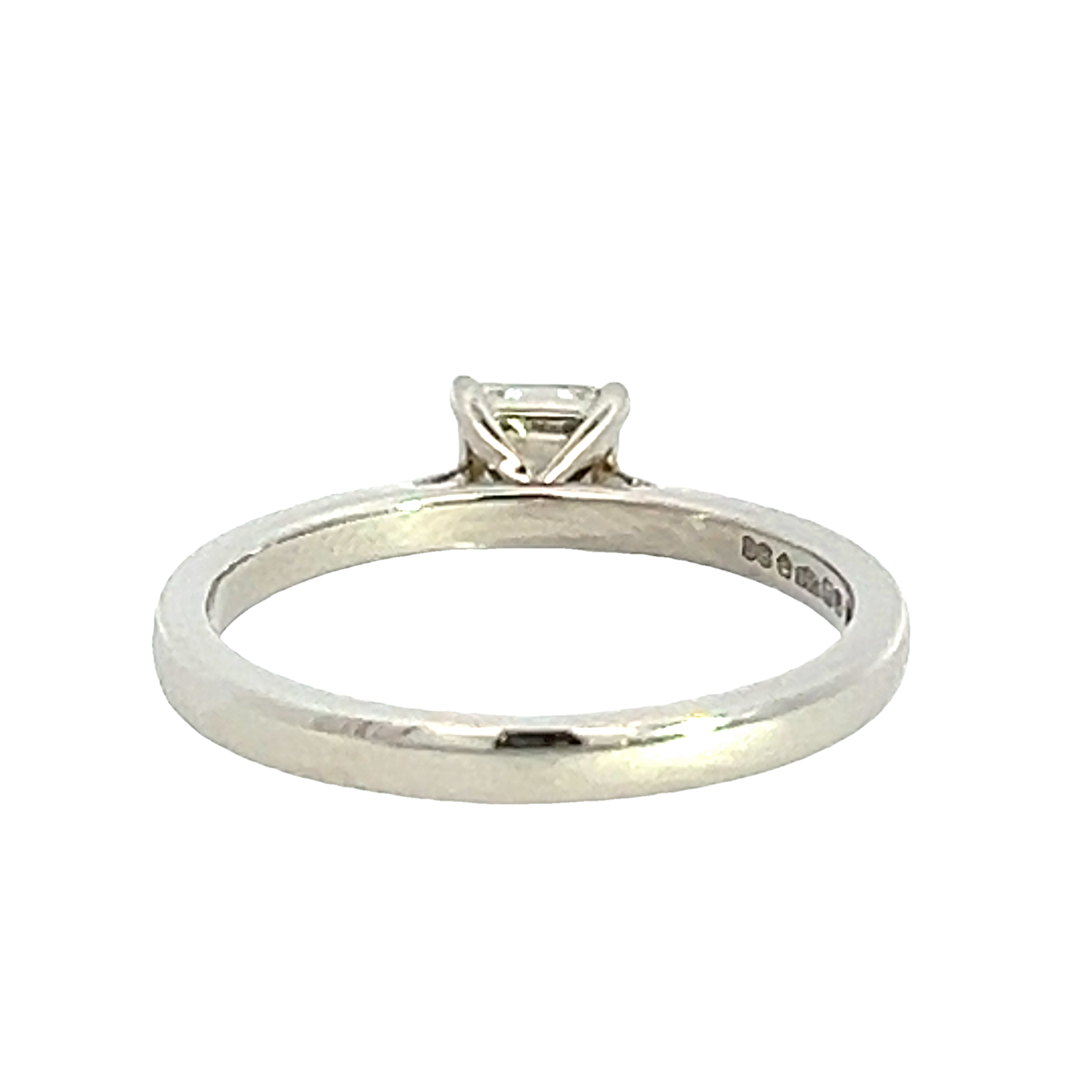 A modern platinum and diamond engagement ring. Featuring an Ascher cut centrally set Diamond in a 4 delicate talon claw setting. Main stone is certified by the GIA 0.53 Carats G Colour VVS1 Clarity. To a tapered 2.0 mm wed fit D band shank. Gross weight 3.80 grams Size M