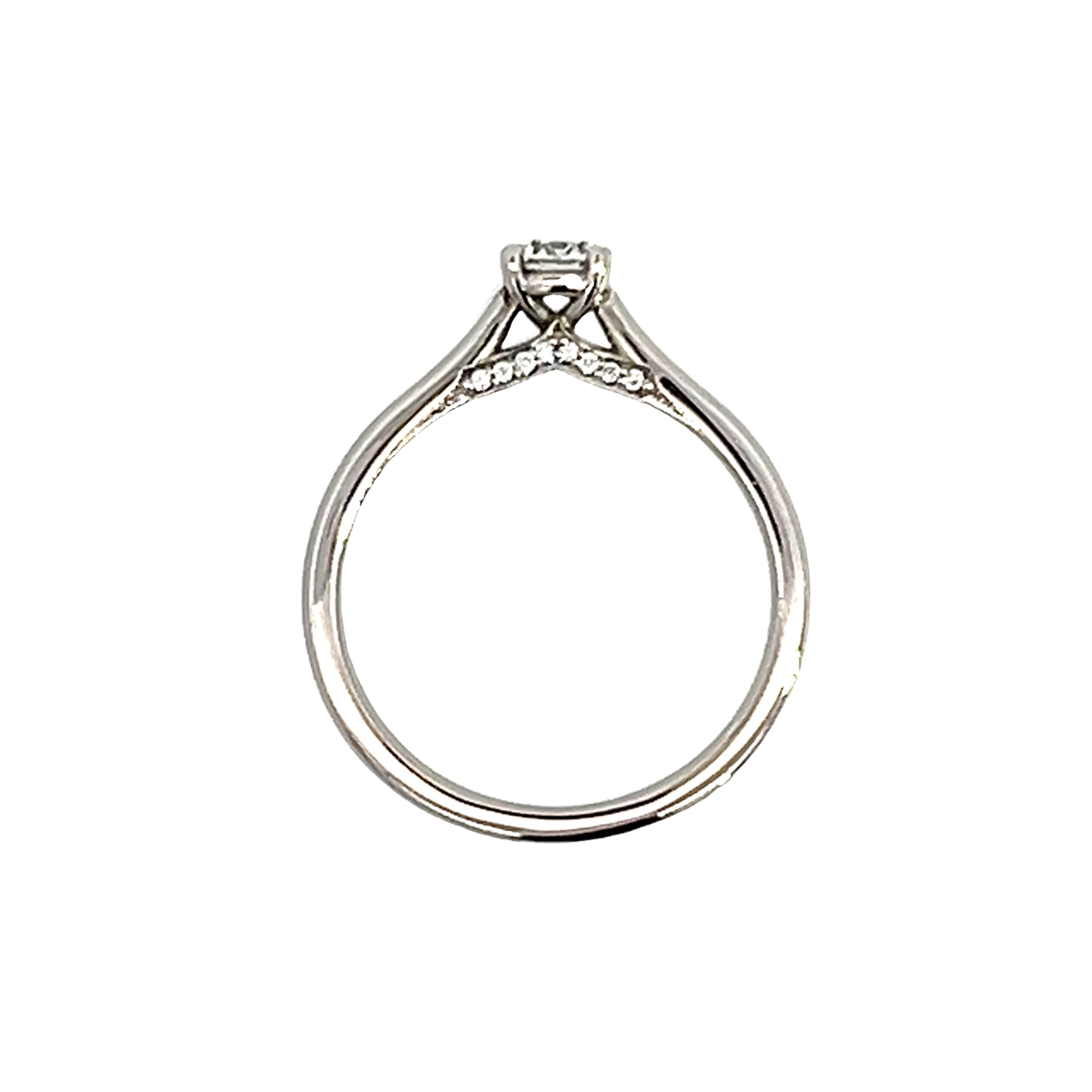 Pavo' - A modern platinum and diamond single stone engagement ring from our 'Constellation' range. Featuring a modern round brilliant natural diamond certified by the GIA as 0.32 carats F colour VS2 clarity in a four claw single gallery setting to a tapered open shoulder 1.85mm court wed fit shank with seven grain set diamonds on each side on a 'V' shaped bridge under the main stone. Finger size M Gross weight 3.90 grams.