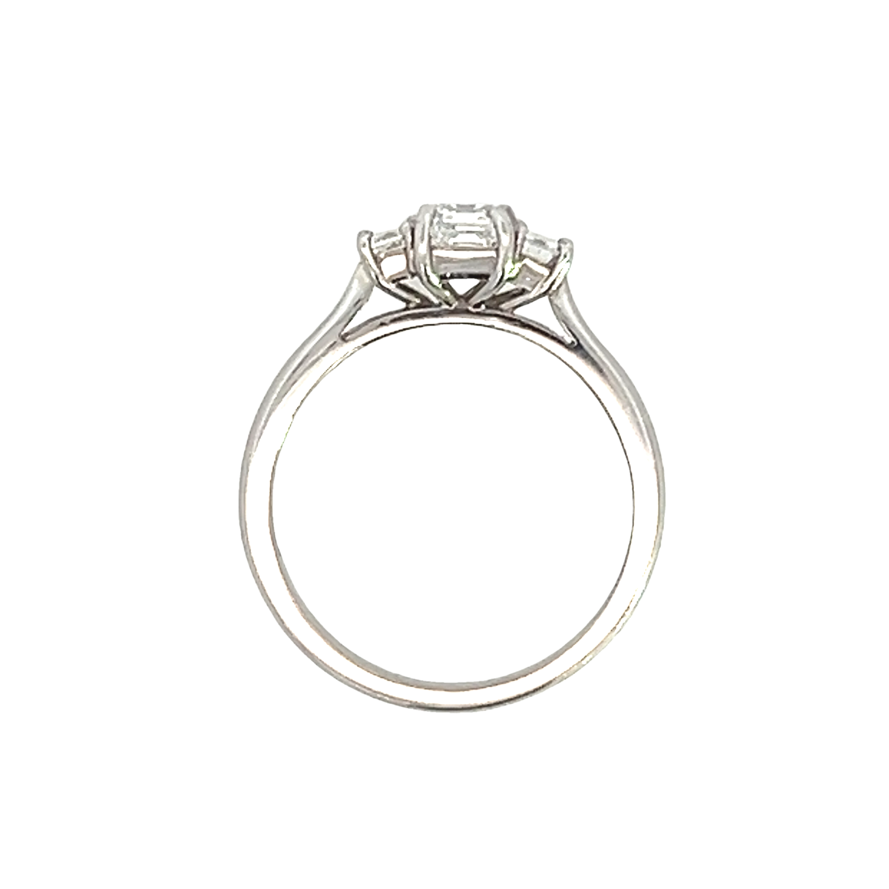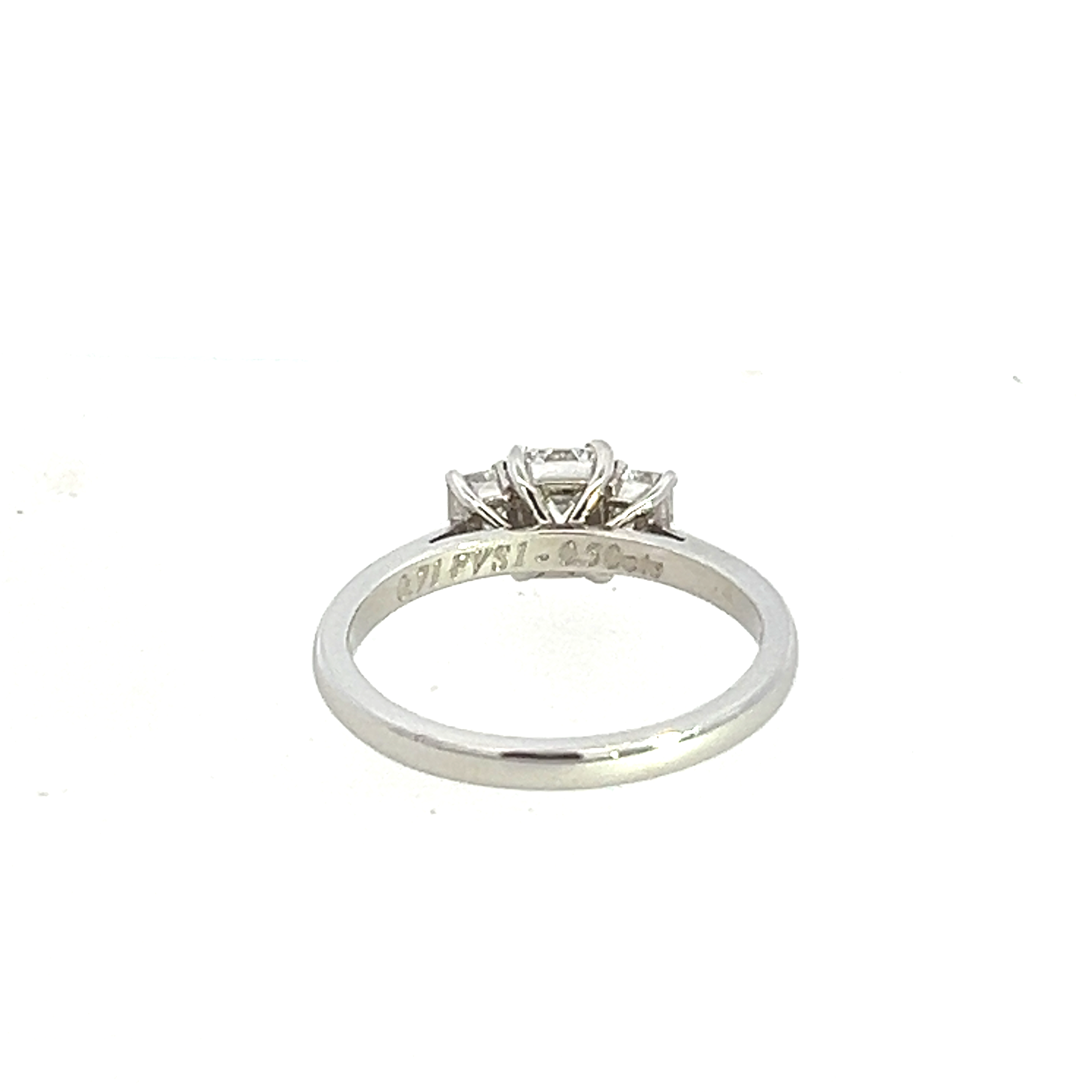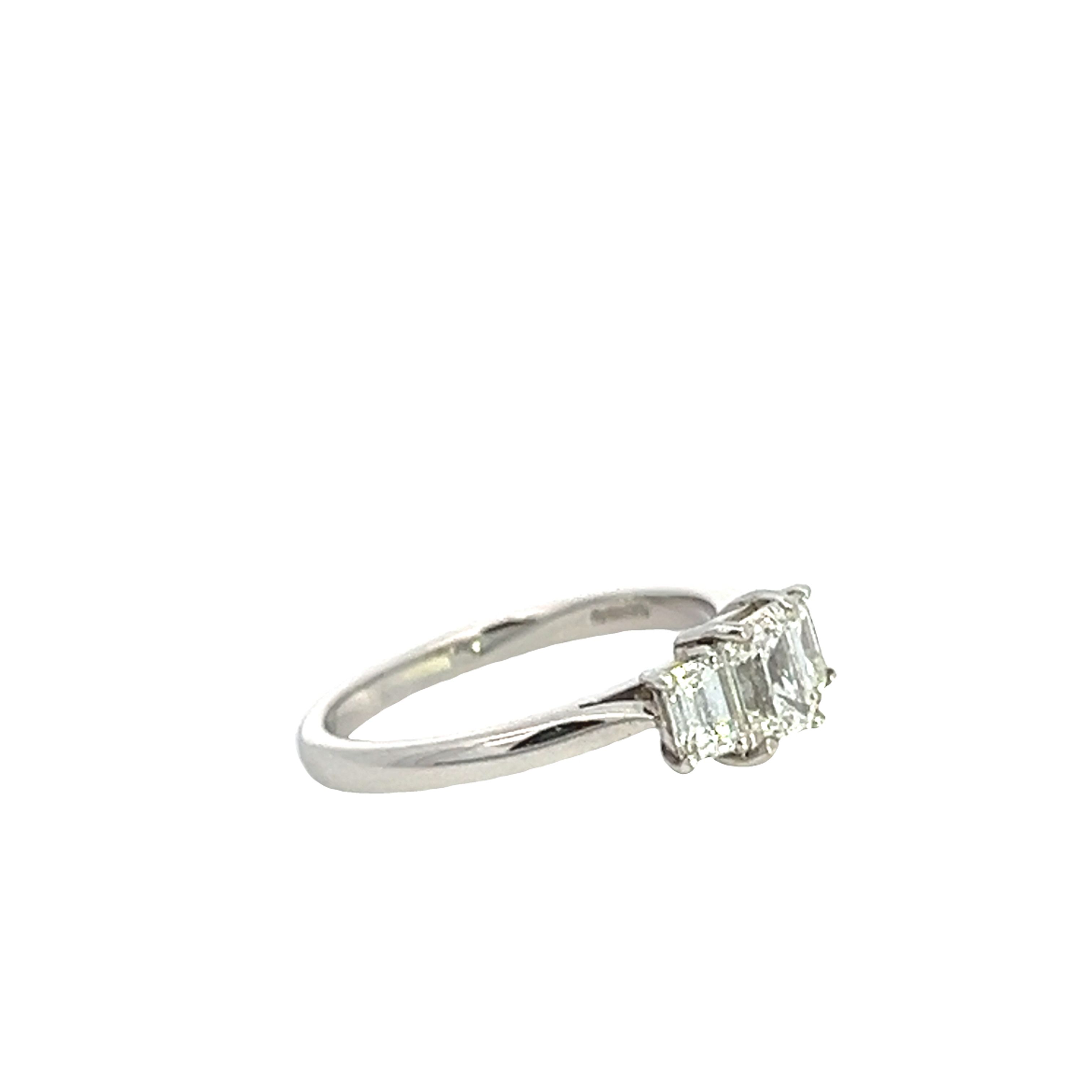 A modern platinum and diamond 3 stone engagement ring. Featuring a centrally set emerald cut diamond certified by the GIA as 0.71 carats F colour VS1 clarity. The side stones are also emerald cuts 0.25 carats each. To a wed fit tapered court shank. Finger size M. Total Diamond weight 1.21 Cts