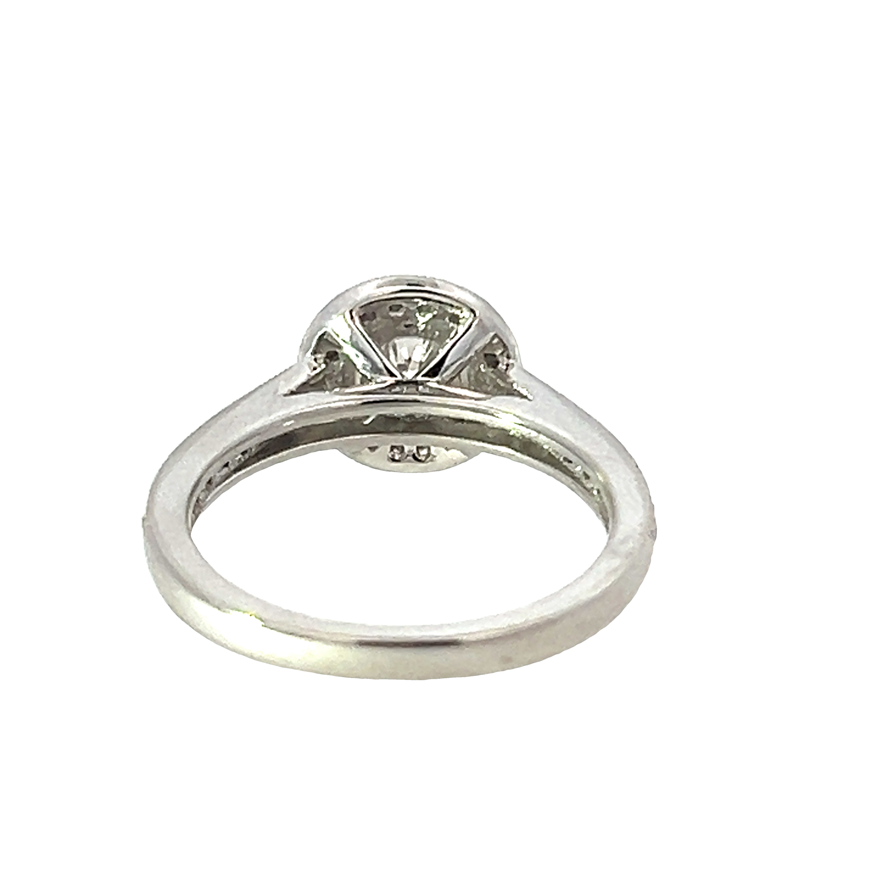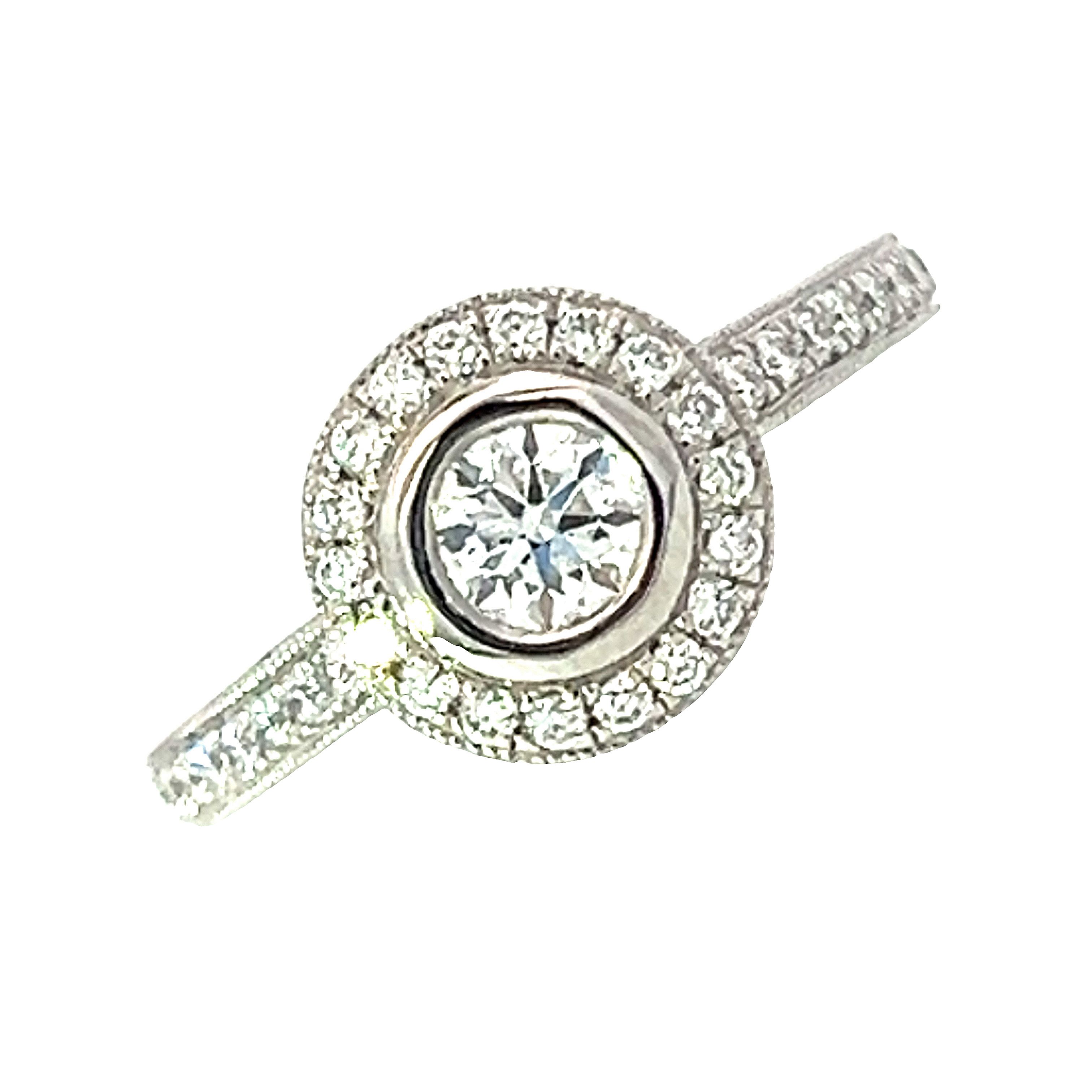 A modern platinum and diamond vintage style halo ring. Featuring a modern round brilliant diamond independently certified by the GIA as F colour VS 2 clarity Ex Ex Ex centrally set in a rub over setting surrounded by a halo of grain set modern round brilliant diamonds with mil grain detail to the edges with similarly set shoulders total additional diamond weight 0.31 carats. To a wed fit parallel flat shank. Finger size M Gross weight 6.04 Grams